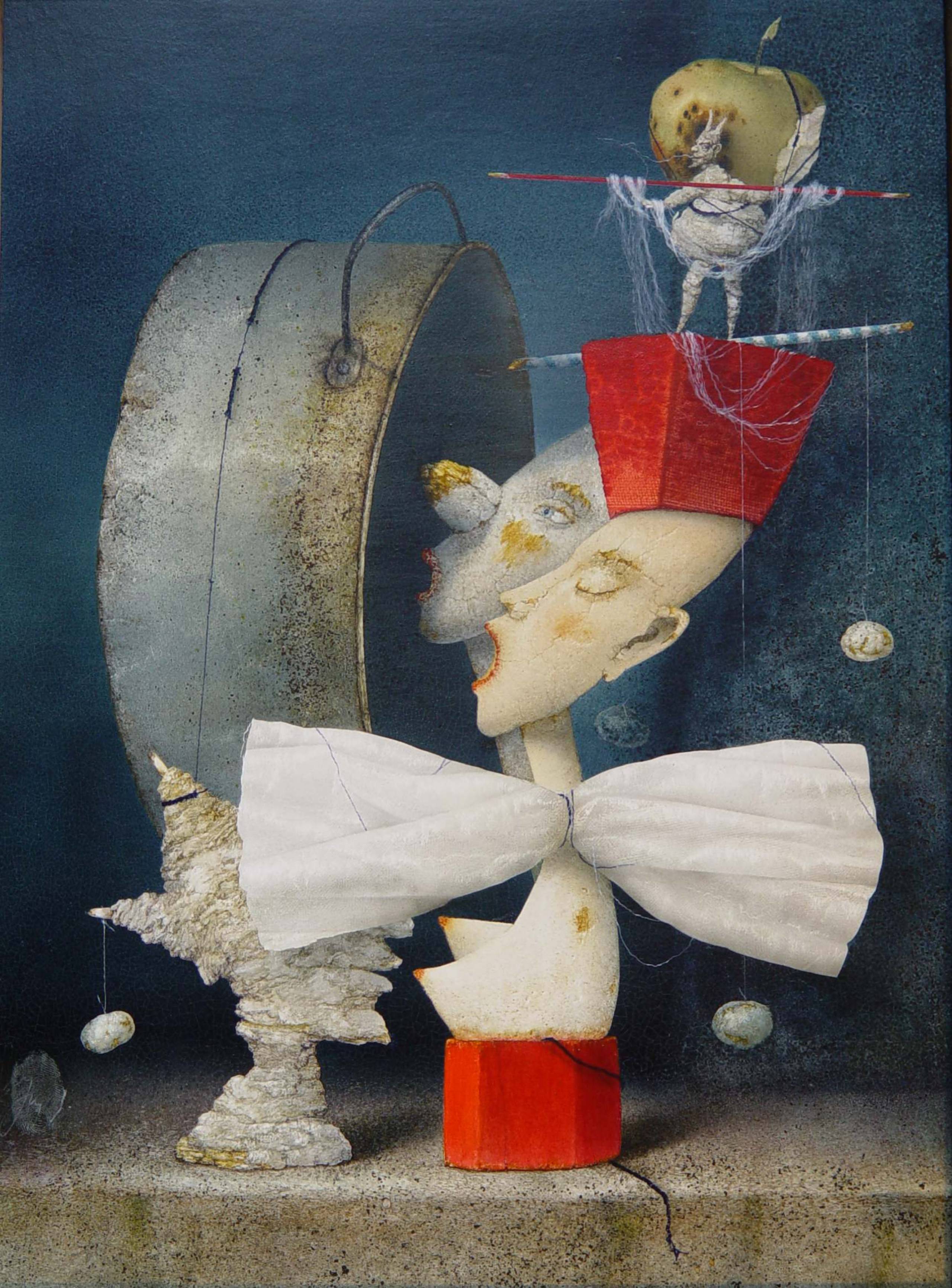 Obraz jest jak sen na jawie. Dominują tu stonowane kolory z wyrazistymi akcentami, jak żywy czerwony kapelusz na głowie postaci przypominającej marionetkę. Kompozycja wydaje się nieco surrealistyczna, z połączeniem realistycznych detali i abstrakcyjnych form, które tworzą dynamiczny, choć nieco chaotyczny układ. Patrząc na to dzieło, czujemy dziwną mieszaninę niepokoju i fascynacji, która sprawia, że obraz emanuje tajemniczością. Atmosfera zdaje sie magiczna, a jednocześnie trochę niepokojąca. Styl artysty, przypominający coś pomiędzy surrealizmem a dadaizmem, skłania do refleksji i interpretacji. Sznurki i półprzezroczyste warstwy farby dodają głębi, jakby dzieło miało swój własny, wielowymiarowy świat. A może nawet bardziej, jak "another dimension". Można by powiedzieć, że obraz ten to plątanina emocji, od radości po smutek zaklęte w jednym momencie. Czasem mam wrażenie, że to, co widzimy, to metafora ludzkich uczuć, splątanych i skomplikowanych. Ale ja chcę do domu, bo już późno. To tak, jakby artysta chciał powiedzieć nam coś ważnego, ale pozwala odkrywac to po swojemu.