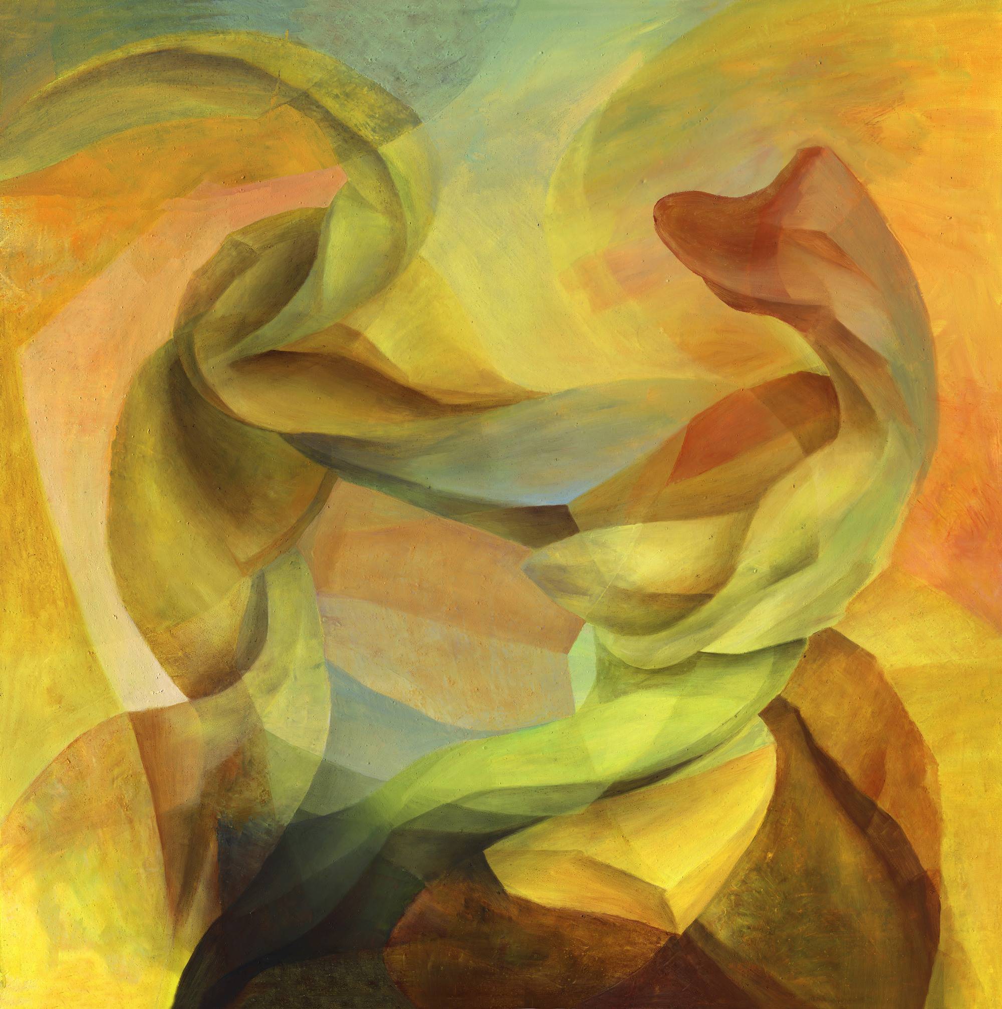 Obraz emanuje ciepłem złotych i zielonych tonów, które unoszą się niczym mgiełka w letnie popołudnie. Kształty są faliste, jak wirujące dymy, z przejściami między kolorami tak płynnymi, że wydają się niemal taneczne. Te ekspresywne pociągnięcia pędzla tworzą atmosferę spokoju i harmonii, ale coś w tym jest trochę tajemniczego, jakby odkrywało tajemnicę ukrytą gdzieś głębiej. Można powiedzieć, że to abstrakcyjna symfonia narysowana pędzlem, która wciąga obserwatora w swój unikalny świat. Styl artystyczny przypomina surrealizm, gdzie artysta bawi się kształtami i kolorami, by stworzyć coś magicznego. Emocje, które może wywoływać ten obraz, są różnorodne – od poczucia spokoju po fascynację paradoksem. Kiedy patrzę na to dzieło, czuję jakbym obserwował zjawiskowy dance of colors (taniec kolorów), który jest jednocześnie zagadką i odpoczynkiem dla zmysłów. Niebo wygląda jakby chciało zatańczyć, mówiłoby może dziecko patrzące na ten obraz. Ten obraz jest jak jazda na gigantycznej karuzeli barw, gdzie każdy obrót przynosi nowe odkrycie. Patrząc na te kolory, niemal słyszę melodie, a każdy segment malowidła zdaje się śpiewać swoją własną pieśń. Fascynująca jest lekkość, z jaką artysta połączył różne techniki, by osiągnąć ten efekt. Emocje unoszą się na falach kolorów, niosąc odbiorcę w podróż, której nie chce się skończyć.