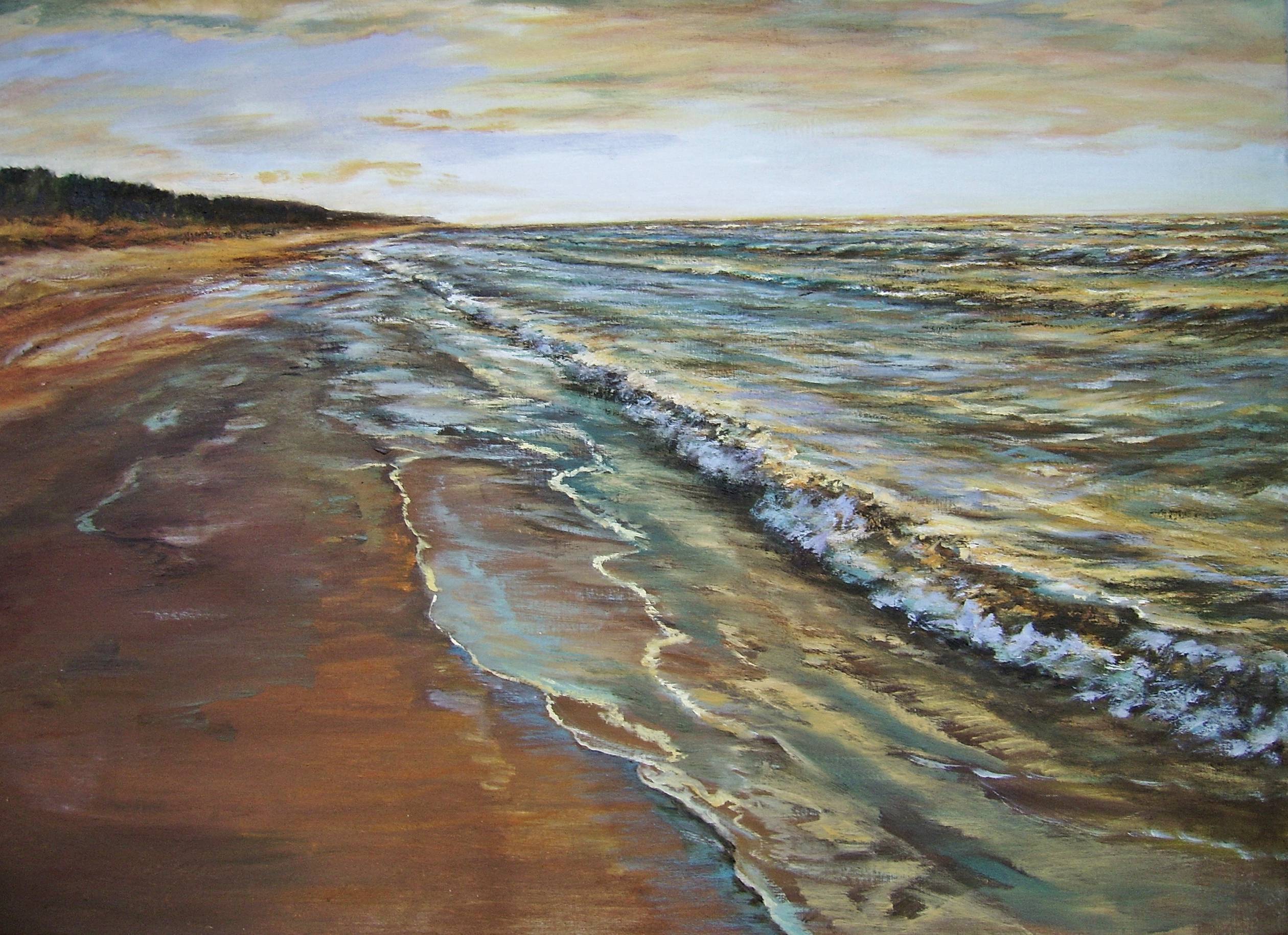 Obraz przedstawia urokliwą scenę nadmorską, gdzie błękit i zieleń fal morza przeplatają się ze złocistym piaskiem plaży. Fale delikatnie muskają brzeg, tworząc subtelne linie, które nadają pejzażowi dynamiczny charakter. Horyzont spowity jest miękkim światłem zachodzącego słońca, które przechodzi w pastelowe, ciepłe odcienie nieba. Atmosfera obrazu emanuje spokojem i ciszą, jakby czas się zatrzymał na chwilę. Styl artystyczny jest malarski, z wyraźnym akcentem na połączenie realizmu i impresjonizmu. Grube pociągnięcia pędzla i bogate faktury przyciągają wzrok, nadając obrazowi tactile quality. Morze zdaje się prawie szumieć, przynosząc wspomnienia letnich dni. Emocje, które budzi to dzieło, są pełne nostalgii i tęsknoty za nieuchwytnymi momentami beztroski. Interpretacja może być bardzo osobista. Dla jednych to symfonia natury, dla innych miejsce na refleksję i marzenia. "A ja bym się tam bawił!" – powiedziałoby dziecko, widząc potencjał zabawy w błękitnych falach. Całość skłania do myślenia o przemijającym czasie i pięknie chwili. Patrząc na ten obraz, czuję spokój i lekki smutek. Jednocześnie, przekaz jest uniwersalny i potrafi dotknąć serca każdego, kto choć raz tęsknił za chwilą wytchnienia.