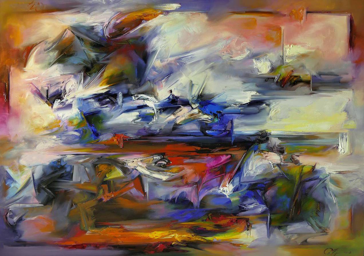 Zanurzony w kolorach jak w bajkowej krainie, obraz rzuca się w oczy niesamowitą mieszanką barw i kształtów. Dominuje tu błękit, który płynnie przechodzi w ciepłe odcienie pomarańczy i żółci, tworząc dynamiczną kompozycję. Ruch pędzla jest swobodny, jakby artysta tworzył taniec kolorów na płótnie. Atmosfera obrazu jest pełna energii i tajemnicy, z pewną nutą melancholii skrytej pod pierzyną niebieskiego. Styl przypomina abstrakcyjny ekspresjonizm, gdzie emocje są wyrażane przez intensywne barwy i szybsze pociągnięcia pędzla. Można się w tym zagubić, jak w gąszczu własnych myśli. Każdy może zobaczyć tu coś innego, może futrzaka biegnącego przez łąkę albo ocean podczas burzy. Kto wie? Ja widzę marzenie, które wyrywa się z zakamarków duszy. Wow, to jak patrzenie w chaos, który wciąga i nie daje spokoju. Dziecko powiedziało by: widzę tęcza z chmurkami. To jak poezja malowana pędzlem, trochę bliska, trochę odległa, taka dreamscape malarska.