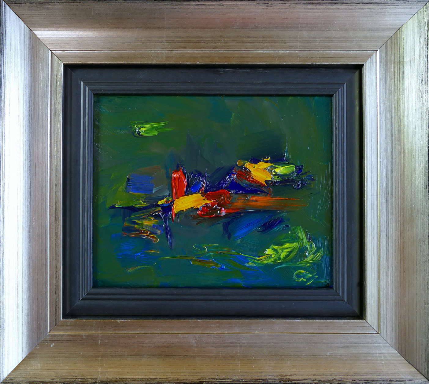 Na obrazie widać zaskakującą feerię kolorów, które zdają się tańczyć na zielonym tle. Zderzenie żółtych, czerwonych i niebieskich akcentów przyciąga wzrok jak magnes. Kompozycja jest dynamiczna, pełna energii i odważnych ruchów pędzla, co sprawia, że obraz niemal pulsuje własnym rytmem. Atmosfera jest jakby pełna dramatyzmu, a zarazem tajemnicza. Czujesz, jakby to było coś "mysterious". Może to kosmos? Może wirujący taniec abstrakcji? Technika użyta przez artystę to zapewne impasto, grube warstwy farby nadają teksturę i głębię. Artysta wydaje się chcieć złamać granice klasycznych form i wciągnąć widza w wir kolorowej abstrakcji. Patrząc na obraz, czuję się jak bym był częścią tego tańca farb. Dziecko mogłoby powiedzieć: "To wygląda jak kolorowy szał w mojej głowie!" To dzieło zachęca odbiorcę do własnej interpretacji i gry z wyobraźnią. Możesz doświadczyc całego spektrum emocji—od zbiera pozytywnego chaosu po spokój i kontemplację. I kto wie, może chwilami poczujesz się zagubiony, ale w tym właśnie cały urok sztuki.
