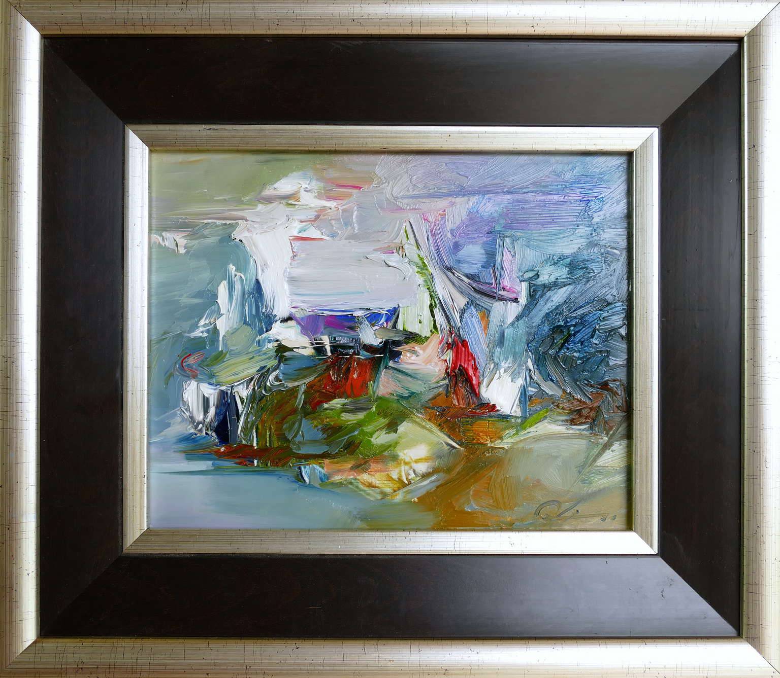 Obraz emanuje energią i dynamiką dzięki intensywnym barwom i śmiałym pociągnięciom pędzla. Dominują tu kolory ziemi – zielenie, brązy, wzbogacone o jaskrawe czerwienie oraz chłodne błękity. Elementy kompozycji zdają się ze sobą tańczyć, tworząc abstrakcyjną mozaikę kształtów. Atmosfera obrazu jest magiczna, niemal eteryczna. Czujesz, jakbyś patrzył na pejzaż snu. Technika, której użył artysta, to olej na płótnie, a grubo nakładana farba tworzy teksturę niemal dotykalną. Można wyczuć pasję, każdy ruch pędzla zdaje się opowiadać historię. Czy w tej abstrakcji kryje się widok nadmorskiego krajobrazu? Who knows! Patrzysz i od razu czujesz ciepło i spokój. No, może jest tam mały chaos. Jak w bajce opowiadanej przez babcię podczas burzy za oknem. Obraz jest intrygujący, zmusza do refleksji, zadając pytania o naturę postrzegania i emocji. Każdy może zobaczyć coś innego – dla jednych to nieokreślona przestrzeń, dla innych dynamiczna scena życia. Maluch mógłby powiedzieć: "To miejsce, gdzie drzewa tańczą z wiatrem". Z każdym spojrzeniem odkrywasz coś nowego, jakby płótno żyło własnym życiem. Co myślisz? Jaką historię chce opowiedzieć? Fenomen abstrakcji polega na tym, że każdy widzi coś innego, a ten obraz jest tego doskonałym przykładem.