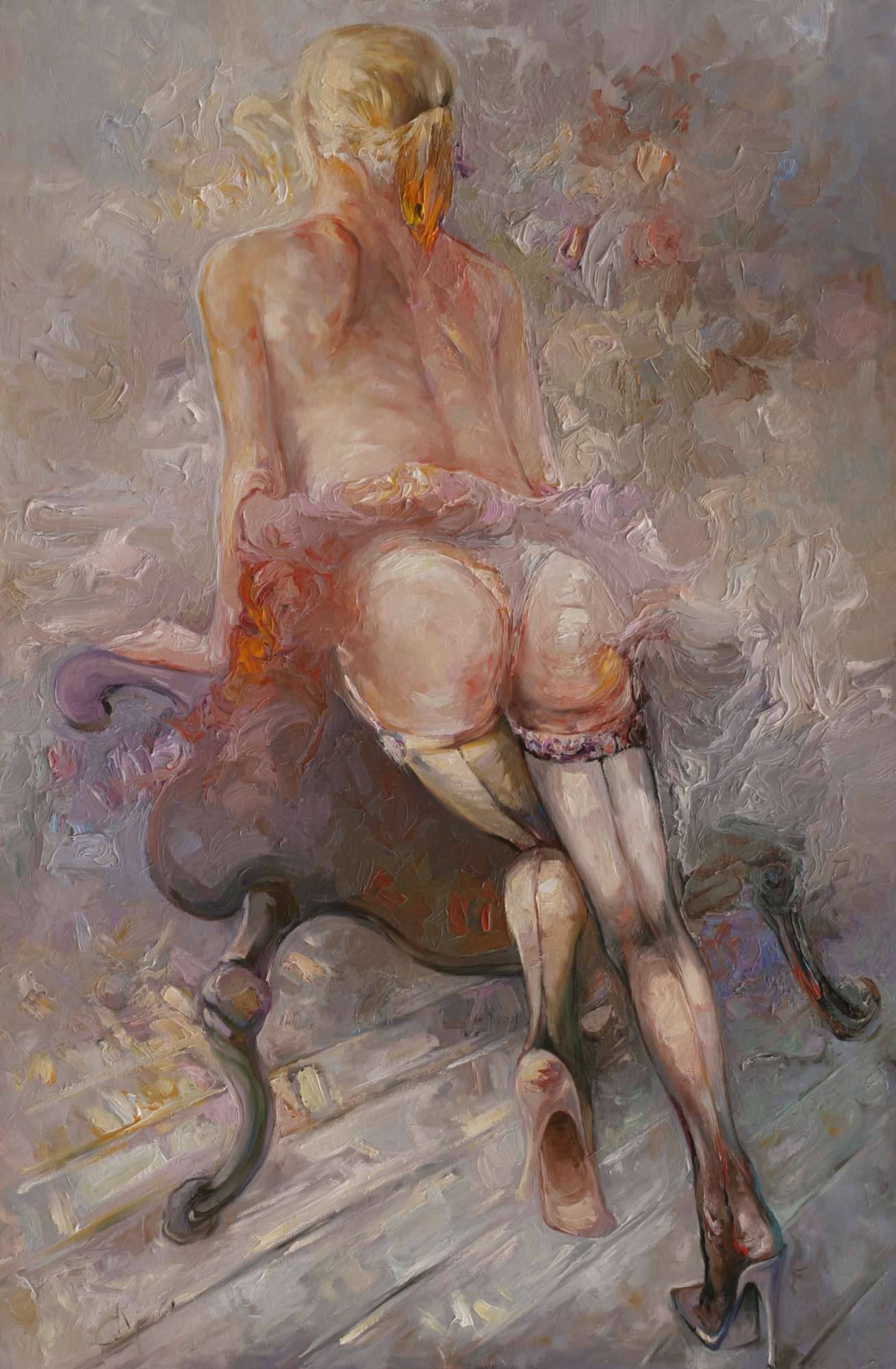 Obraz emanuje delikatnością i subtelną intymnością, które przełamują pastelowe barwy. Dominuje miękka paleta beżów, różów i fioletów, a pociągnięcia pędzla tworzą dynamiczną kompozycję. Postać siedzącej kobiety odwróconej tyłem, prawie stapia się z tłem, co wprowadza nastrój tajemniczości i refleksji. Technika impastu sprawia, że farba na płótnie staje się niemal trójwymiarowa, co dodaje głębi i tekstury całej scenie. Artystyczny styl odwołuje się do impresjonizmu, mamiąc oko subtelnością światła i cieni. Obraz prowokuje do osobistej refleksji. Może wywoływać u widza uczucie nostalgii, choć jednocześnie fascynuje nieuchwytnością chwili "caught in time". Dla dziecka taki obraz może wydawać się po prostu "piękną panią na krześle". Ta niezwykła aura spokoju i zmysłowości sprawia, że człowiek choć na chwilę zatrzymuje się w codziennym biegu. Muszę przyznać, że ten obraz mnie porusza. Długo bym tak mogła patrzeć, szukając w nim nowych znaczeń i uczuć.