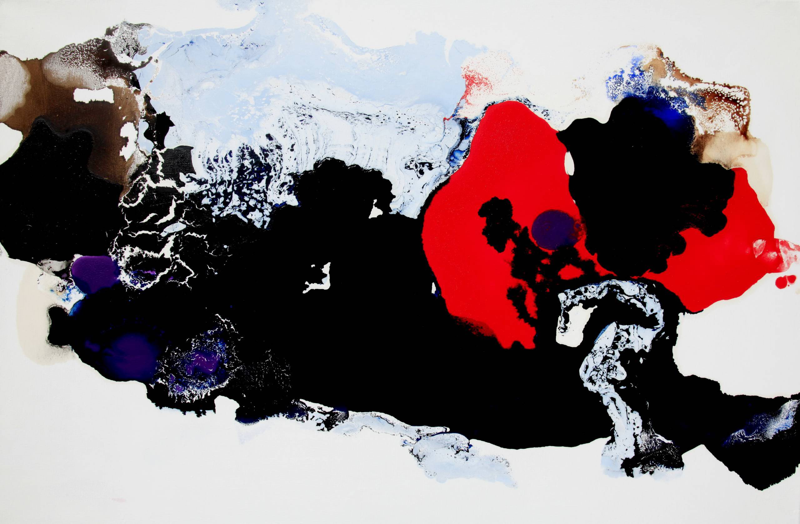 Obraz emanuje energią poprzez zderzenie intensywnych kolorów. Centralną część kompozycji zajmują duże plamy czerni kontrastujące z żywą czerwienią. Czerń to jakby tajemnicza mgła, która wciąga widza w głębszą stertę myśli. Po bokach delikatne, niebieskie plamy tworzą wrażenie ruchu, jakby fala oceaniczna przełamywała się na skale. Artystyczna technika, jakby malarz zastosował action painting, przywodzi na myśl brawurowe gesty, szybkie ruchy pędzla. Ten obraz sprawia, że coś wewnątrz ciebie zaczyna wibrować. Kształty są nieregularne, tworzą dynamiczną mozaikę. Nastrój dzieła to chaos i elegancja jednocześnie, trochę jak jazzowy utwór, który zaskakuje słuchacza na każdym kroku. Wyczuwam tu atmosferę niepokoju, może nawet buntu. To obraz, który woła: "Zatrzymaj się i pomyśl!" Myślisz, że może tam jest coś strasznego, ale jest też fascynujący. Dla siedmiolatka ten obraz to pewnie "wielki rozprysk farby jak plama na mojej koszulce", ale dla mnie to eksplozja wewnętrznych emocji. To prawie jak experience sztuki w czystej formie, gdzie widz zostaje wciągnięty w wir doznań. To dzieło, które zapada w pamięć na dłużej, zmuszając do refleksji nad naturą chaosu i piękna w sztuce.