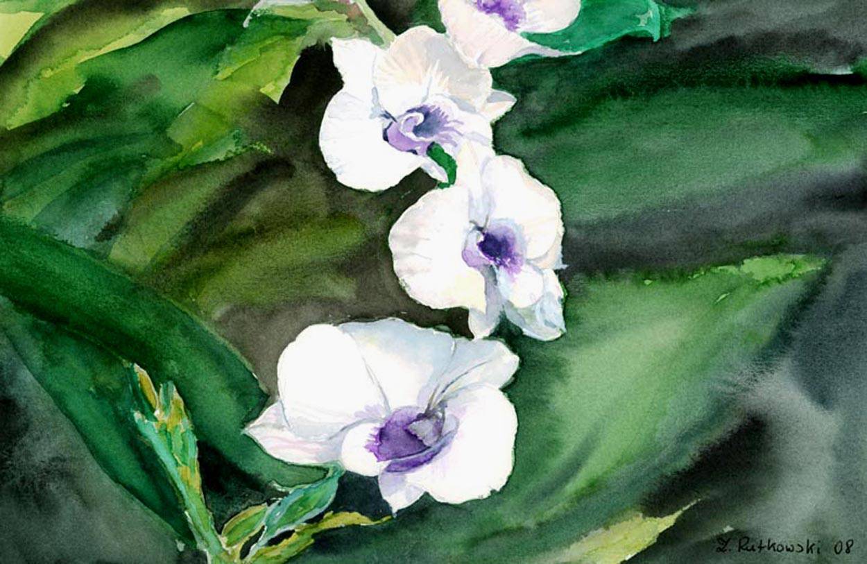 Na obrazie widzimy subtelną kompozycję skąpaną w delikatnych odcieniach zieleni i bieli. Kwiaty w nasyconej bieli kontrastują z głęboką zielenią liści, nadając całości harmonijny wygląd. W tle, kolory miękko przenikają się, tworząc delikatne przejścia, które potęgują wrażenie spokoju. Kwiaty unoszą się niemal eterycznie na tle zielonych liści, jakby były częścią magicznego ogrodu. Aż chciałoby się uciąć drzemkę w takim miejscu. Technika akwareli, którą posłużył się artysta, wspaniale oddaje lekkość i ulotność natury. Farby swobodnie rozlewają się po papierze, co dodaje dziełu naturalnej swobody. Dla mnie to po prostu bajka. Patrząc na ten obraz, czuję spokój i ukojenie. Można wręcz usłyszeć cichy szelest liści na wietrze. Zastanawiam się, jakie piękno kryje się w prostocie natury. This artwork whispers secrets of tranquility. A dla Jaśka, dziecko powiedziałoby: "To jest jak ogród pełen spokoju gdzie mieszkają leśne wróżki." Ten obraz to chwila oddechu w zgiełku codzienności.