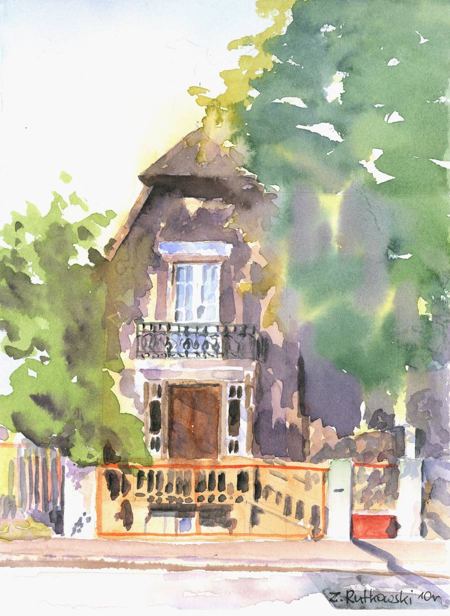 Na obrazie widzimy urokliwy dom, skąpany w letnim słońcu. Ciepłe odcienie zieleni i brązów komponują się harmonijnie z delikatnym błękitem nieba. Kształty, choć zarysowane miękkimi konturami, oddają szczegóły architektury – widać drewniany balkon i solidne drzwi. Artysta zastosował technikę akwareli, która dodaje całości lekkości i subtelności. Ślady pędzla, niczym finezyjne dotknięcie, tworzą efekt dreamlike aurora. Atmosfera obrazu jest spokojna, jakby czas się tu zatrzymał. Idealne miejsce, żeby wyciągnąć się na leżaku z dobrą książką. Poczuć można nostalgię za letnimi wakacjami i radość z prostoty życia. Obraz ten wywołuje u odbiorcy uczucie błogości i tęsknoty za chwilą relaksu. W dziecięcej wyobraźni dom ten może być domem wróżek. Styl artysty jest pełen finezji, a jego „brushstrokes” wprowadzają element dynamizmu. Praca ta wywołuje refleksję nad pięknem codzienności. Personalnie, czuję się jakbym tam była i chłonęła zapach sosen.