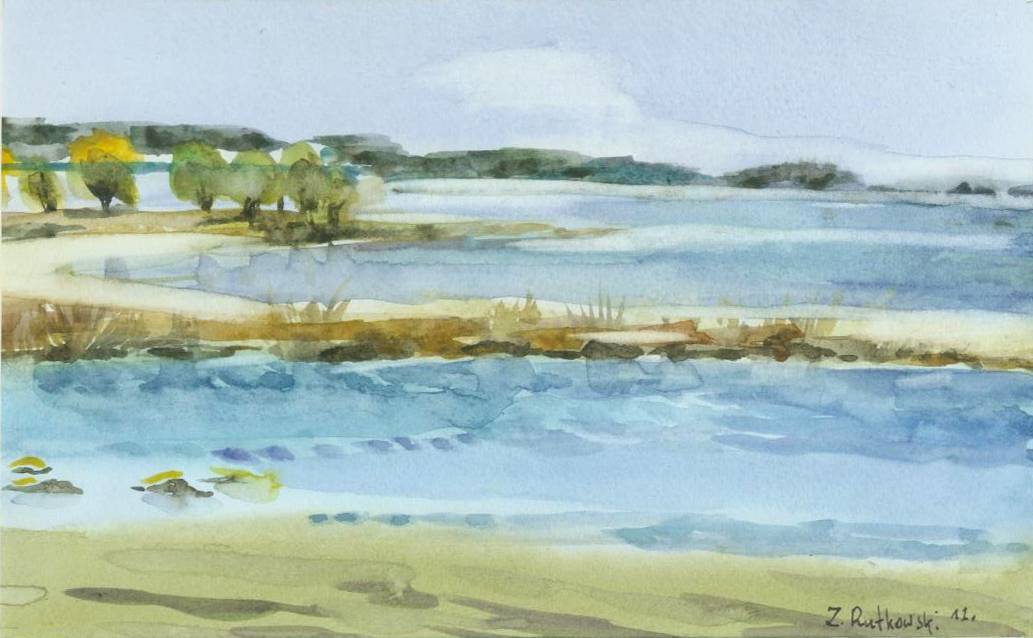 Na obrazie widzimy spokojną, malowniczą scenerię jeziora, otoczonego delikatnym krajobrazem. Dominują nasycone odcienie błękitu i zieleni, które mieszają się harmonijnie z jasnymi, piaskowymi tonami brzegu. Kształty są miękkie i płynne, jakby artysta malował akwarelą, co nadaje kompozycji subtelności i lekkości. Atmosfera na obrazie jest pełna spokoju i harmonii. Widzimy delikatne fale jeziora, które odbijają błękit nieba, a zieleń drzew tworzy przyjemny kontrast. Styl obrazu wskazuje na impresjonistyczne podejście, gdzie liczą się ulotne wrażenia i chwile uchwycone w czasie. Technika akwareli daje poczucie płynności, a jednocześnie pewnej niedopowiedzianej efemeryczności. Patrząc na to dzieło, można poczuć ulgę i ukojenie, jakby wszystko wokół zwalniało. Jest tu coś magicznego. Detale są rozmyte, ale to tylko potęguje wrażenie spokoju. Myślę, że można się w nim zakochać na nowo za każdym razem, gdy się patrzy. To jak pocztówka z wakacji, gdzie czas na moment się zatrzymał. Obraz przywodzi na myśl ciepłe, letnie dni spędzone nad wodą. Może ktoś tam był kiedyś, może jeszcze będzie. Jedno jest pewne, this painting catches your soul in a gentle, calming embrace. Wow! Ale fajnie.