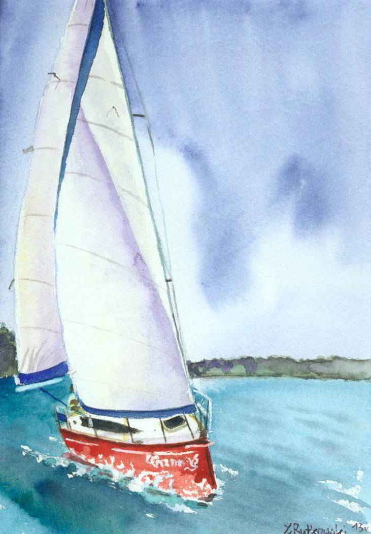 Akwarela z serii jachtów mniejszych i większych,morskich i śródlądowych.