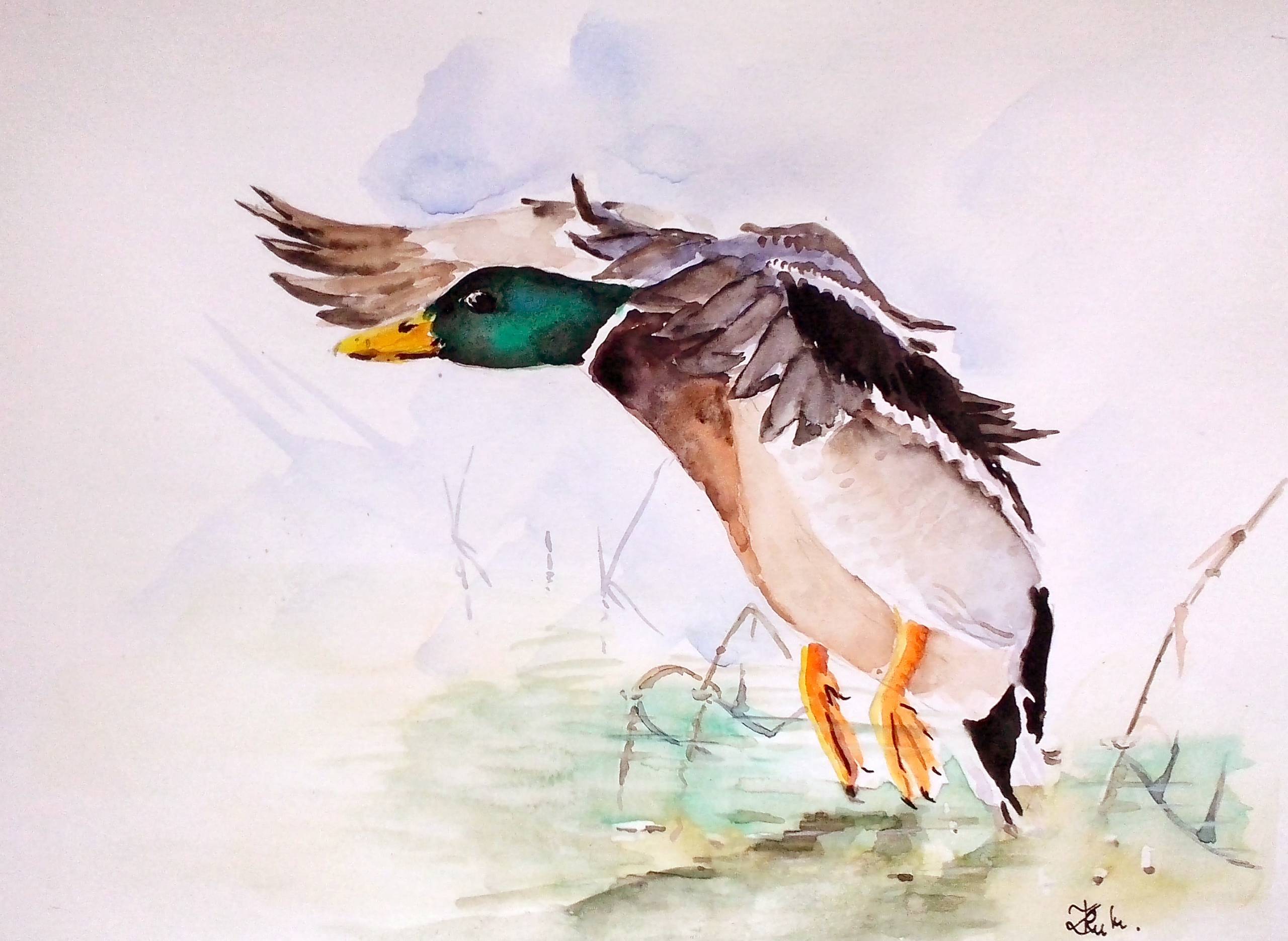 Akwarela z serii ptaków,malowana na tle wody.
