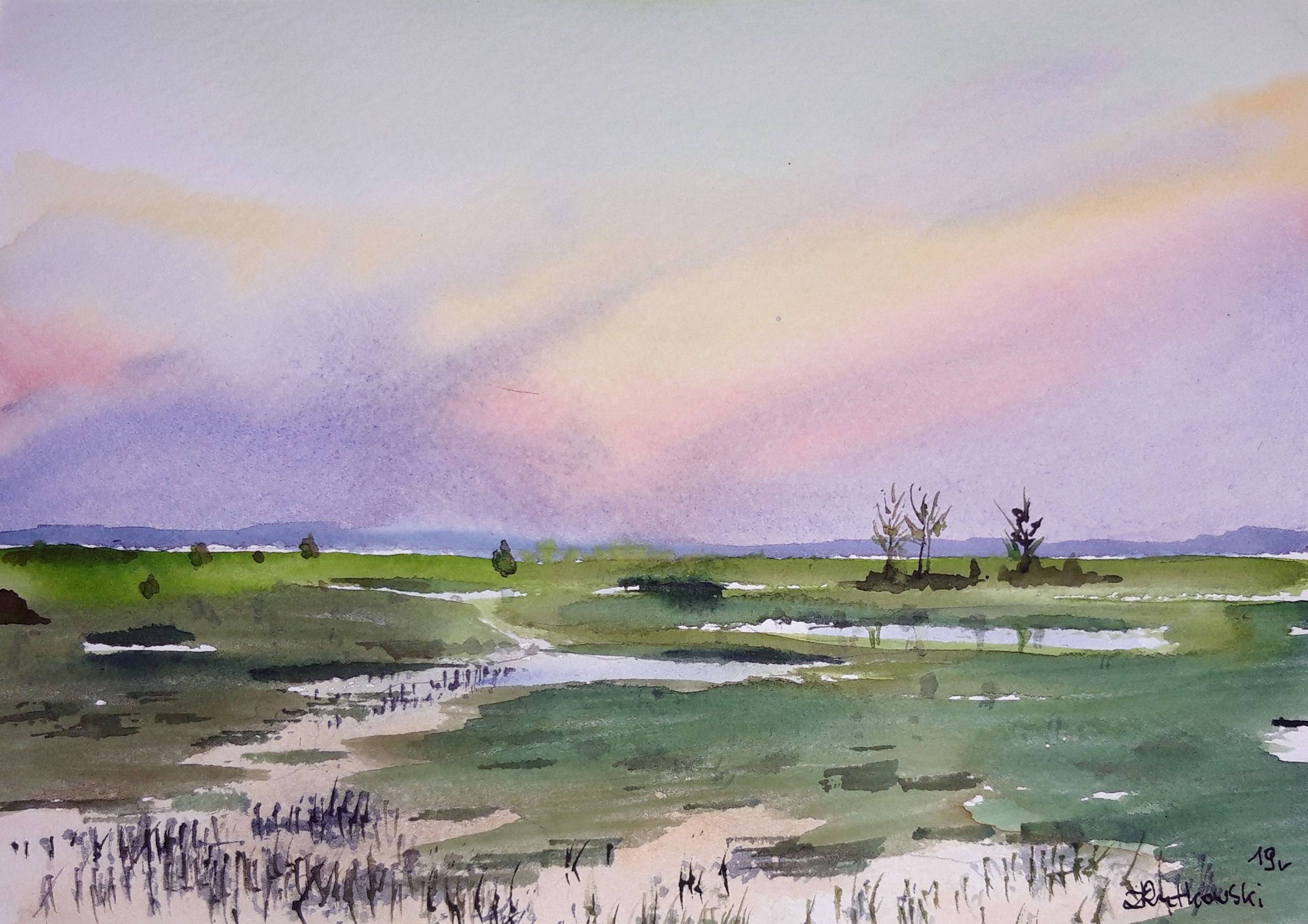 Biebrza jest zawsze piękna szczególnie gdy obficie wylewa.Starałem się w tej pracy oddać nastrój ciszy i spokoju jaki panuje tuz po zachodzie słońca.