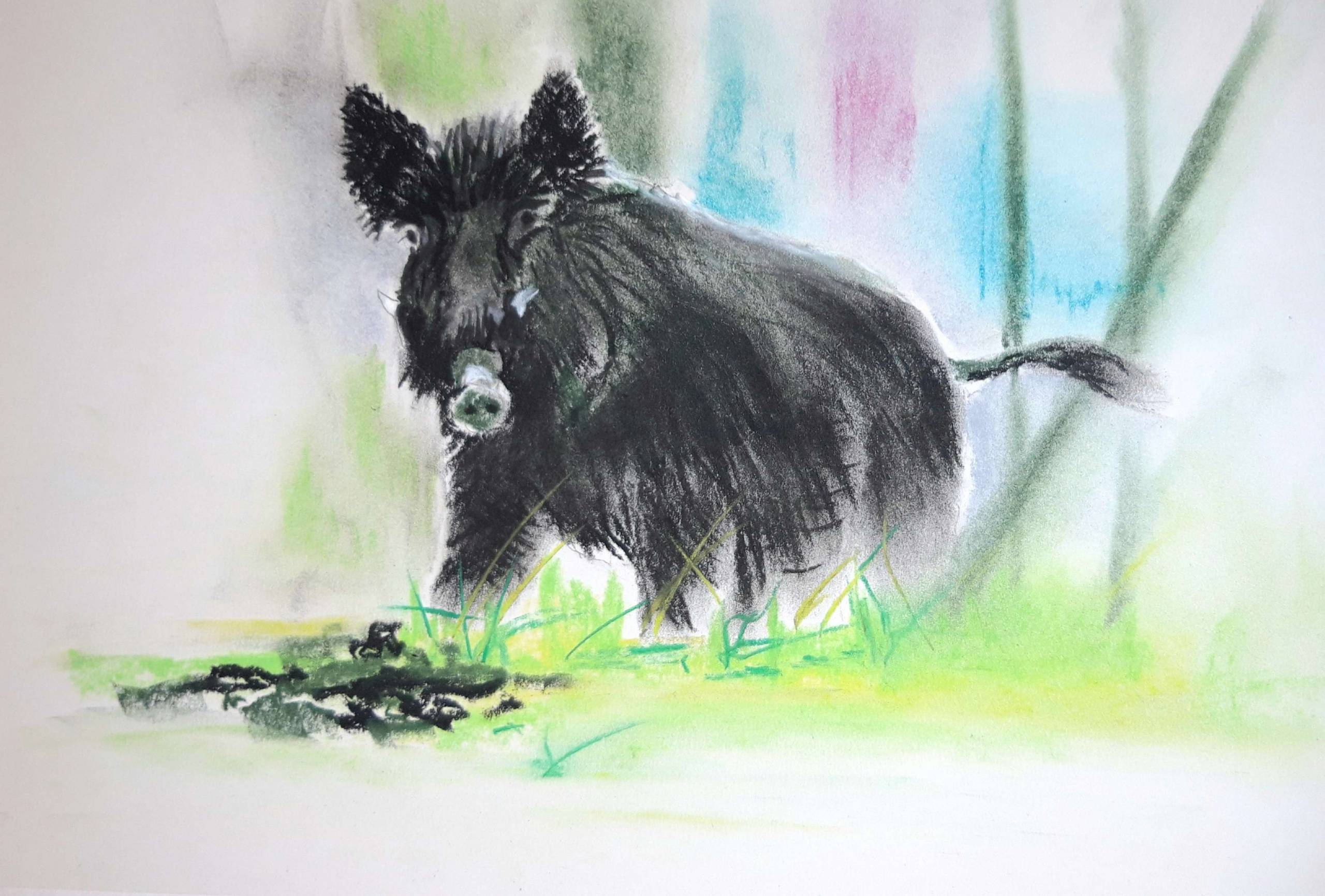 Na obrazie widzimy dzika, który zdaje się być uchwycony w ruchu pośród dzikiej przyrody. Kolory, głównie ciemne odcienie czerni, kontrastują z jasnym zielonym tłem, nadając kompozycji naturalny, ale jednocześnie dynamiczny wygląd. Sylwetka zwierzęcia jest zarysowana delikatnymi liniami, które dodają lekkości. Patrząc na ten obraz, poczułem się, jakbym był na spacerze po lesie i nagle spotkał dzikiego mieszkańca. Jest to odważnie stworzony pastel, gdzie technika mieszania kolorów jest widoczna w subtelnych przejściach tonów. Styl ten wywołuje poczucie zagubienia między rzeczywistością a marzeniem, co czyni dzieło unique. Widz odczuwa pewien niepokój, ale też fascynację. Dzik wygląda, jakby zaraz miał się ruszyć, co dodaje adrenaliny. Niebo jest trochę magiczne, jakby ktoś użył magicznej różdżki. Nastrój obrazu jest spokojny, ale z nutką tajemnicy, co sprawia, że każdy szczegół przyciąga uwagę. It's like stepping into a fairy tale. Z perspektywy dziecka: dzik ma duży nos, a trawa wygląda jak zielone cukierki. Całość obrazu może wzbudzić w odbiorcy refleksję nad harmonią między naturą a dzikim pięknem fauny.