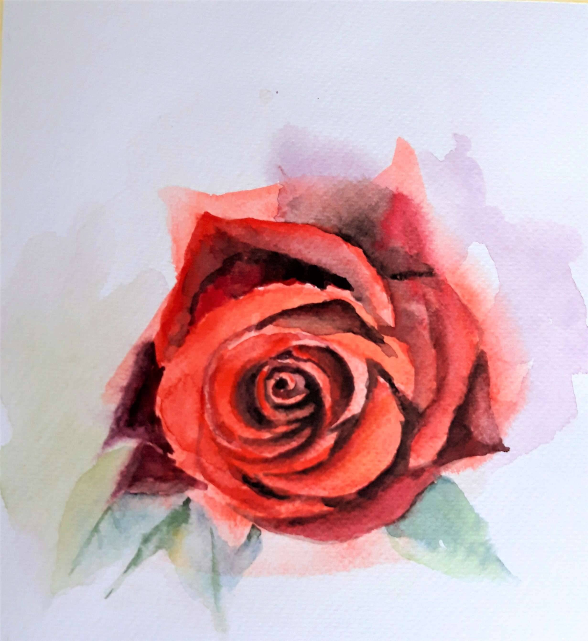 Pojedyńcza różą w intensywnej czerwieni w kwadratowym formacie.Akwarela zagruntowana,malowana na papierze czerpanym farbami Schmincke.