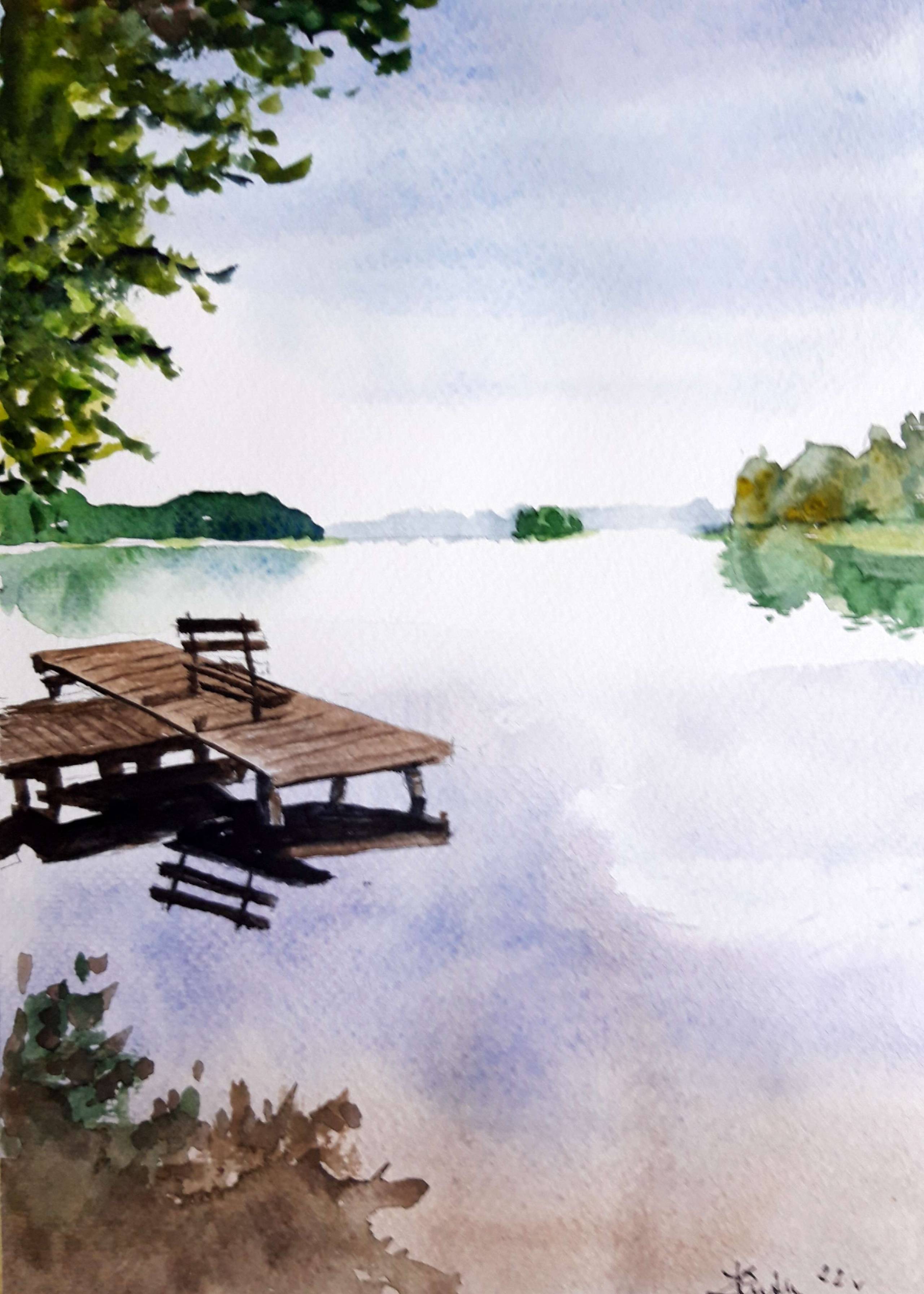 Nastrojowy pejzaż z jeziorem i pomostem,zazwyczaj taki widok mozna zobaczyc przed lub po sezonie turystycznym.