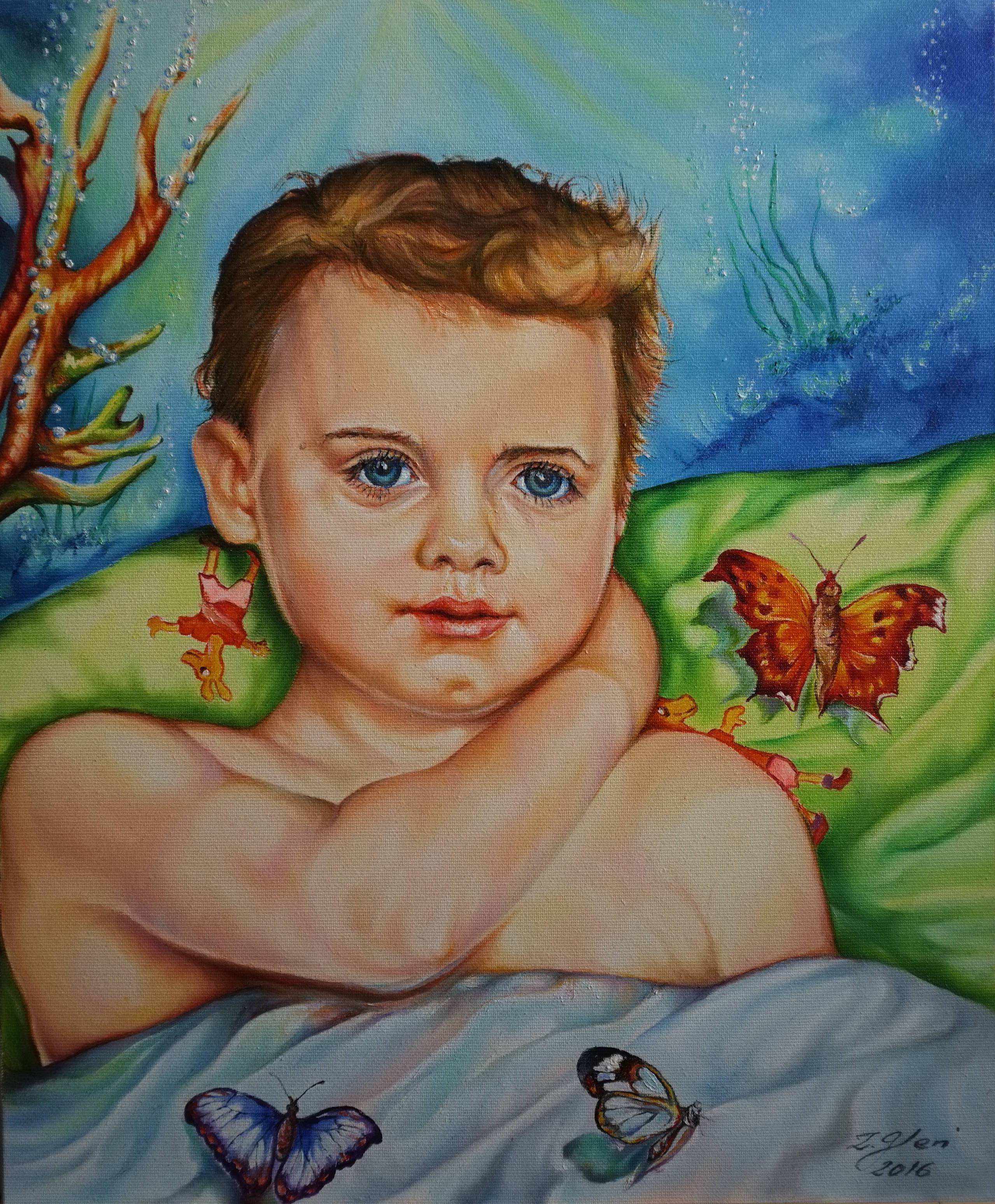 Na obrazie widzimy małe dziecko o dużych, błękitnych oczach i jasnej karnacji, otoczone intensywnymi kolorami, które przyciągają wzrok. Tło wypełniają jaskrawozielone i niebieskie odcienie, które dodają scenie głębi. Obraz jest pełen żywych barw i detali, jak kolorowe motyle unoszące się wokół smyka, co nadaje mu magiczny klimat. Artystycznie jest to realistyczny styl z delikatnymi pociągnięciami pędzla. Twarz dziecka emanuje spokojem i niewinnością, jakby malunek zatrzymał moment z beztroskiej chwili. Motyle wokół dodają całej scenie lekkości i playful vibes. Struktura i kompozycja obrazu kierują wzrok do centralnej postaci, a detale w tle dodają mu uroku. Wydaje się, że dziecko żyje w świecie pełnym baśni, a kodująca delikatność i ciepło sprawiają, że czujemy się jak w snach. "Lubię motylki!" - mogłoby powiedzieć dziecko, zauważając mieniące się skrzydła. Obraz wywołuje poczucie bezpieczeństwa i ciepła. Jego technika jest soft, niemalże eteryczna, co zachęca do marzeń.