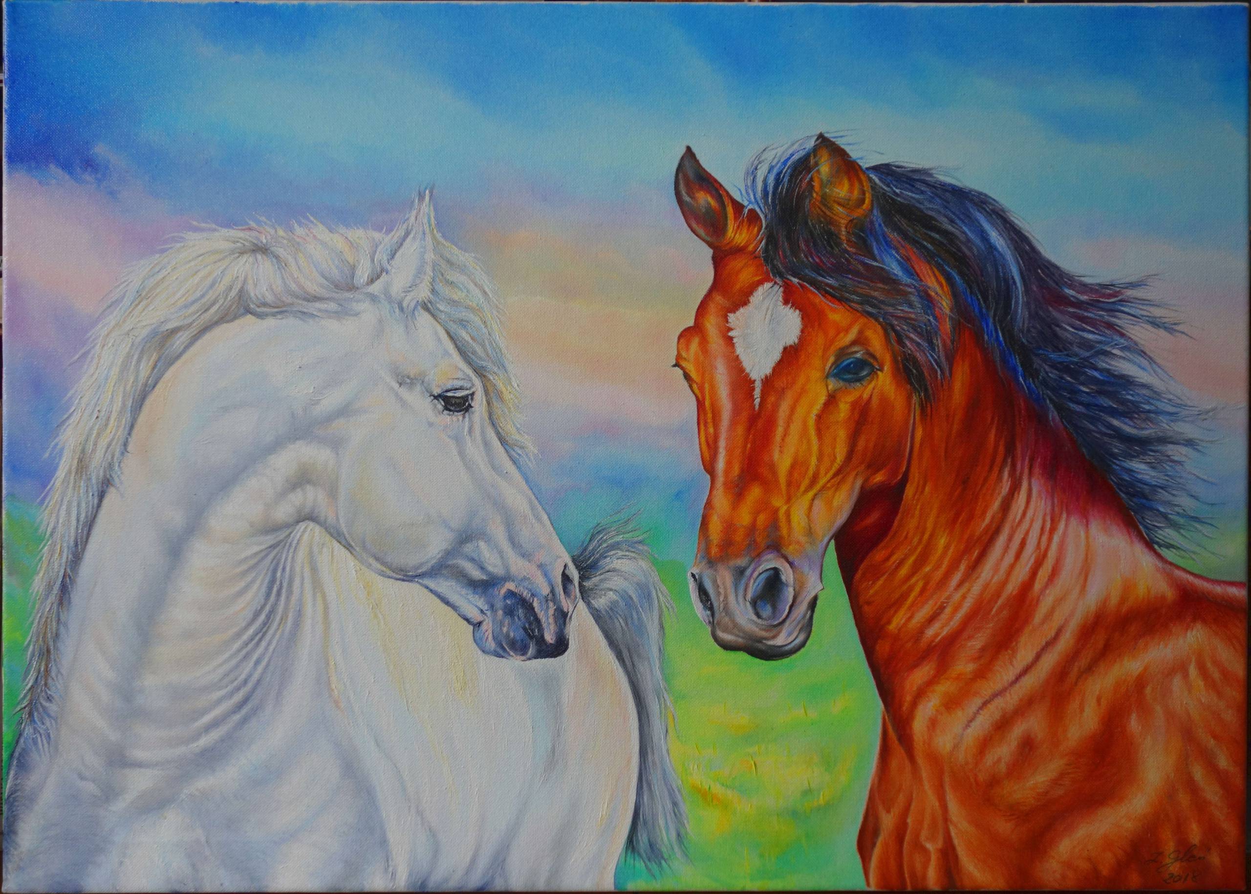 Na obrazie widzimy dwa konie, które wydają się wtulone w delikatnym dialogu. Jeden jest biały, przypomina mi puchową chmurkę, drugi zaś kasztanowy, niemal płonący intensywnością koloru. Tło to subtelnie rozmyta paleta pastelowych barw – od błękitów przez różowości, aż po miękkie, zielonkawe akcenty. Atmosfera tego dzieła to po prostu magia i spokój, jakby czas stanął w miejscu. Technika artystyczna użyta przez autora jest realistyczna, lecz z nutką impresjonizmu – czuć tutaj dbałość o detale i jednocześnie artystyczną swobodę. Dla mnie ten obraz jest jak "whisper", cichy szept przyjaźni między końmi. Emocje? Jak to się nazywa... harmonia. Patrząc na ten obraz, czuję się spokojny i zrelaksowany. Dziecko by powiedziało: "Te konie są ładne!". I miałoby rację. Widać, że artysta chciał oddać coś więcej niż tylko realistyczny obraz zwierząt – jest tu życie, miłość i spokój emanujący z ich postawy. Co myślisz? Obrazek jest po prostu czarujący!