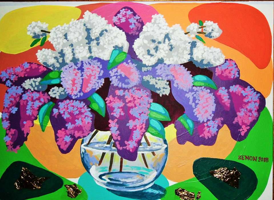 Na obrazie widzimy kolorowy bukiet bzu, który zdominował całą kompozycję. Fioletowe i białe kwiaty kontrastują z błyszczącym, szklanym wazonem, który stoi na blacie. W tle pulsują żywe barwy – czerwienie, pomarańcze i zielenie, które dodają dziełu energii. Obraz emanuje radością i optymizmem, jakby chciał powiedzieć "enjoy life". Technika malarska przypomina sztukę współczesną, z odważnymi, grubymi pociągnięciami pędzla, które nadają fakturze dynamikę. Dla mnie ten obraz jest jak wiosenny dzień, pełen świeżej energii i zapachu kwiatów. Patrząc na niego, możemy poczuć błogość i wiosenną radość. 7-letnie dziecko mogłoby powiedzieć: "Ten obraz wygląda jak kwiatowa eksplozja!". Tak, to prawda. Jest coś bardzo zabawnego i słonecznego w tych kształtach i kolorach. Artysta uchwycił coś magicznego w prostocie kwiatów, zmuszając nas do zatrzymania się i docenienia piękna chwili. Czy to tylko ja, czy ktoś jeszcze czuje ten ciepły wiosenny wiatr?