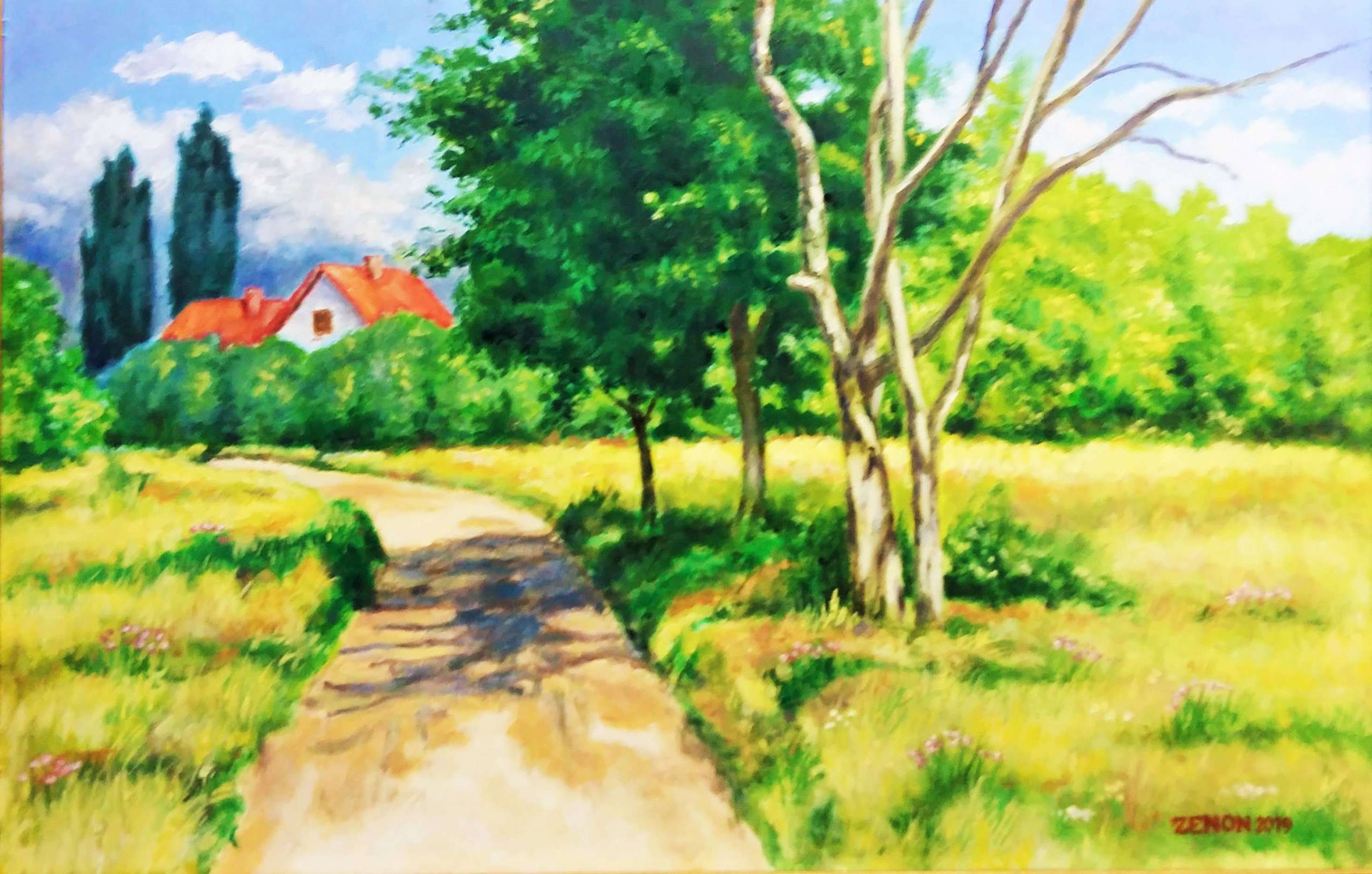 Płótno emanuje spokojem letniego popołudnia. Intensywne zielenie drzew i łąk, błękit nieba z puszystymi chmurami oraz kontrastujące czerwienie dachu domu w tle tworzą malowniczy krajobraz. Ścieżka wijąca się przez pole przyciąga spojrzenie, prowadząc nas w głąb obrazu. Słońce rzuca ciepłe cienie, co dodaje scenie naturalistyczny "touch". Nastrój obrazu jest sielski i nostalgic, jakby czas zatrzymał się na chwilę, pozwalając nam zanurzyć się w marzeniach o beztroskich dniach. Styl artysty przywodzi na myśl impresjonizm, z wyraźnymi, miękkimi pociągnięciami pędzla. Technika naśladuje lekkość i subtelność światła, co podkreśla atmosferę spokoju i harmonii. Patrząc na dzieło, można poczuć delikatny zapach trawy i dźwięk cykania świerszczy. W sercu rodzi się nostalgia za miejscami, które odwiedzaliśmy w dzieciństwie. Obraz ten może budzić w odbiorcach uczucia spokoju, tęsknoty oraz zachwytu nad pięknem natury. "Chciałbym tam pobiegać!" – możemy usłyszeć głos dziecka, wyrażającego czystą radość. Ten krajobraz przypomina o prostocie życia i chwilach, które warto celebrować.