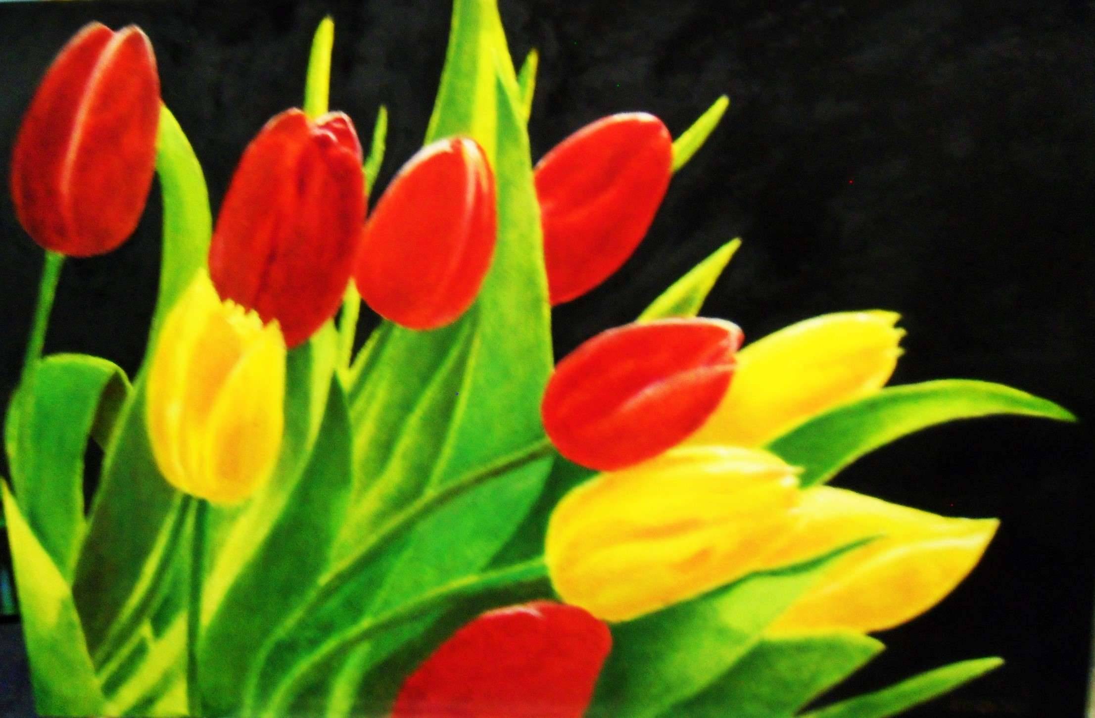 Oto obraz pełen barwnych tulipanów na ciemnym tle, które sprawiają, że ich kolory dosłownie eksplodują. Czerwień i żółć dominują, tworząc dynamiczny kontrast z głęboką zielenią liści. Tulipany jakby tańczyły na wietrze, układając się w chaotyczną, ale wyjątkowo harmonijną kompozycję. Na pierwszy rzut oka obraz emanuje wiosenną świeżością i radością, ale kiedy się wpatrzyć, można dostrzec coś więcej. Styl obrazu jest realistyczny, a zarazem lekko impresjonistyczny. Artysta umiejętnie posługuje się światłem i cieniem, nadając tulipanom trójwymiarowość i głębię. Widoczne są subtelne pociągnięcia pędzla, co dodaje im życia. Emocje, jakie wzbudza ten obraz, to głównie spokój i radość, ale także nostalgia za prostymi chwilami w ogrodzie. Polne tulipany, które można powąchać. Gdy patrzę na ten obraz, przywodzi mi na myśl idylliczne poranki w ogrodach pełnych kwiatów. It's like stepping into a colorful dream. W takim miejscu na pewno chciałbym się kiedyś znaleźć. To jak obraz z bajki dla dzieci, które krzyczą: „Mamo! Mamooo! Chcę tam iść!”. W sumie, kto by nie chciał?