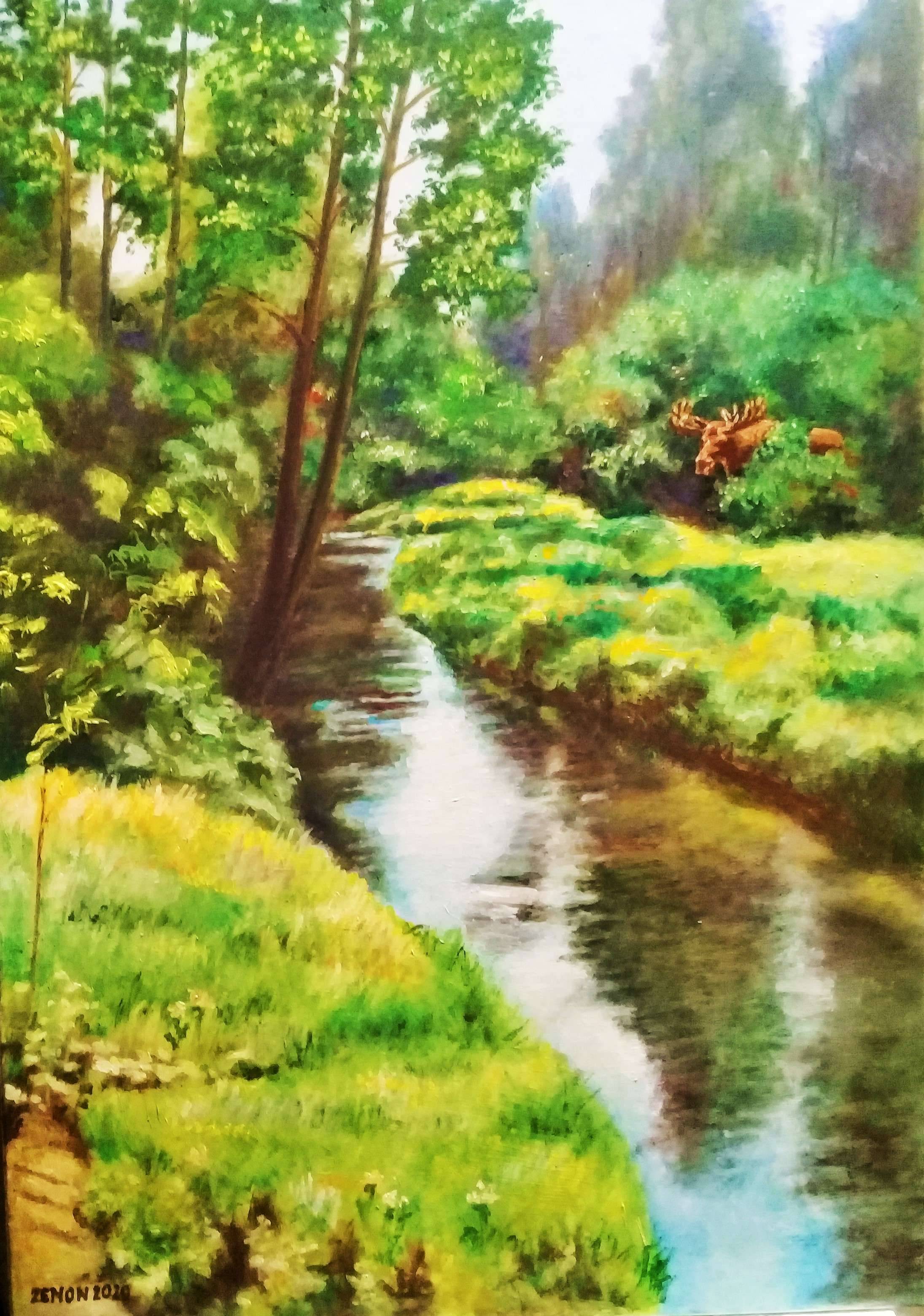 Na obrazie widzimy cudowną, letnią scenę leśną przedstawiającą spokojny strumyk wijący się przez las. Dominują tutaj jasnozielone odcienie liści i trawy, które wspaniale kontrastują z błękitnym lustrem wody i ciemnobrązowymi pniami drzew. Kompozycja obrazu prowadzi wzrok obserwatora w głąb lasu, w stronę majestatycznego jelenia ukrytego między krzewami. Artysta zastosował technikę impasto, co nadaje teksturę liściom i sprawia, że całość zdaje się ożywiać na naszych oczach. Poruszające się refleksy świetlne na wodzie dodają tej scenie dynamiki. Obraz emanuje spokojem i harmonią natury. Jest jak okno do świata, gdzie czas płynie wolniej. Atmosfera sprzyja zadumie i wyciszeniu, a jednocześnie wzbudza ciekawość co kryje się dalej za zakrętem. Patrząc na tę sielankową scenerię, wraca wspomnienie wakacyjnych dni, kiedy to biegało się beztrosko po lesie. To jest jak magiczne miejsce gdzie słychać śpiew ptaków i szum drzew. Obraz, ze swoją bogatą paletą kolorów i naturalnymi kształtami, może wzbudzać w odbiorcy poczucie nostalgii za utraconym czasem czy dzieciństwem. Siedząc przed tym dziełem, można poczuć zapach wilgotnej ziemi i usłyszeć cichy szmer wody. It's like a postcard from a fairy tale! Styl malarski może przypominać impresjonizm, jednak z nieco bardziej realistycznym podejściem do szczegółów. Może zasłuchać się w te barwy i zatopić w marzeniach. Widok jelenia jest jak tajemnica do odkrycia – co on tam robi? Czuję jak ten obraz przenosi mnie do krainy spokoju i piękna.