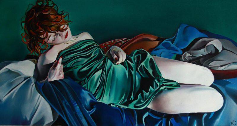 Na obrazie rozciąga się kobieta w zielonej sukni połyskującej jak morze o zachodzie słońca, otulona tkaninami w głębokich odcieniach błękitu i tajemniczego granatu. Jej skóra jest jasna, niemal eteryczna, co kontrastuje z burzą rudych loków. Delikatne światło rozlewa się po niej, jakby chciało uwiecznić ten moment na zawsze. Kompozycja jest dynamiczna, a mimo to emanuje spokojem i jakąś senną melancholią. Obraz zdaje się łączyć realizm z impresjonizmem, z widowiskową grą światłocieni. Każdy pociągnięcie pędzla jest precyzyjne, ale i niezwykle subtelne. Wywołuje to uczucie zanurzenia w intymnym świecie bohaterki tej sceny. Wyobraźnia podsuwa różne historie. Może to chwila zadumy, a może kilka sekund przed zaśnięciem. Patrząc na ten obraz, człowiek odczuwa nostalgię za chwilami ulotnymi i nieuchwytnymi, jak wiersz czy piosenka sprzed lat. A ja myślę, że ten obraz mówi "calmness". Prosty, a zarazem pełen tajemnic, pozostawia widza z tysiącem pytań i jednym pragnieniem – zatrzymać ten moment na dłużej. "To wygląda jak dobra drzemka", powiedziałoby dziecko. Co za magia!