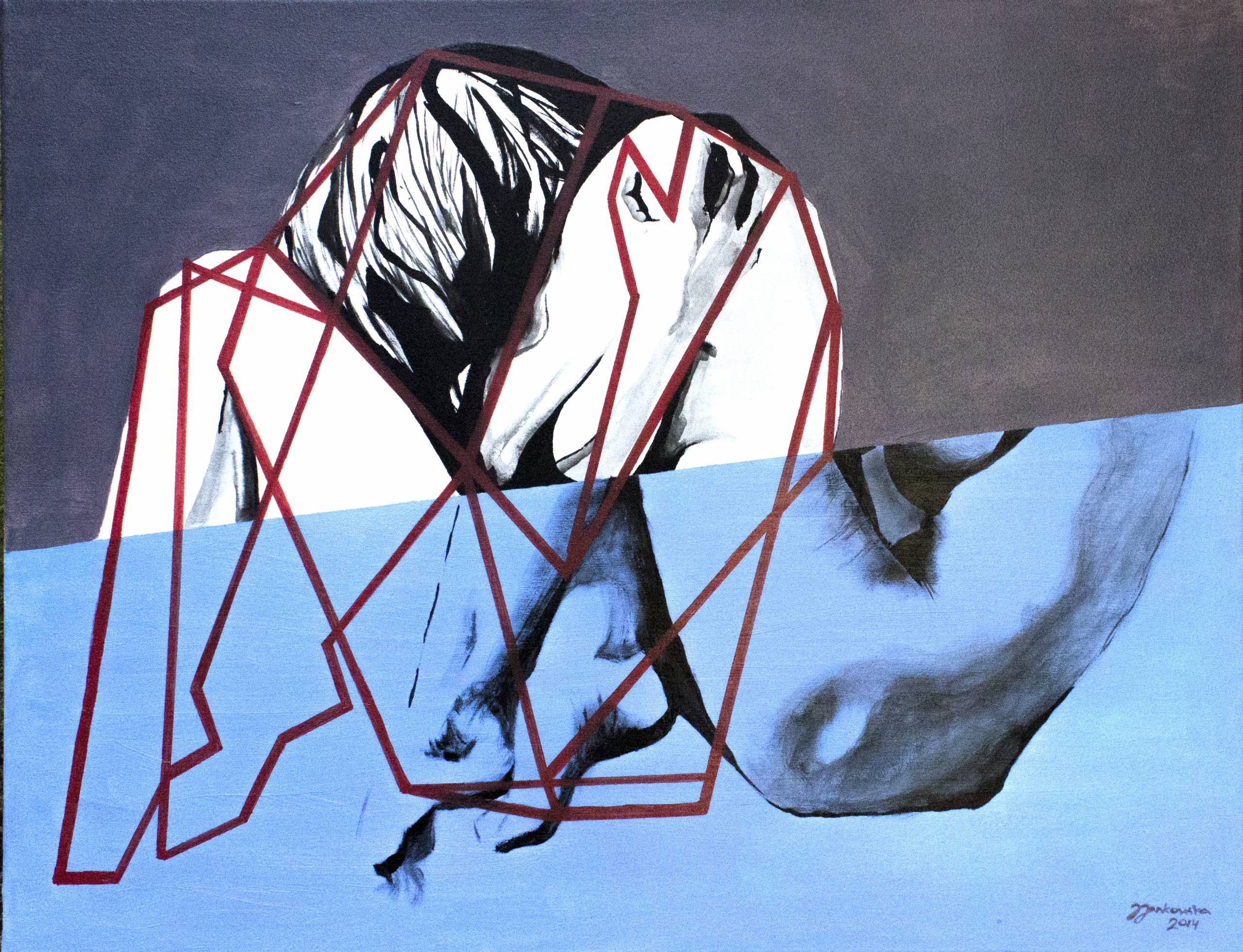Abstrakcyjne przedstawienie zjawiska załamania światła. Obraz zawerniksowany, podpisany z obu stron.