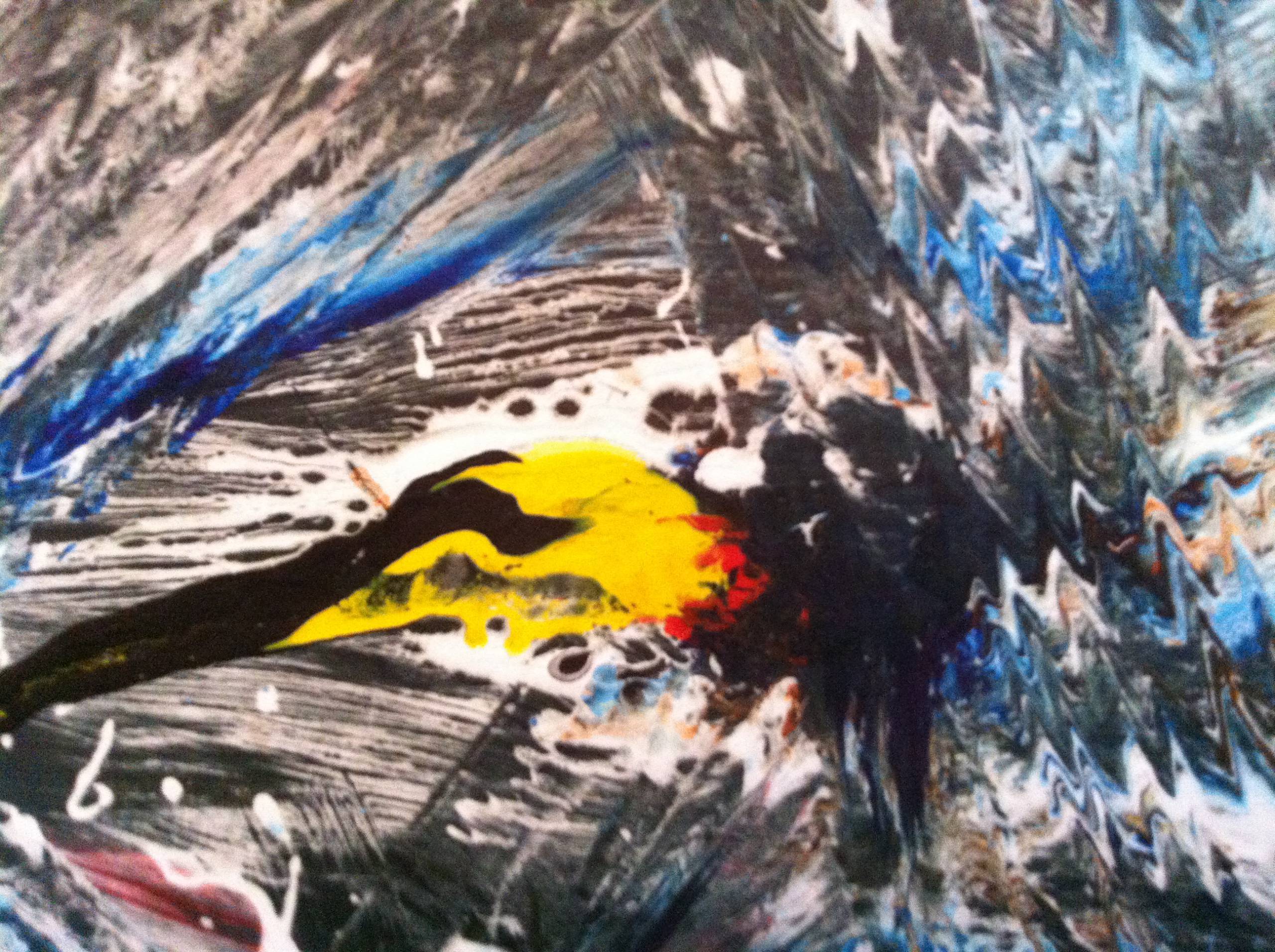 Na obrazie dominują dynamiczne plamy barw, tworzące wybuchową mieszankę kolorów. Biel, błękit, żółć i czerń splatają się w wirującej symfonii kształtów. Energia tych barw, rozpraszająca się w różnych kierunkach, imbues the whole piece with a sense of chaos. Ale jakby się przyjrzeć - każda plama zdaje się mówić coś innego. Styl przypomina technikę drip, gdzie farba swobodnie spada na płótno, tworząc nieprzewidywalne wzory. Unosi się uczucie napięcia, jakby coś miało się zaraz wydarzyć. Artystyczny nieład wzbudza w widzu emocje, które mogą prowadzić do refleksji nad ulotnością chwili. Podróż wzroku po krzywiznach i zawijasach przynosi różnorodne skojarzenia - od morskich fal po burzową chmurę. Mały Jaś powiedziałby, że to wygląda jak wybuch farby. Artysta, stosując różnorodne techniki, stworzył wizualny bałagan, a jednak każda drobna linia ma swój sens. Fascynujące, jak chaotyczna kompozycja może być jednocześnie tak spójna. Obraz może budzić w widzu niepokój, ale i ekscytację - wszystko zależy od indywidualnej percepcji.