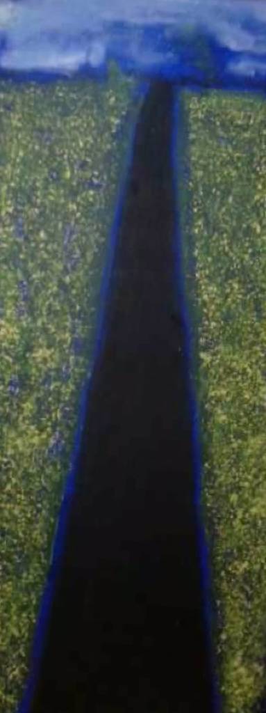 Obraz przedstawia ciemną, prostą drogę prowadzącą w dal, otoczoną zielonymi polami pokrytymi drobnymi plamkami żółtego i fioletowego koloru. Jakby ktoś nieco przypadkowo rozlał farby na płótnem. Nad horyzontem unosi się nieokreślone, błękitne niebo, z lekkim zarysem chmur. Atmosfera jest tajemnicza i nieco melancholijna, a droga wydaje się prowadzić ku nieznanym, dalekim krainom. Artysta, stosując szerokie pociągnięcia pędzla i intensywne barwy, podkreśla kontrast między spokojem krajobrazu a niepewnością, co kryje się za horyzontem. Obraz emanueje emocjami niepokoju i ciekawości. Zastanawiasz się, co może być na końcu tej drogi. Może tam jest skarb? Pomyślałoby dziecko. Kompozycja, choć prosta, wciąga wzrok i prowadzi go od dołu ku górze, dodając dynamizmu. Właśnie ten dynamiczny element, "the journey" jakby powiedział Anglik, jest kluczowy w odbiorze tego dzieła. Moim zdaniem, obraz może wywołać refleksje nad nieprzewidywalnością życia i potrzebą odkrywania nieznanego. Widzimy tu fascynujące połączenie ekspresji i symbolizmu, które daje szerokie pole do interpretacji.