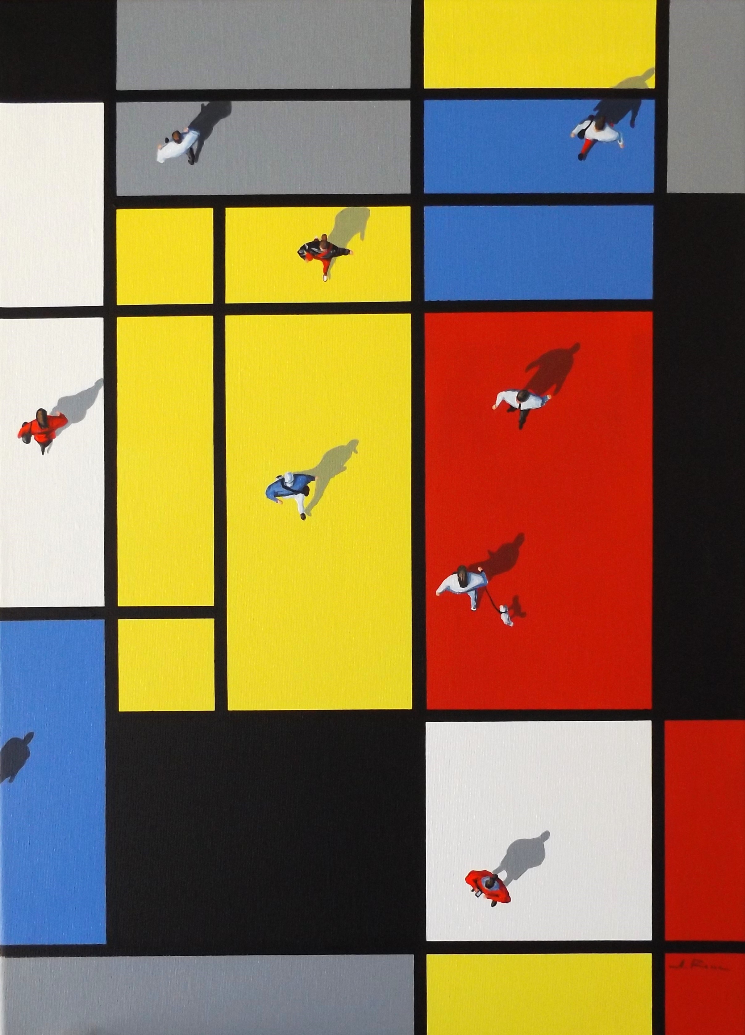 Obraz pochodzi z serii ,,Shadows,, sygnowany z przodu i tyłu .Inspirowany twórczością Pieta Mondriana którego obrazy posłużyły mi jako abstrakcyjne miasta tła w których umieściłam grupy ludzi. Całość tworzy spójną kompozycję z nowym przekazem.