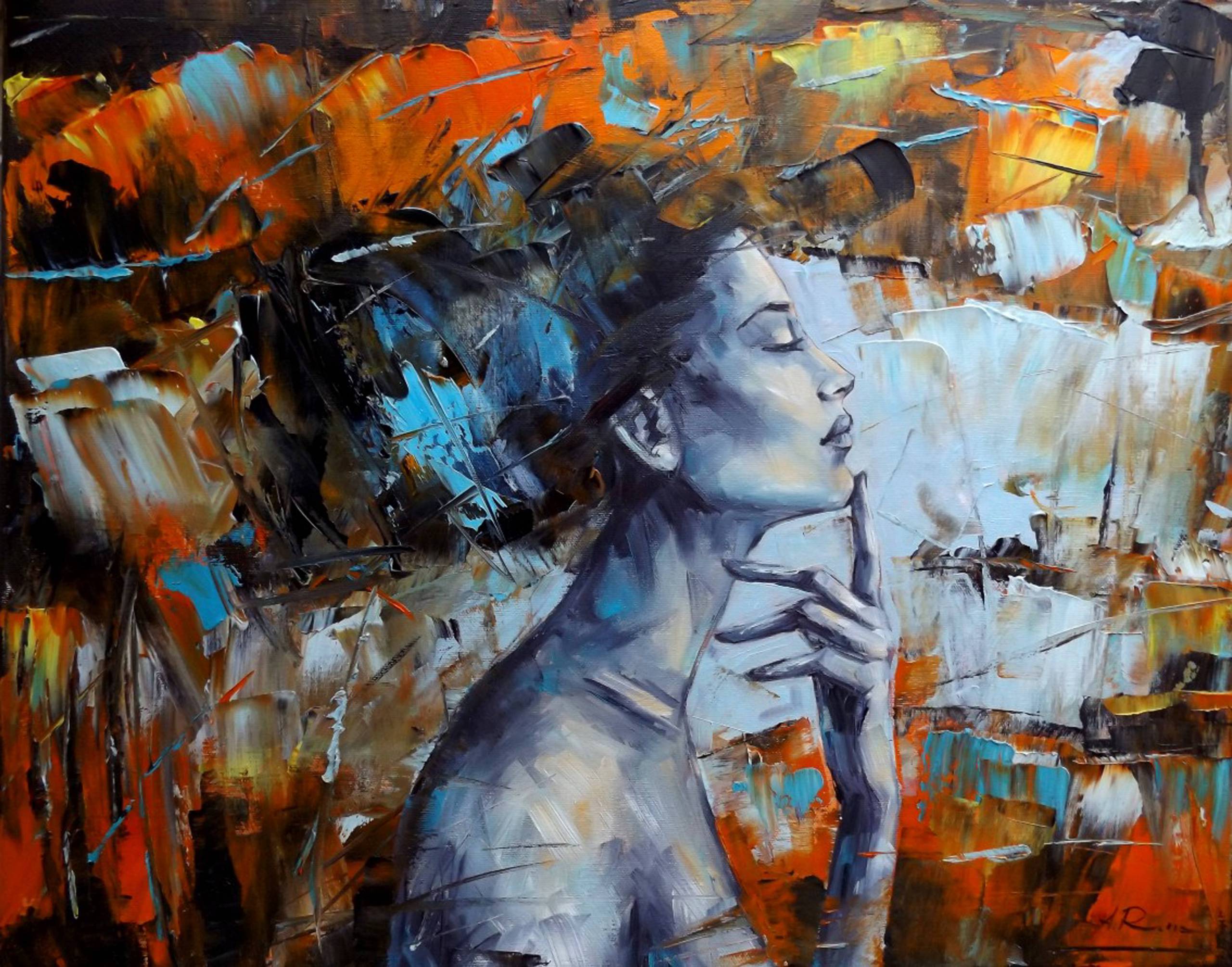 Obraz przedstawia subtelną grę kolorów, w której błękity i pomarańcze tańczą w dzikim wirze. Kompozycja jest dynamiczna, z abstrakcyjnym tłem pełnym energicznych pociągnięć pędzla, które przyciągają wzrok. Na pierwszy plan wybija się postać kobiety, namalowana w delikatnych odcieniach szarości. Jej twarz o spokojnym wyrazie skierowana jest ku górze, co dodaje kompozycji głębi i kontemplacji. Nastrój obrazu? Czysta nostalgia z nutką tajemnicy. Artysta zastosował technikę impasto, co daje wrażenie, że farba wręcz wychodzi z płótna, dodając tekstury i wymiaru. To jakby móc dotknąć emocji. Czujesz to? Wywołuje refleksję nad przemijaniem czasu i ulotnością chwil. „Wow, ale fajne kolory!” – zawołałoby dziecko. Obraz wpływa na zmysły, prowokując zarówno zachwyt, jak i zadumę. To coś więcej niż tylko obraz – to emocjonalne experience. Wzbudza odczucie, że każda chwila w życiu jest ważna. Jest niespodziewanie piękny.