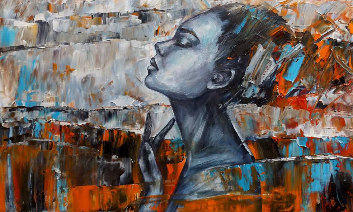 Na obrazie widzimy tajemniczą kobietę unoszącą delikatnie głowę, jakby oddawała się chwili zadumy lub marzeń. Paleta kolorów jest dość intensywna, łącząc pomarańcze z chłodnym błękitem, oraz neutralne szarości i czernie. Te barwy tworzą tło, które wydaje się być dynamiczne, niemal jakby żyło własnym rytmem. Kompozycja składa się z subtelnych, lecz zdecydowanych pociągnięć pędzla, co nadaje całości faktury i głębi. Atmosfera obrazu jest przyjemnie melancholijna, emanuje spokój i kontemplacja. Kobieta wydaje się być zamknięta we własnym świecie, może nawet śni na jawie. Styl artysty jest bardzo ekspresyjny, stosuje swobodne, niemal impastowe techniki, które dodają pracy energii i dynamizmu. Odbiorca może odczuwać spektrum emocji – od spokoju po refleksję nad własnym życiem. Można się zastanowić, co takiego może ona sobie myśleć? "Czy ona marzy o czymś fajnym?" – mogłoby spytać dziecko. Obraz pobudza do myślenia, zaskakuje i zaprasza do chwili zatrzymania. Wszystko to sprawia, że daje nam poczucie "peace", zanurzenia w harmonii i tajemnicy.