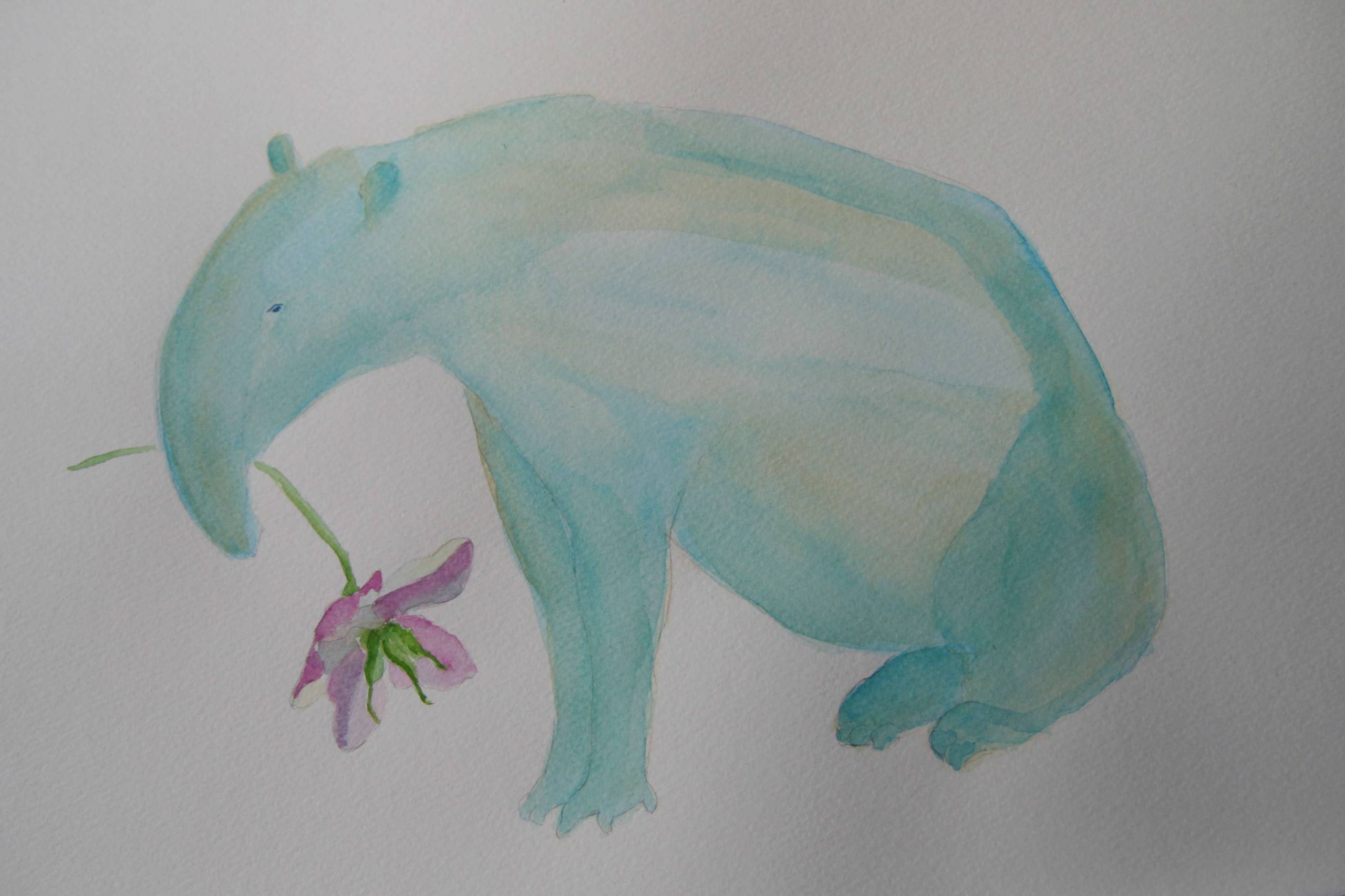 Tapir z anemonem; 30x 42 cm, akwarela na papierze bawełnianym, 2019 rok