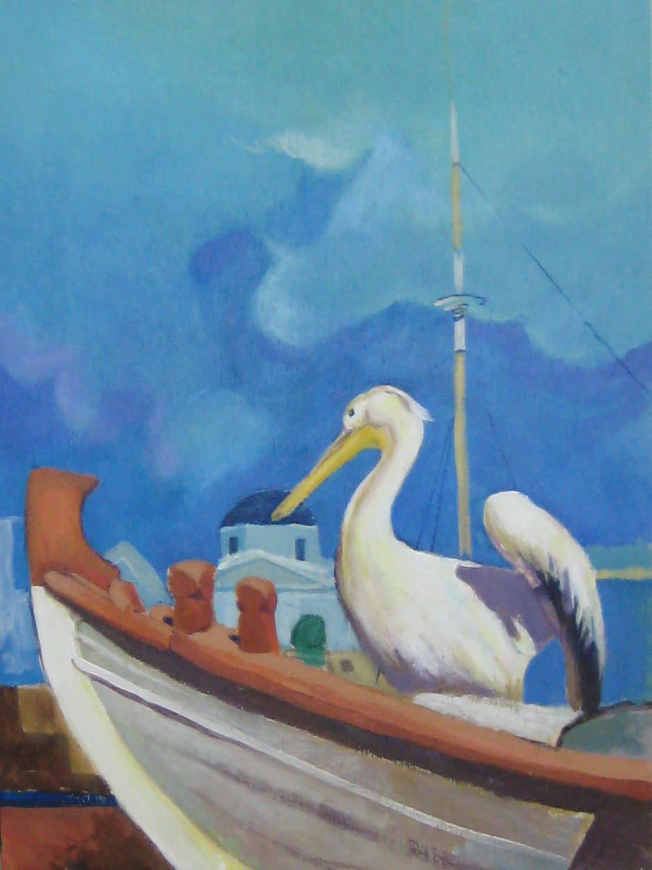 Obraz, pełen życia i spokoju, przedstawia białego pelikana siedzącego na łodzi wymalowanej w delikatnych odcieniach bieli i brązu. W tle rozpościera się błękitne niebo, które przywodzi na myśl bezkresny pejzaż nadmorski. Kolory są stonowane, tworząc harmonijną i uspokajającą kompozycję. Atmosfera tej sceny emanuje ciszą i chwilą wytchnienia, jakby czas się zatrzymał na moment. Styl artysty przypomina impresjonizm, choć z odrobiną realistycznej dokładności. Pędzle muskały płótno z lekkością, a subtelne cieniowanie dodaje głębi. U odbiorcy może budzić to poczucie wolności i tęsknoty za spokojem natury. Wygląda, jakby pelikan był kapitanem własnego marzenia. Czy on szuka ryby? O! To takie 'peaceful', że prawie słychać szum fal. Oglądając tę scenę, trudno nie poczuć delikatnego wiatru na twarzy i zapachu morza w powietrzu. To obraz, który po prostu zaprasza do chwili refleksji i ucieczki od zgiełku dnia codziennego.
