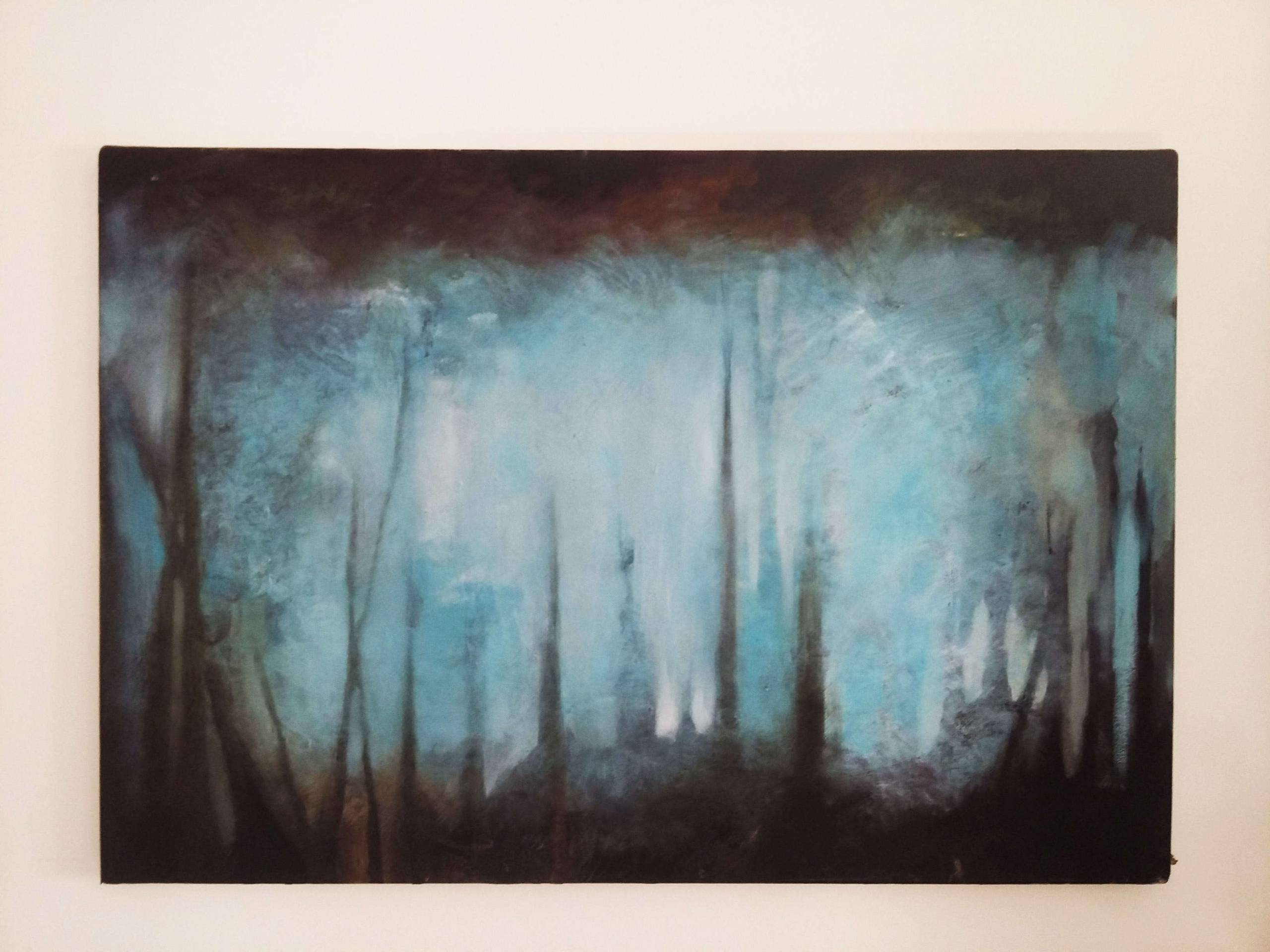 Obraz jest jak podróż w nieznane. Dominują tu zimne tony błękitu i szarości, przenikające się z ciemniejszymi, niemal czarnymi barwami. Sylwetki przypominające drzewa wznoszą się ku górze, wyrastając z cieni w dolnej części płótna. Kompozycja jest mroczna, ale zarazem urzekająca, jak nocny spacer przez tajemniczy las. Minimalizm i abstrakcyjność sugerują, że artysta inspirował się naturą i jej ulotnymi momentami. Atmosfera obrazu jest pełna spokoju, ale skrywa w sobie nutkę tęsknoty. Wprowadza odbiorcę w stan zadumy, skłaniając do refleksji nad chwilowością piękna. To tak, jakbyśmy patrzyli na krajobraz tuż przed wschodem słońca, kiedy wszystko jest jeszcze owiane mgłą tajemnicy. Styl i technika użyte przez artystę to prawdopodobnie mieszanka impresjonizmu i abstrakcji, które nadają dziełu jego unikalny charakter. Dzieło wywołuje we mnie uczucia zadumy i nostalgii. "It’s like a dream," można by powiedzieć, bo każdy widzi w nim coś innego. Moje myśli wędrują do dzieciństwa i bajek o zaczarowanych lasach. Jestem ciekaw, co czuje inne osoby patrzące na to dzieło. Może to być spokój, a może niepewność. Jedno jest pewne - obraz przyciąga wzrok i zostaje w pamięci na długo.