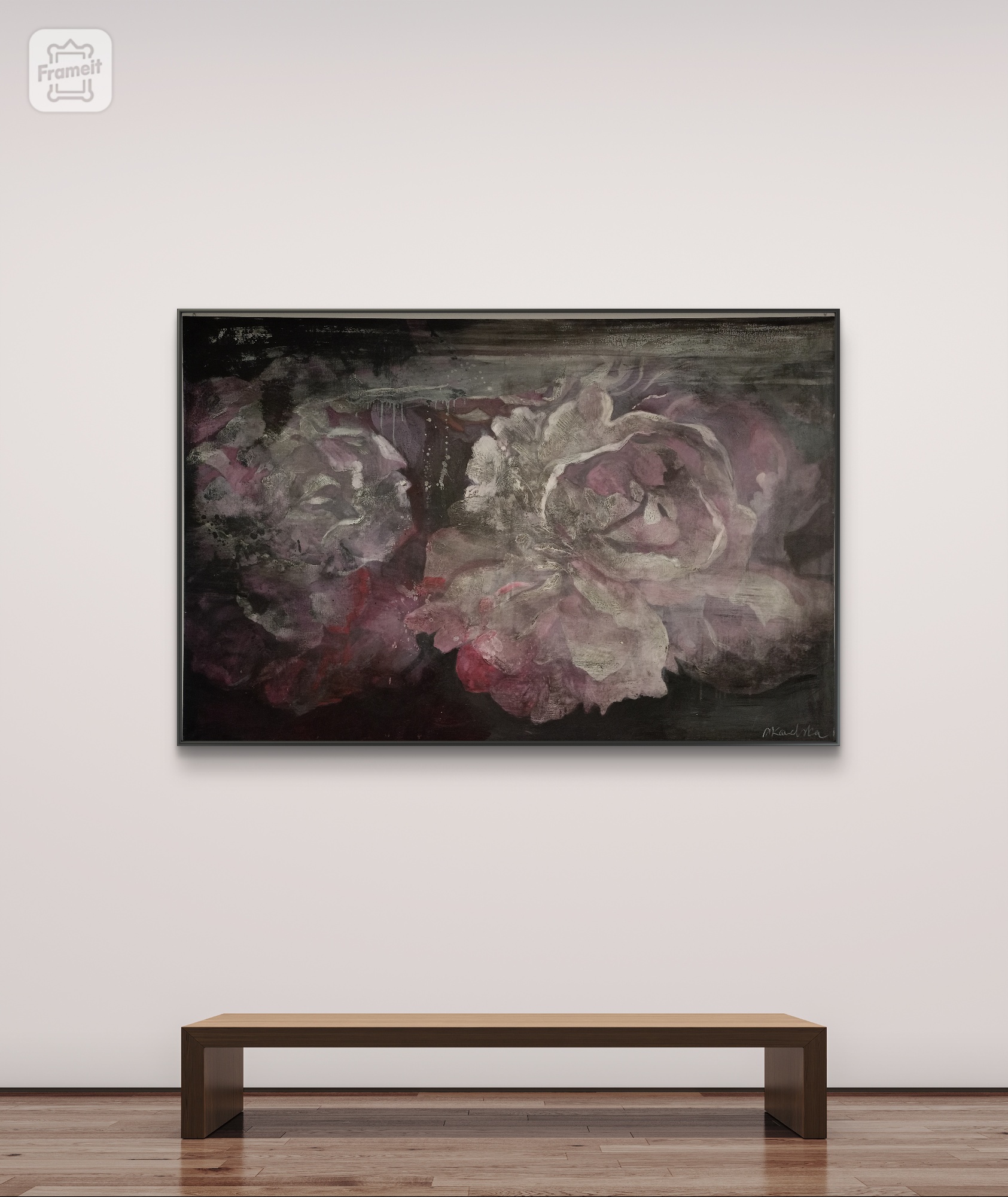 Na obrazie dominują ciemne, tajemnicze odcienie z przemykającymi akcentami różu i szarości. Kwiaty, zapewne róże, unoszą się jakby we mgle, rozmyte i eteryczne. Jest coś magicznego w rozmytej kompozycji, która sprawia, że zanurzamy się w myślach, próbując wyłowić kształty. Atmosfera obrazu jest melancholijna, ale i pełna ukrytej elegancji. Trochę jak w sennej krainie, gdzie czas stoi w miejscu. Artysta użył technik mieszanych, które dodają dziełu głębi. A może tylko mi się tak wydaje. Emocje? Wzruszenie, nostalgia, może lekka zaduma nad przemijaniem. You know, takie refleksje nad pięknem i ulotnością. Obraz nie jest tylko do oglądania - on jest do odczuwania. Czasem wydaje mi się, że te kwiaty szepcą do mnie... Kwiatki są super piękne! Tak, jakby każdy płatek miał swoją własną tajemniczą opowieść. Ciepło i chłód mieszają się tutaj w jedną harmonijną całość.