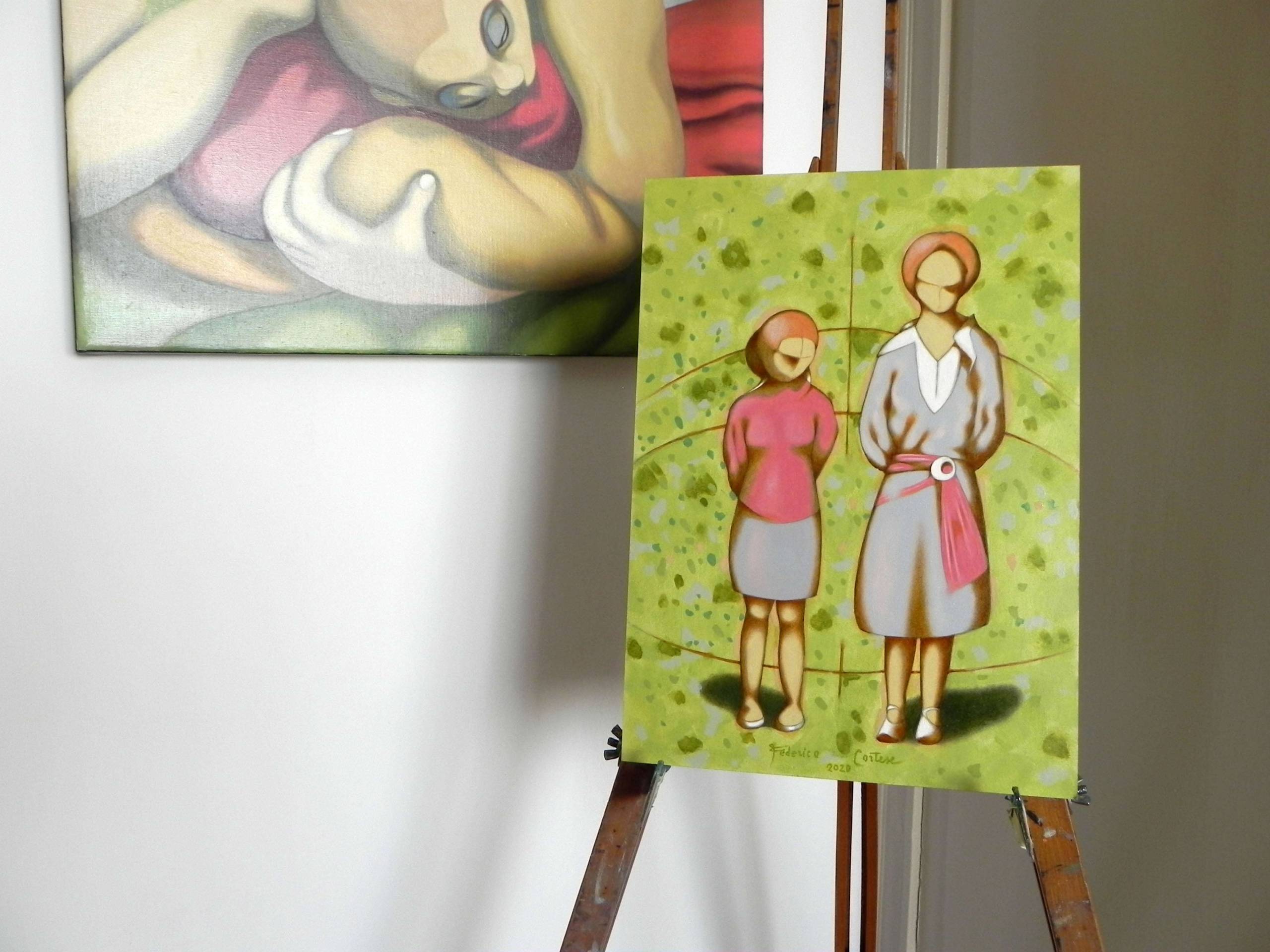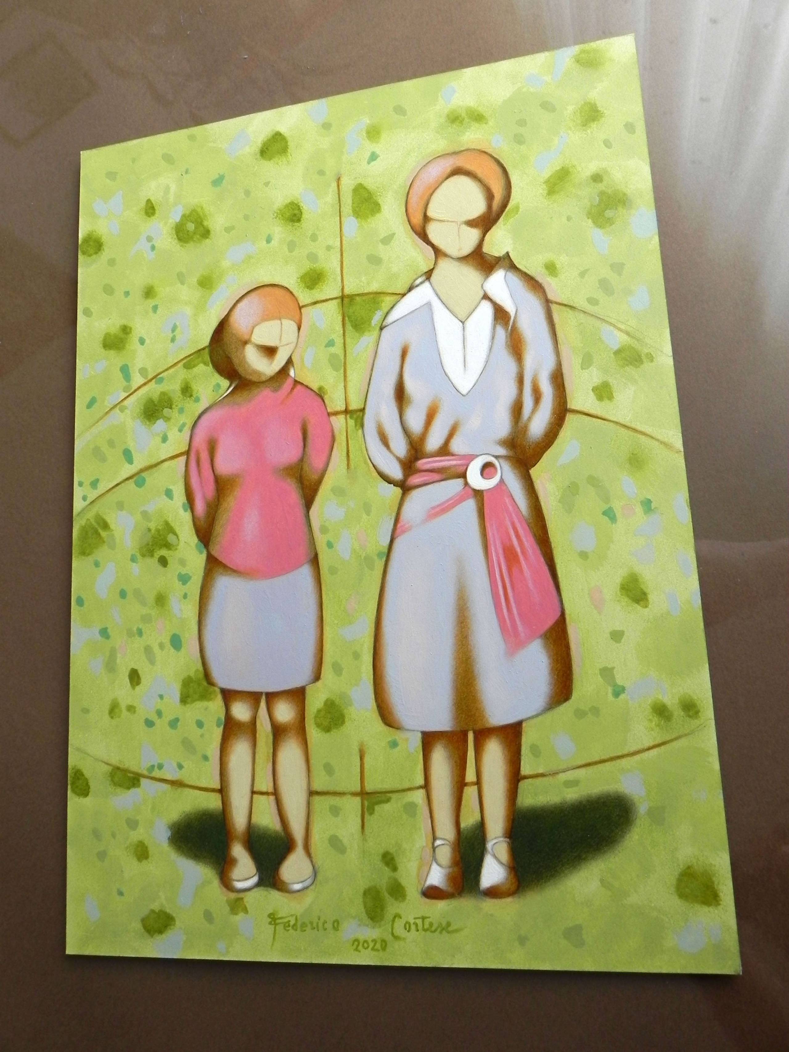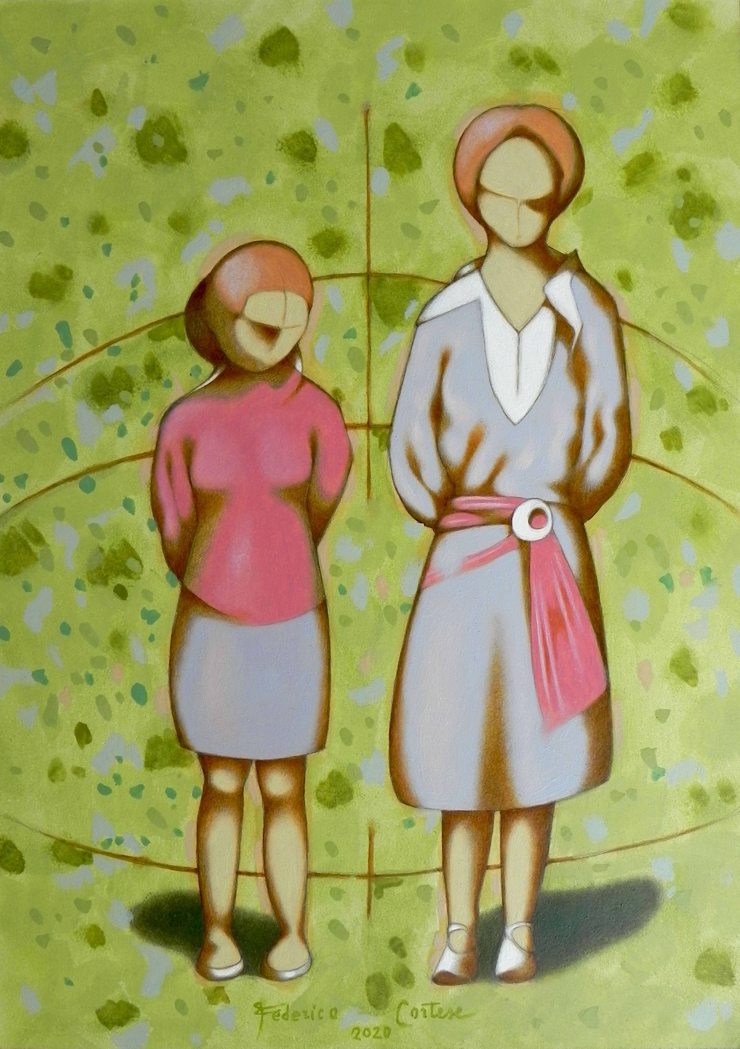 Imaginary portrait of two young women on a green background. Oil on thick paper, 2020. Original sold.