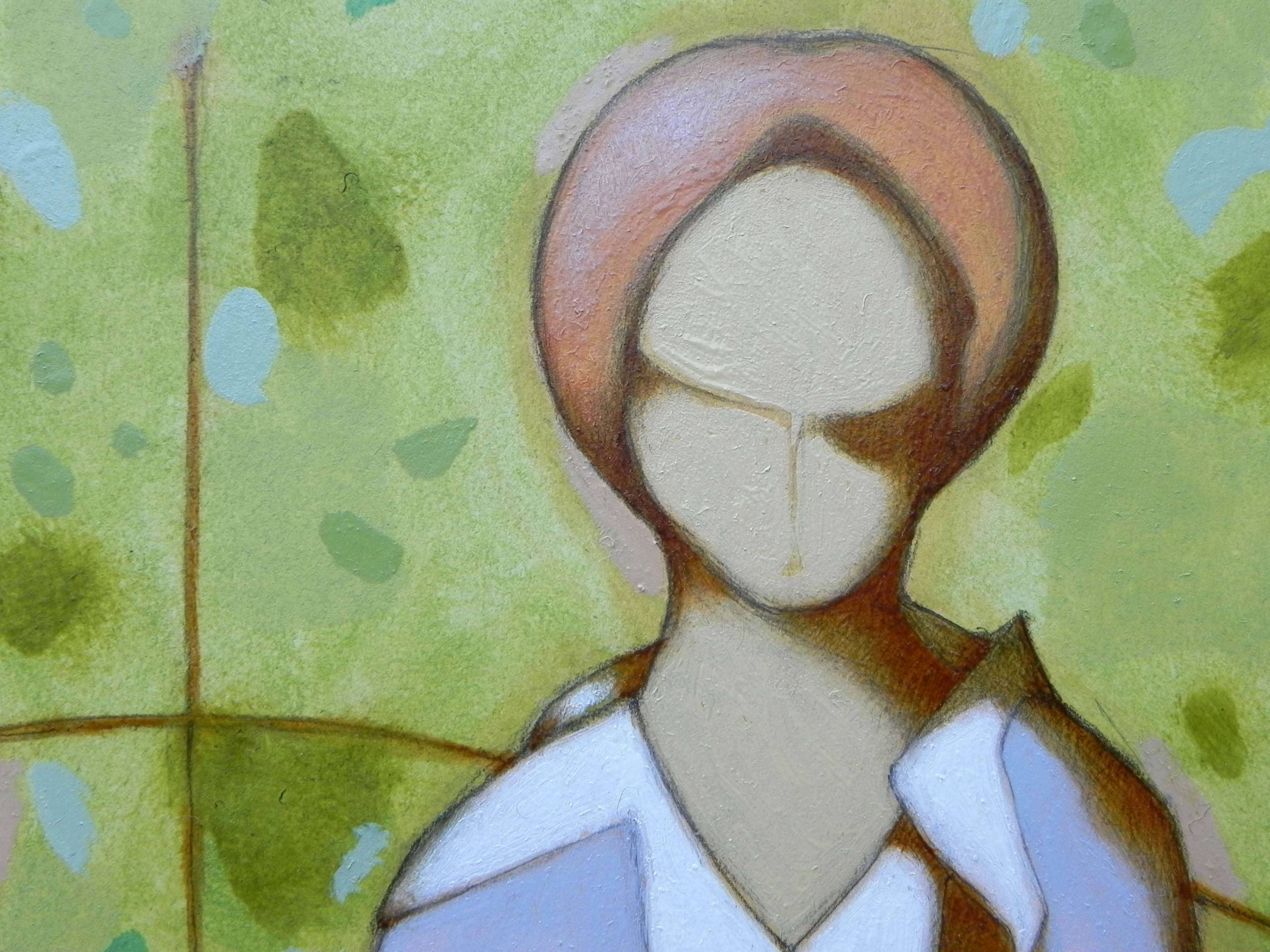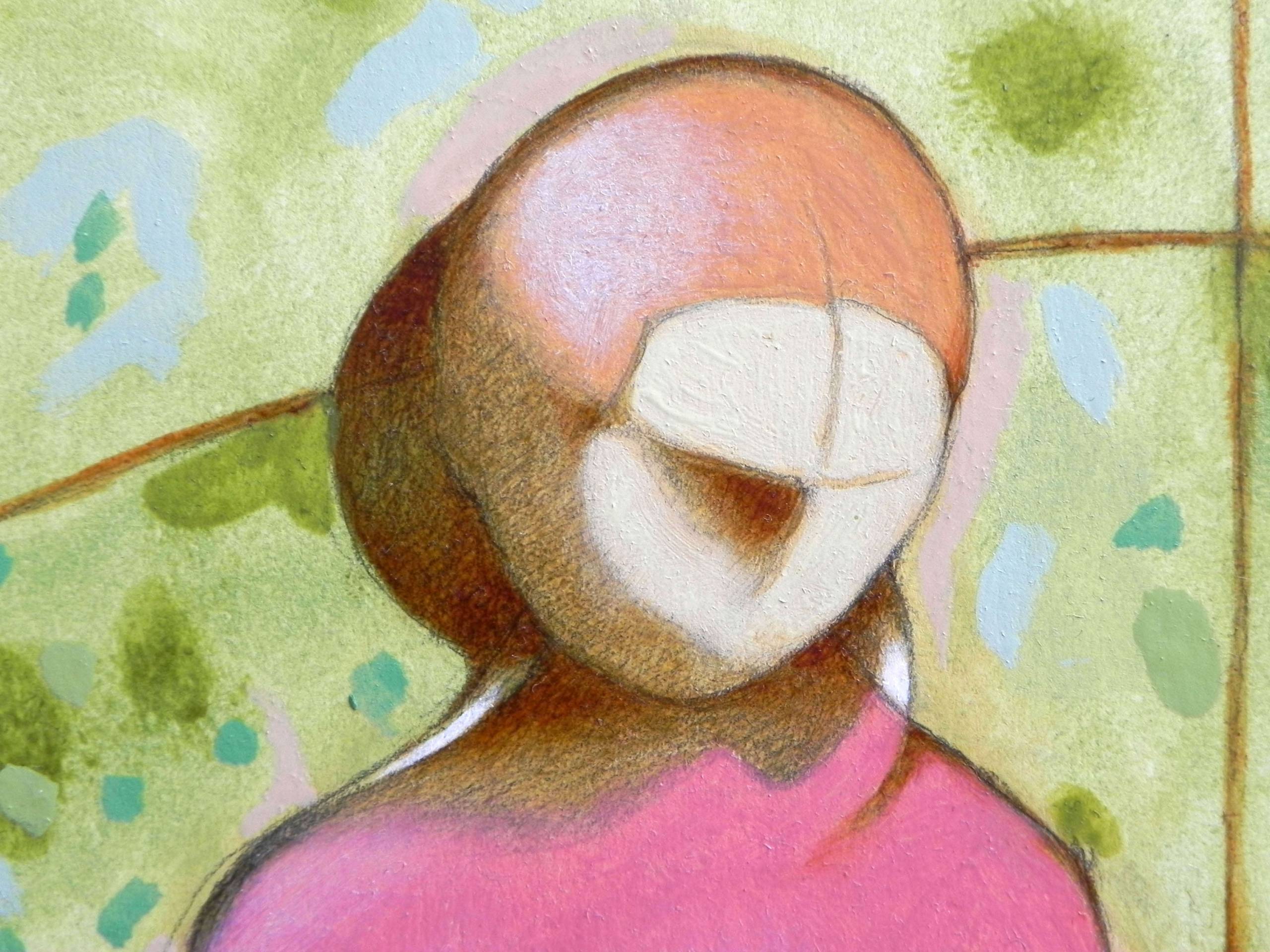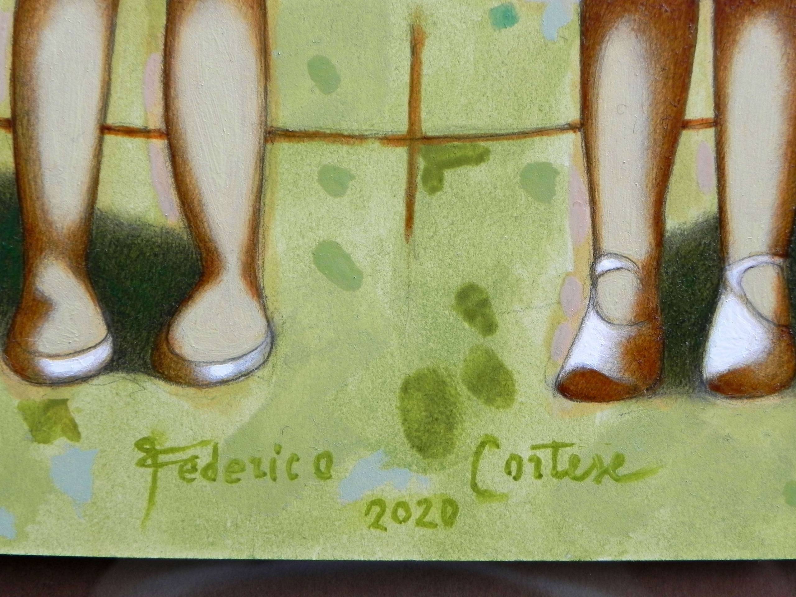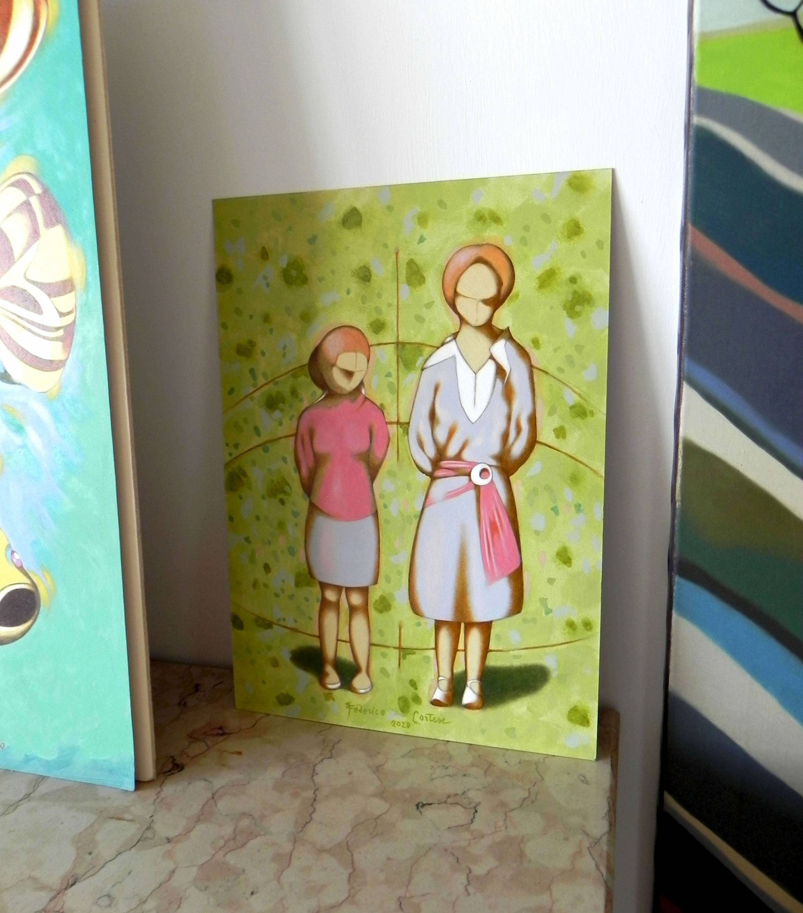 Imaginary portrait of two young women on a green background. Oil on thick paper, 2020. Original sold.