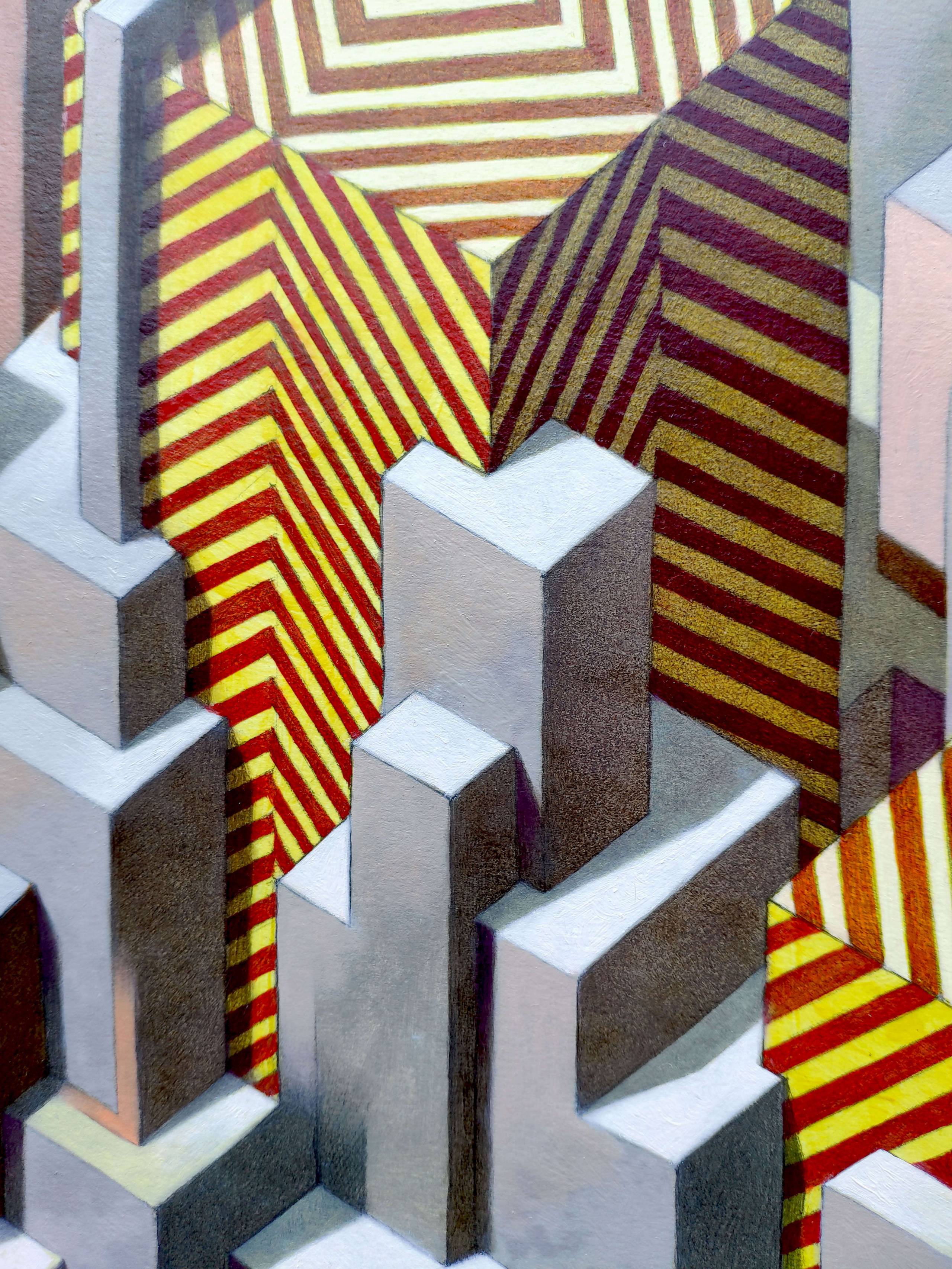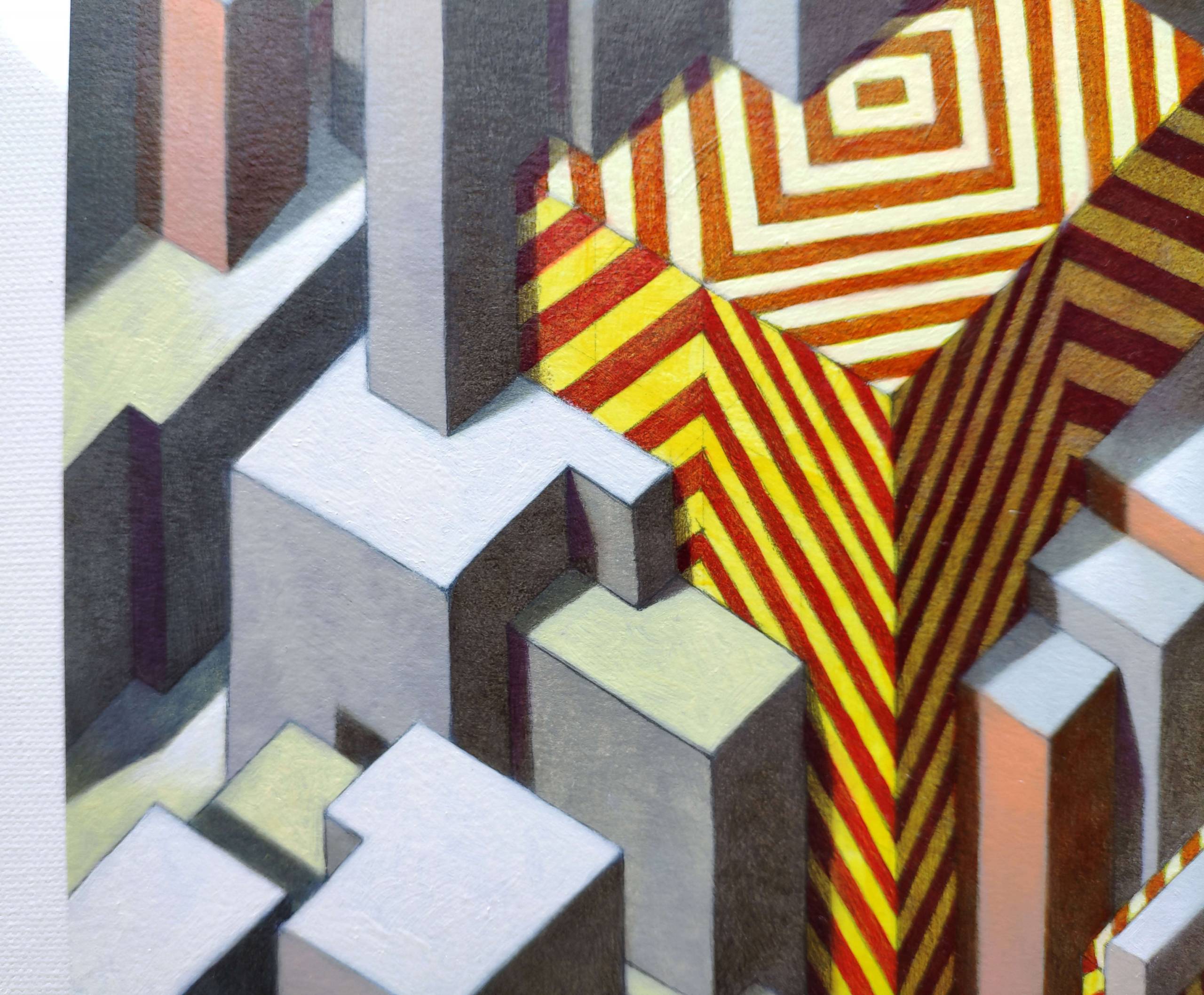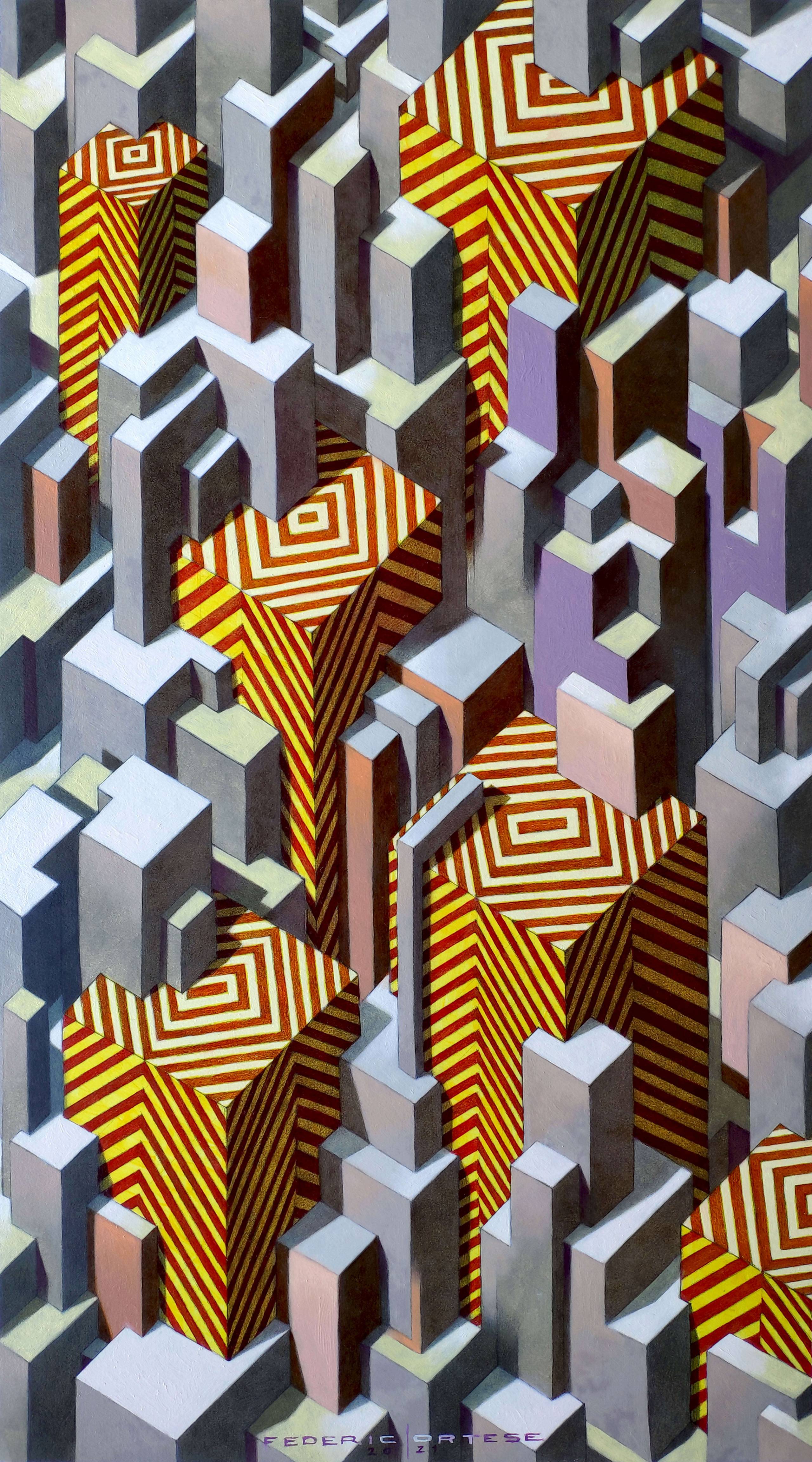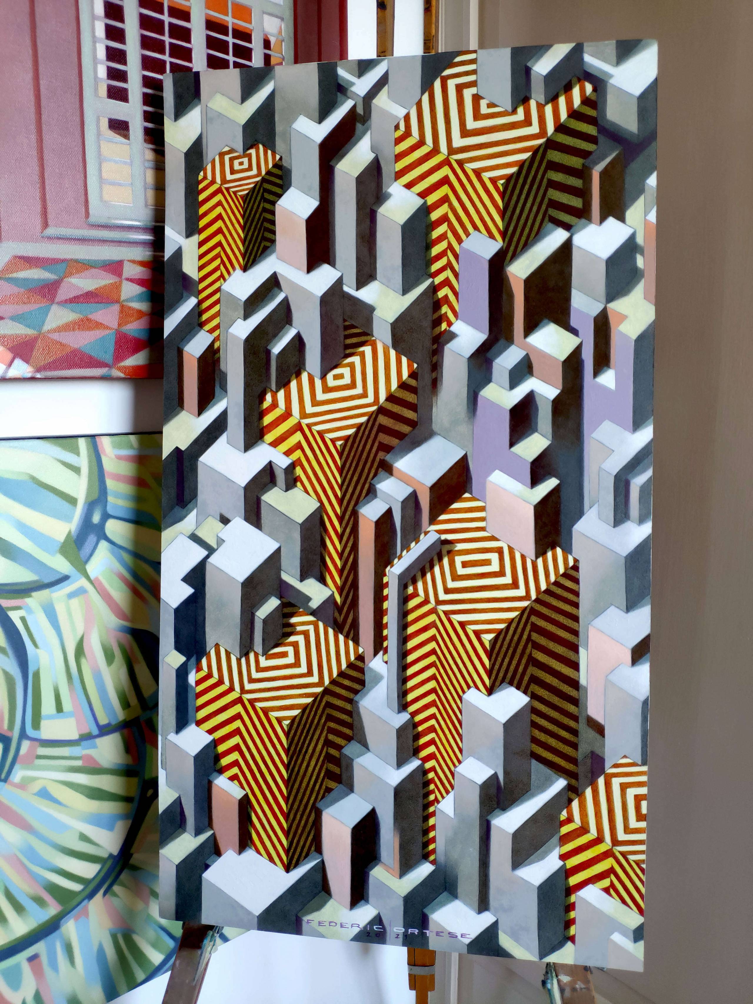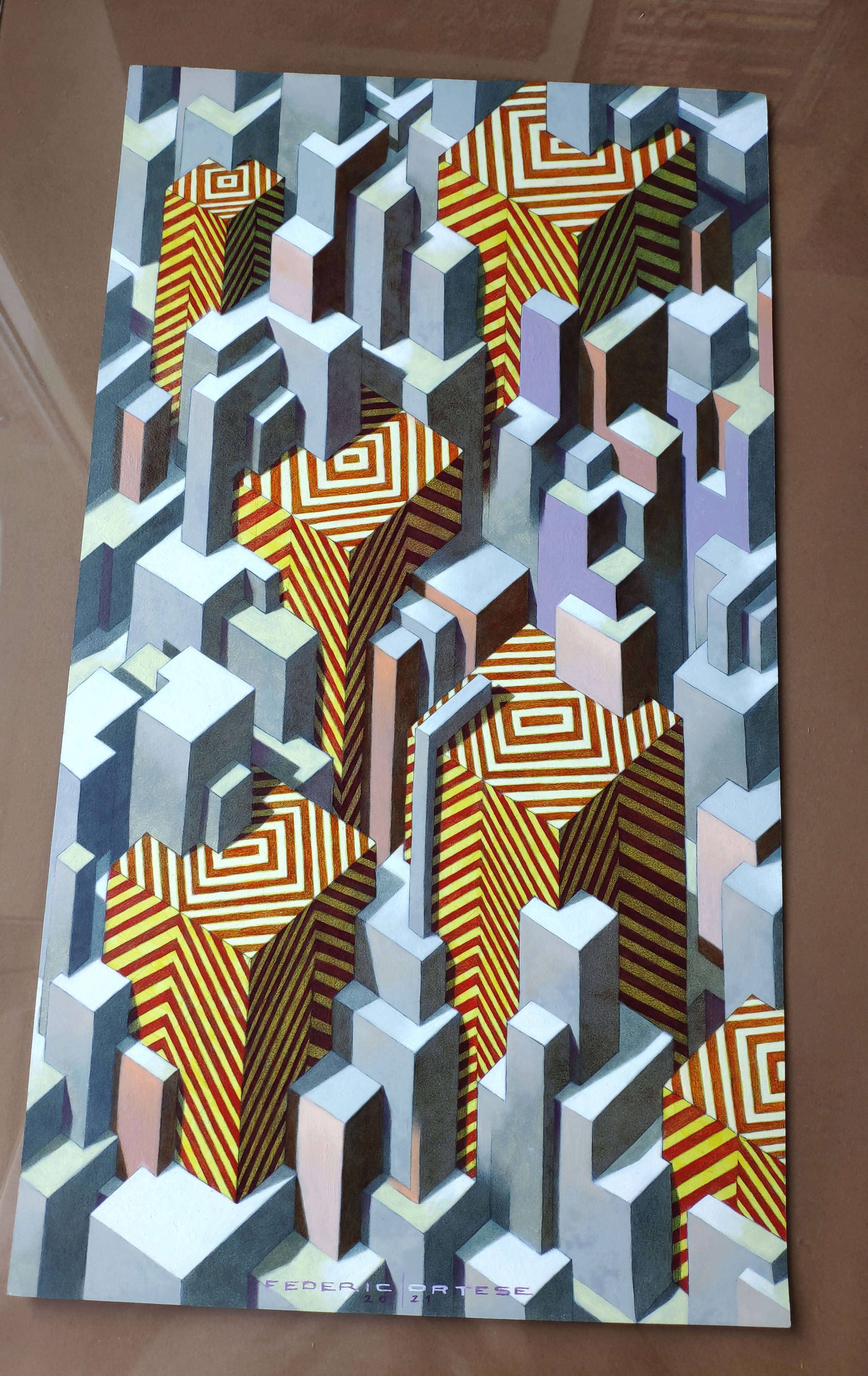 Oil on thick paper, 2021. Original sold. In the contemporary metropolis one can often get the impression that there is no end, edge, limit or border. The city seems to extend in all directions to the horizon, often with monotony and apparent alienating repetitions. However, for those who live in it, the infinite city is not only a source of stress and frustration, but it is often an exciting jungle, a continuous challenge full of possibilities and unpredictable opportunities. In the infinite city we become small and the fear of being crushed can be great, but despite this it irresistibly attracts us, like a siren call.