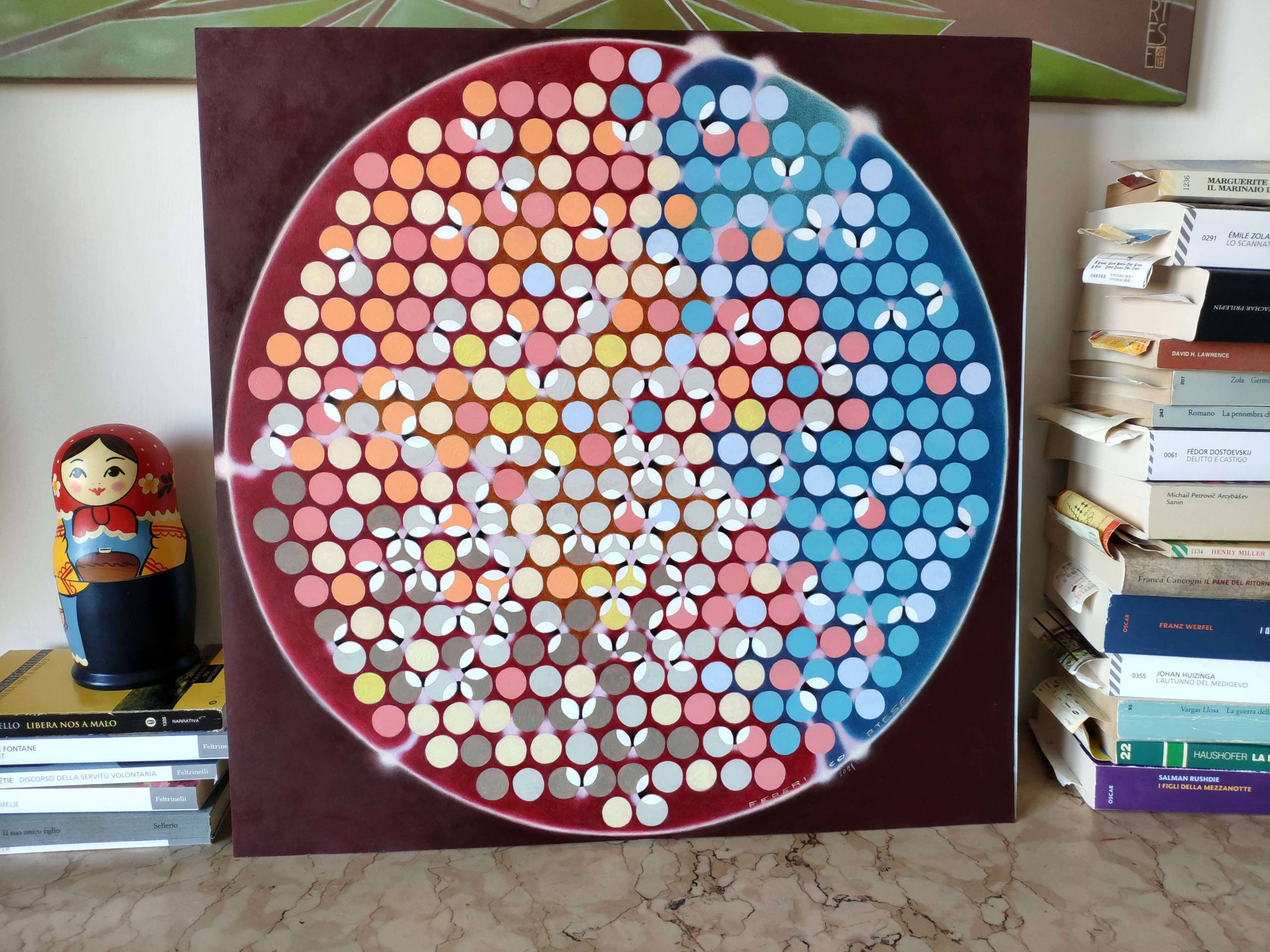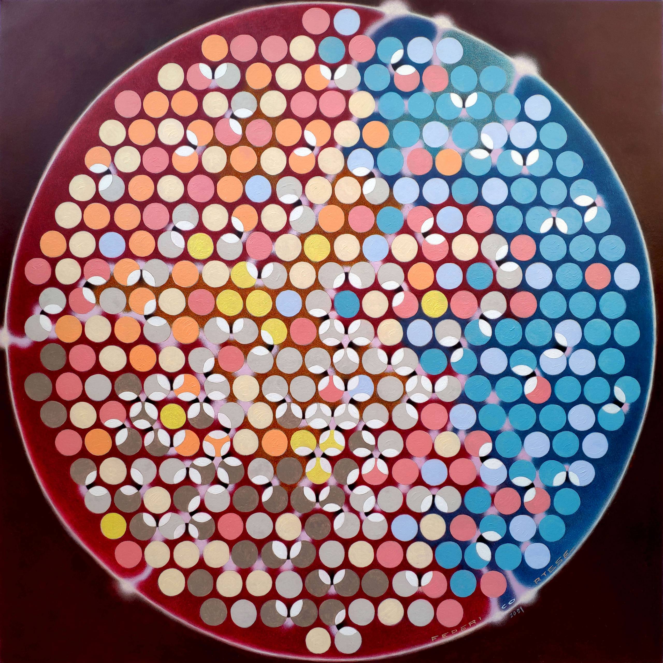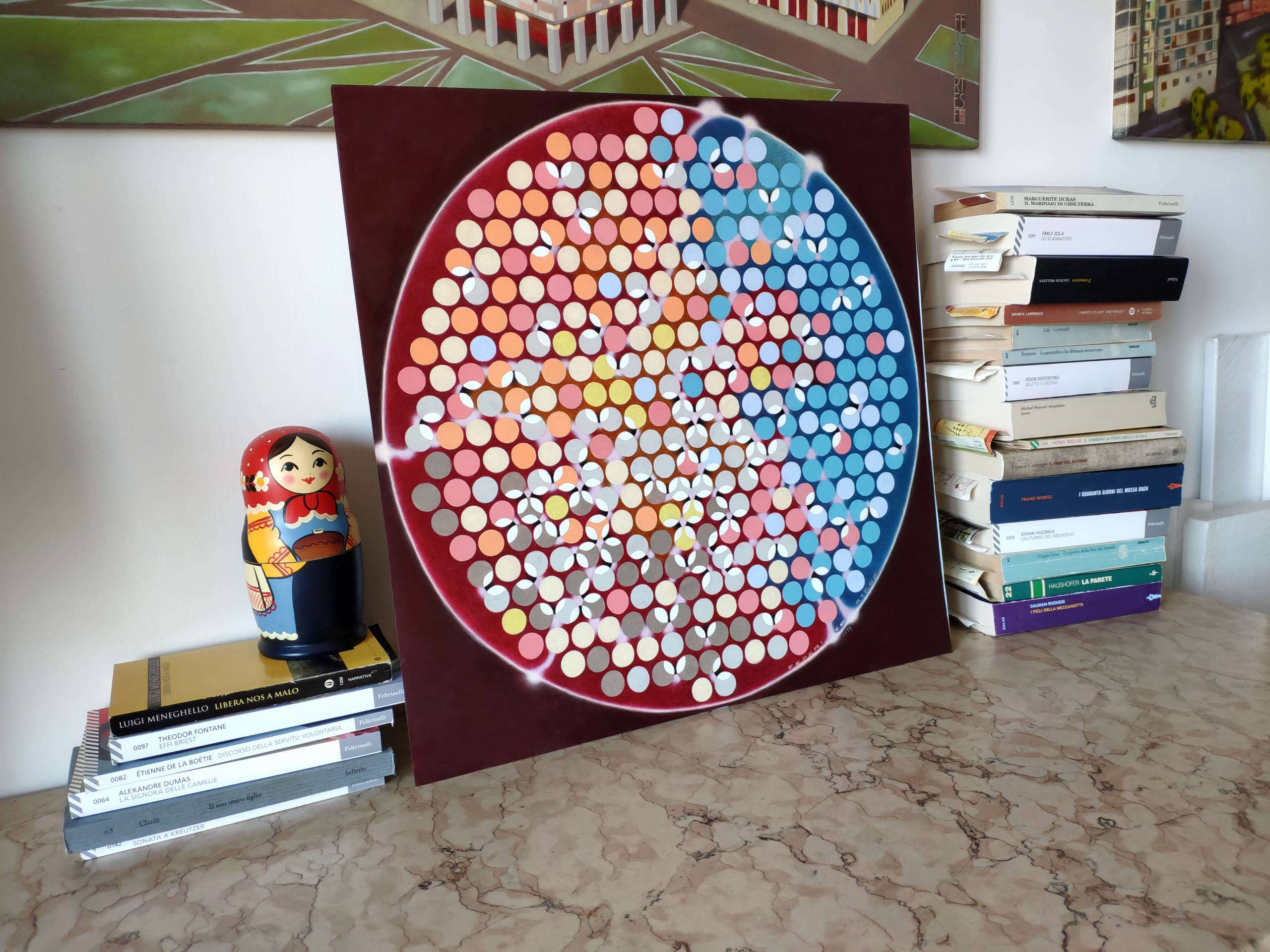 An original piece from the series “Chromatic”, oil on thick paper. 2021. Artists are attached to a particular theme or compositional scheme often, till the point that it almost becomes an obsession, their personal and unmistakable signature. On a closer inspection, what counts in these schemes is the possibility, or possibilities, of generating variants. I believe that the artist is precisely attracted to the investigation of these variants, and the exploration of the limit to which one can go in their alteration. And if there are many variables involved in this game, the possibilities of creating variations become almost infinite. I believe that unconsciously, this creative process is also gratifying because it allows us to invent an illusory order, where the chaos of reality can create confusion. One could almost speak of a "collector's syndrome", except that in this case, the artist, not only, as in a collection of butterflies or stamps, always searches for new specimens and this research is never satisfied, but he even creates "specimens” by himself!
