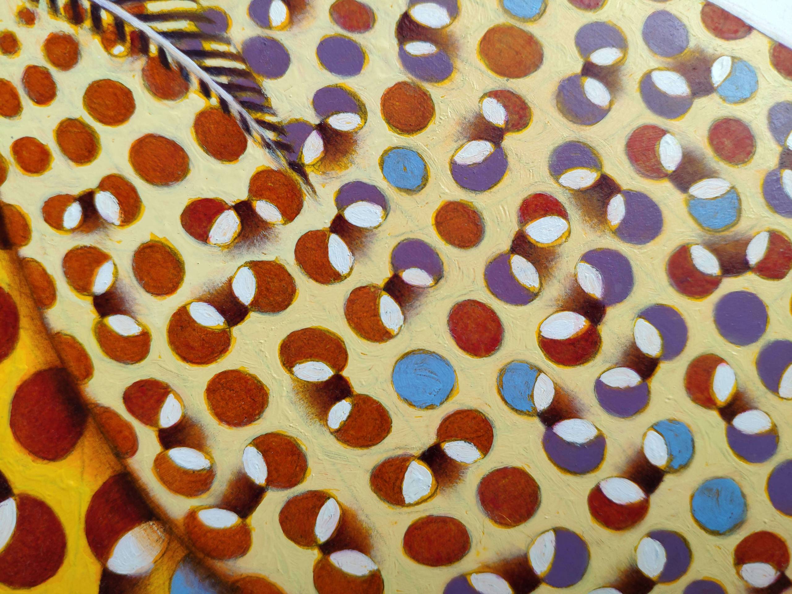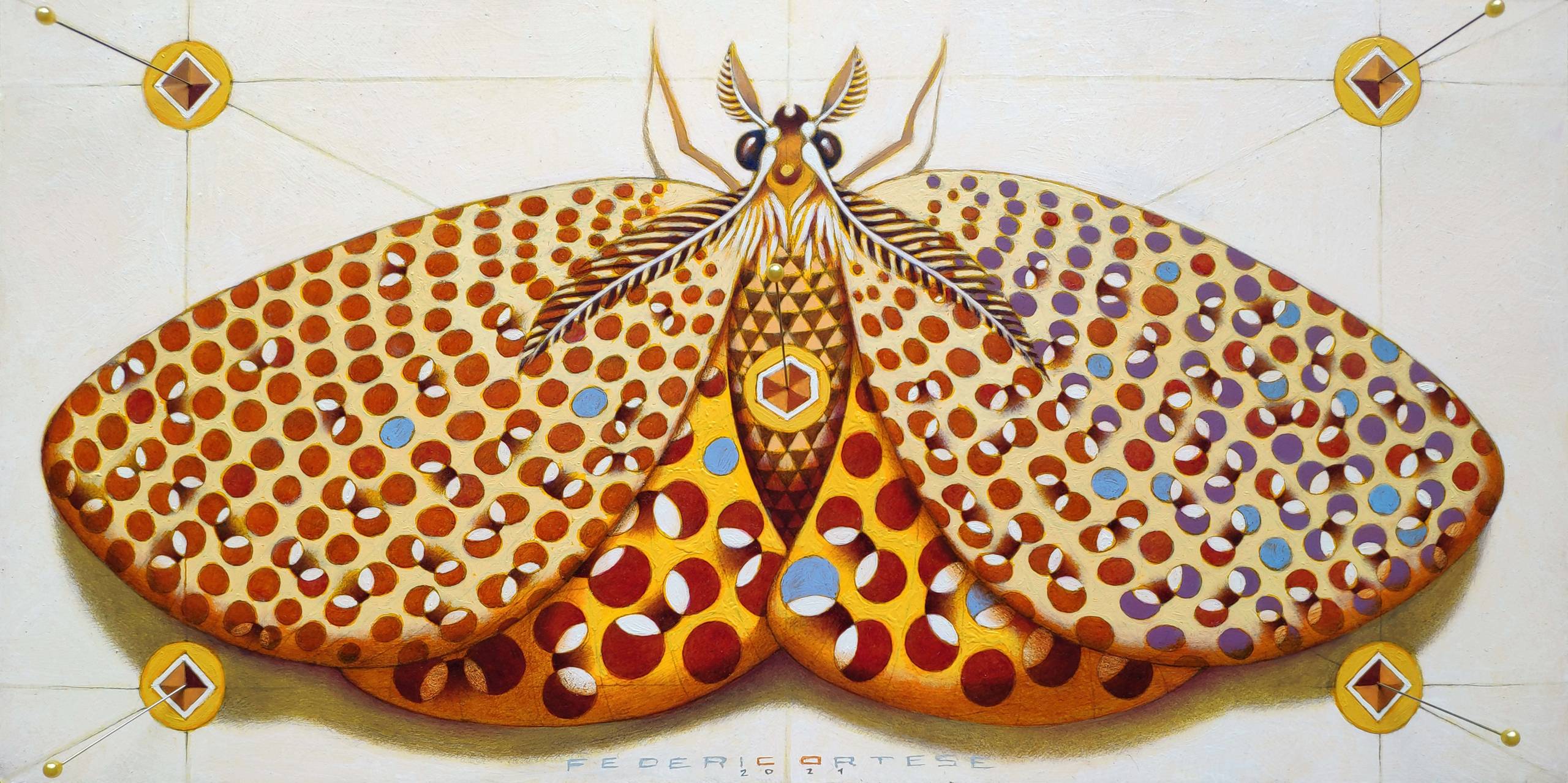 An original piece from the series “Please do not kill butterflies”, pins and oil on paper mounted on a wood panel. Please, all these dead animals. Of course, not every one of us can or want to become vegetarian. Sure, in some cases, maybe, the medical experimentation needs them to get results. But we really have to kill them for our frivolous activities? Is it necessary to have so many pink pigs die in front of a camera? Do we really need to dissect sharks in formaldehyde, to starve stray dogs tied to a chain in the corner of a gallery, or to make innocent ants go crazy in twisted tubes of plexiglas? To make these paintings, no butterfly was killed.