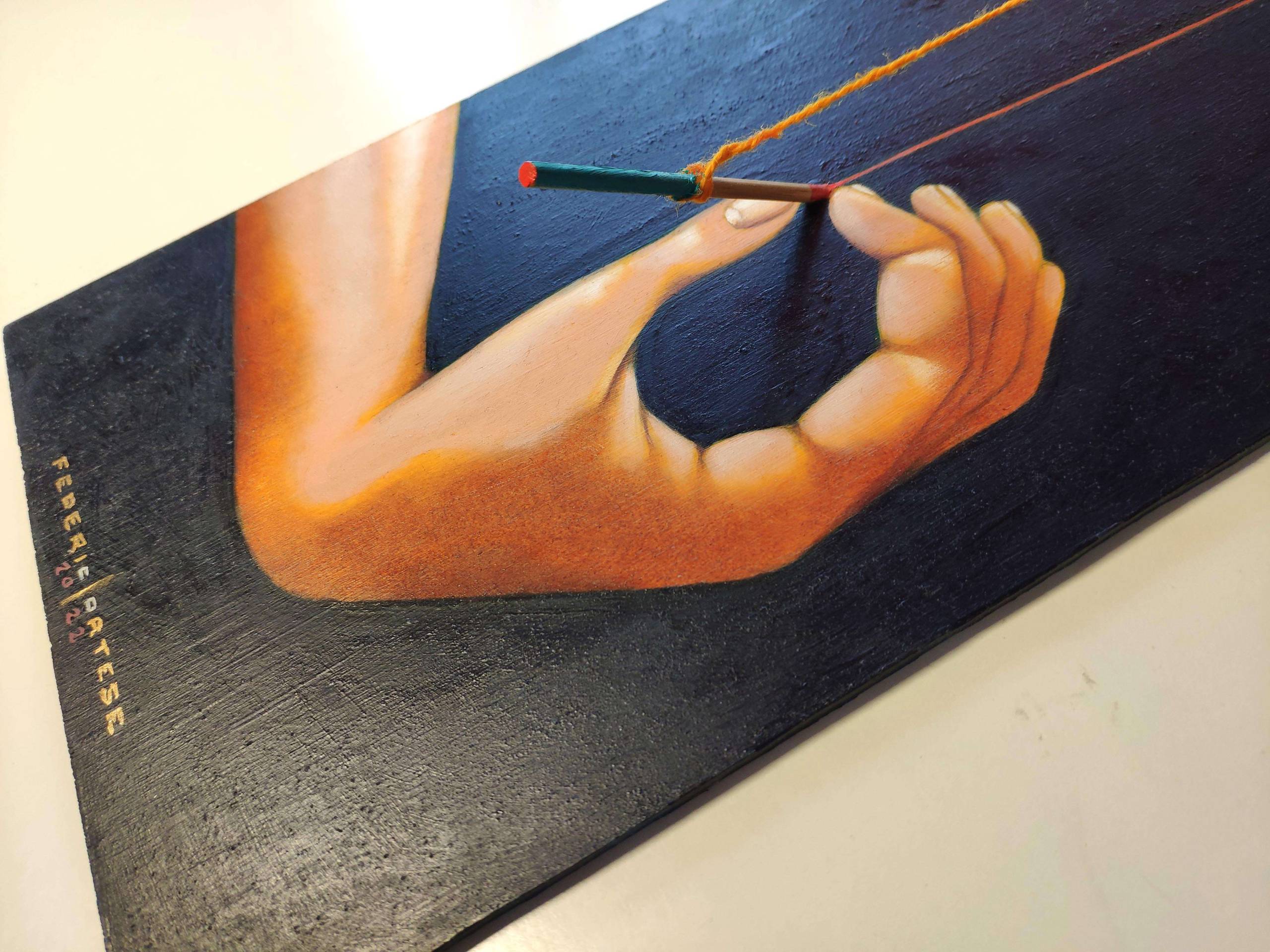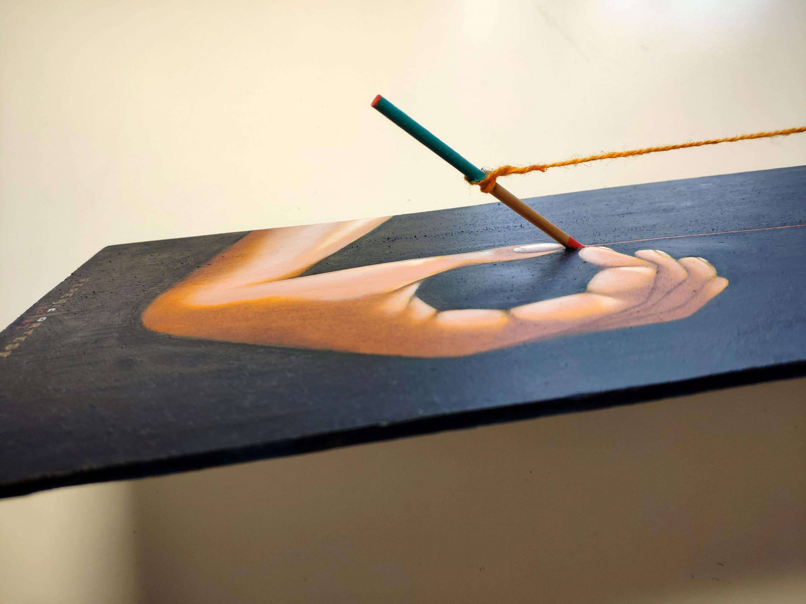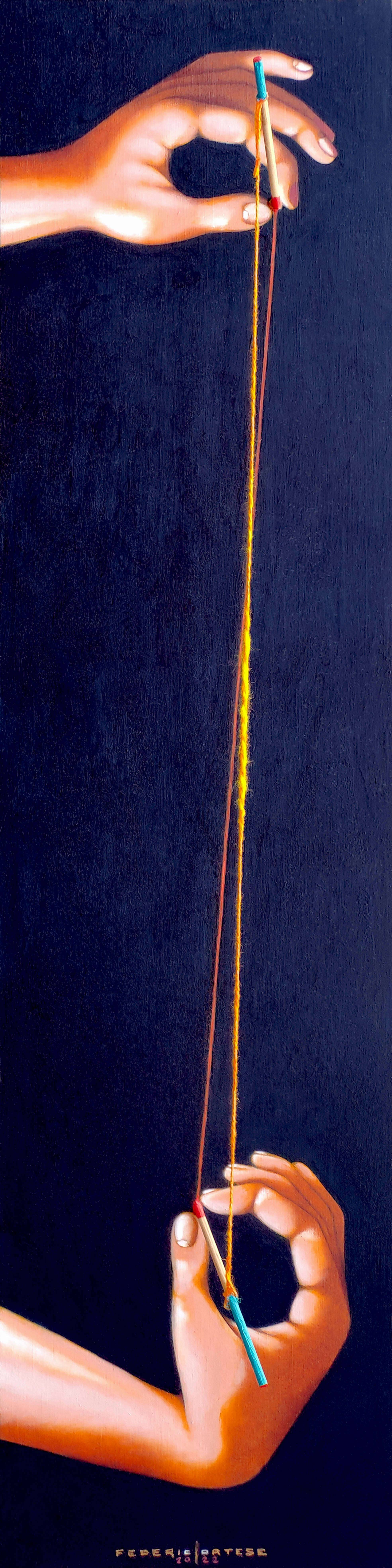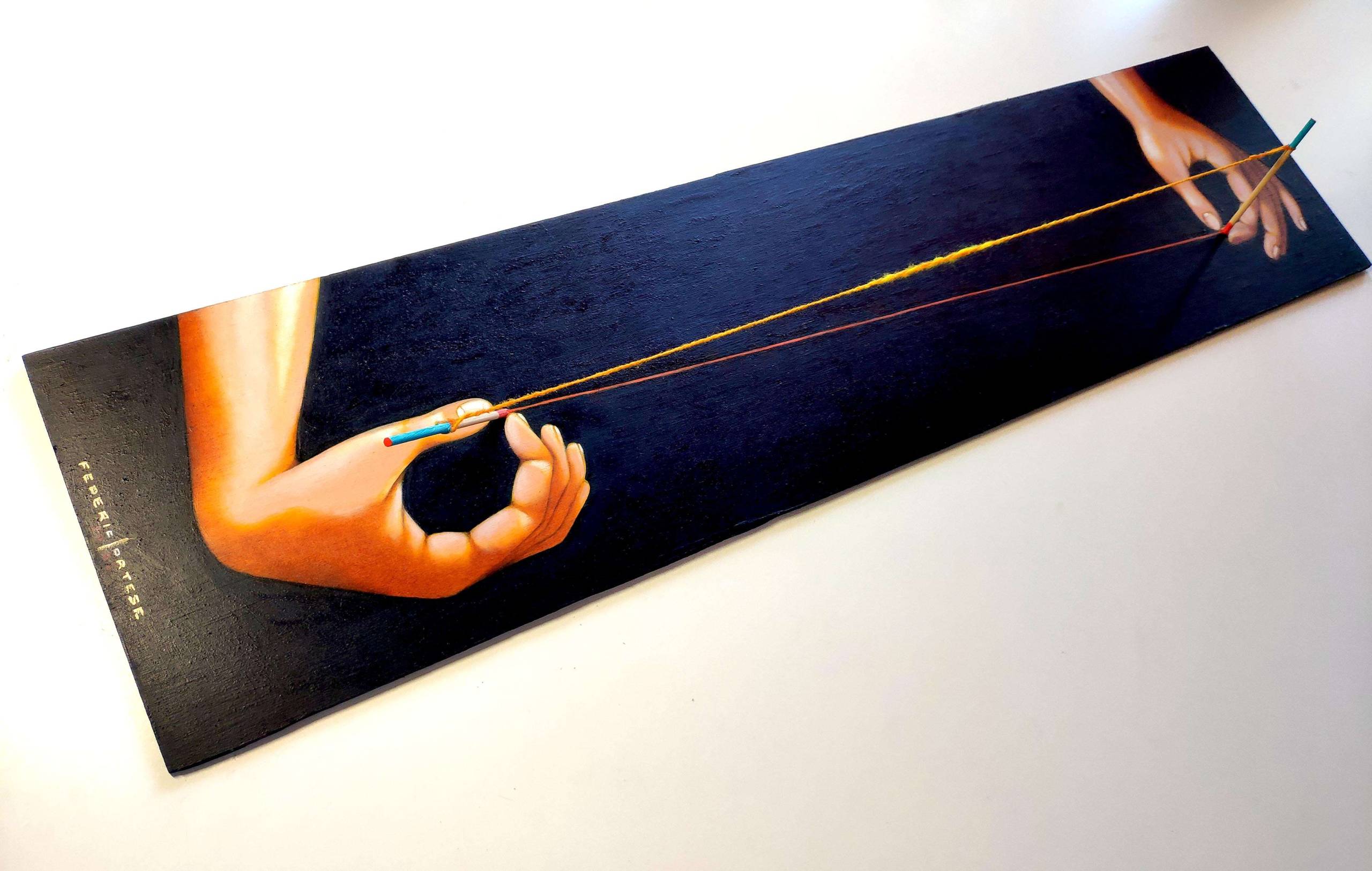 Oil on wood panel (plywood), with wood sticks applied on it. a yellow wool thread is stretched between the two sticks. Original sold.