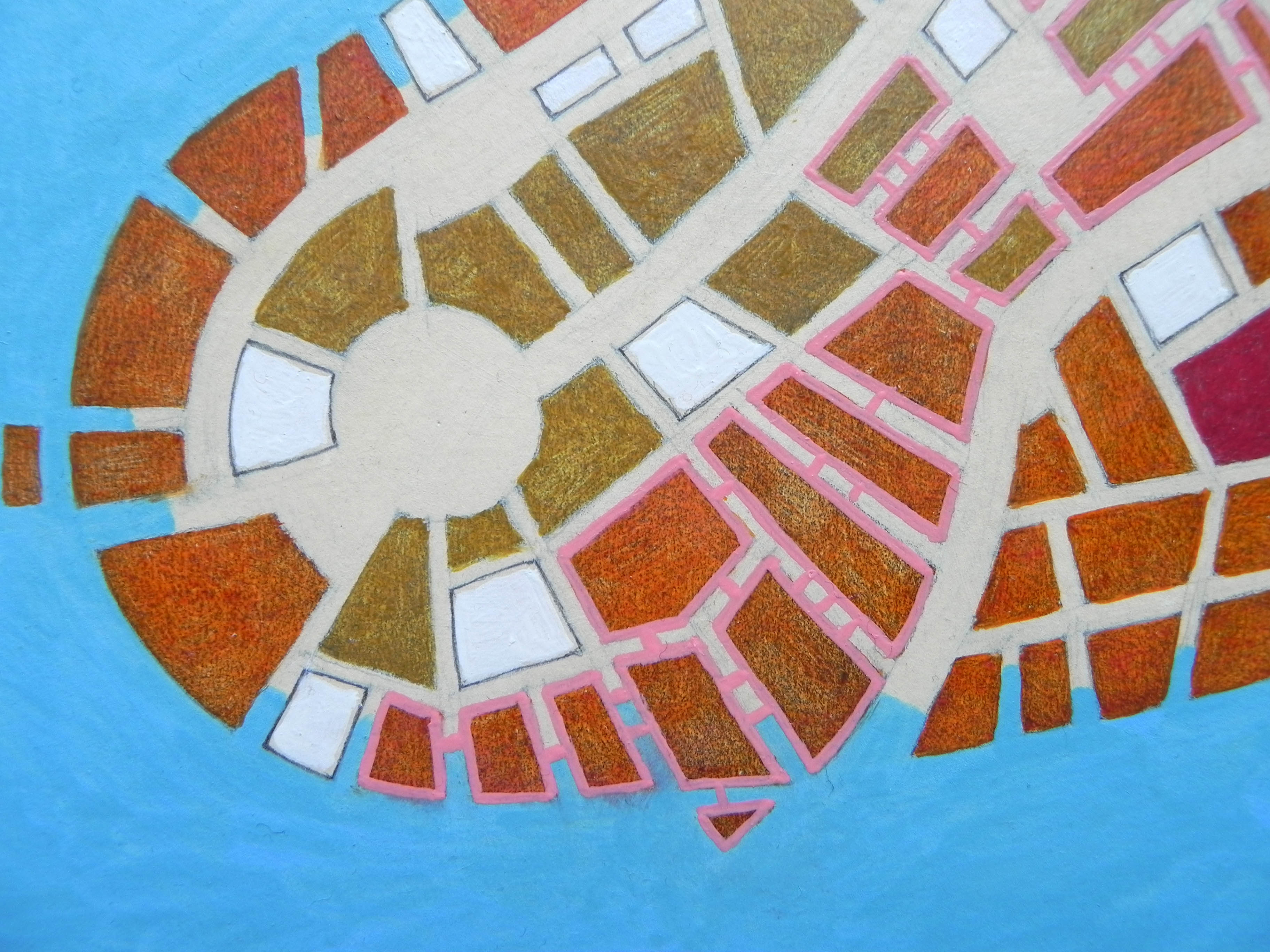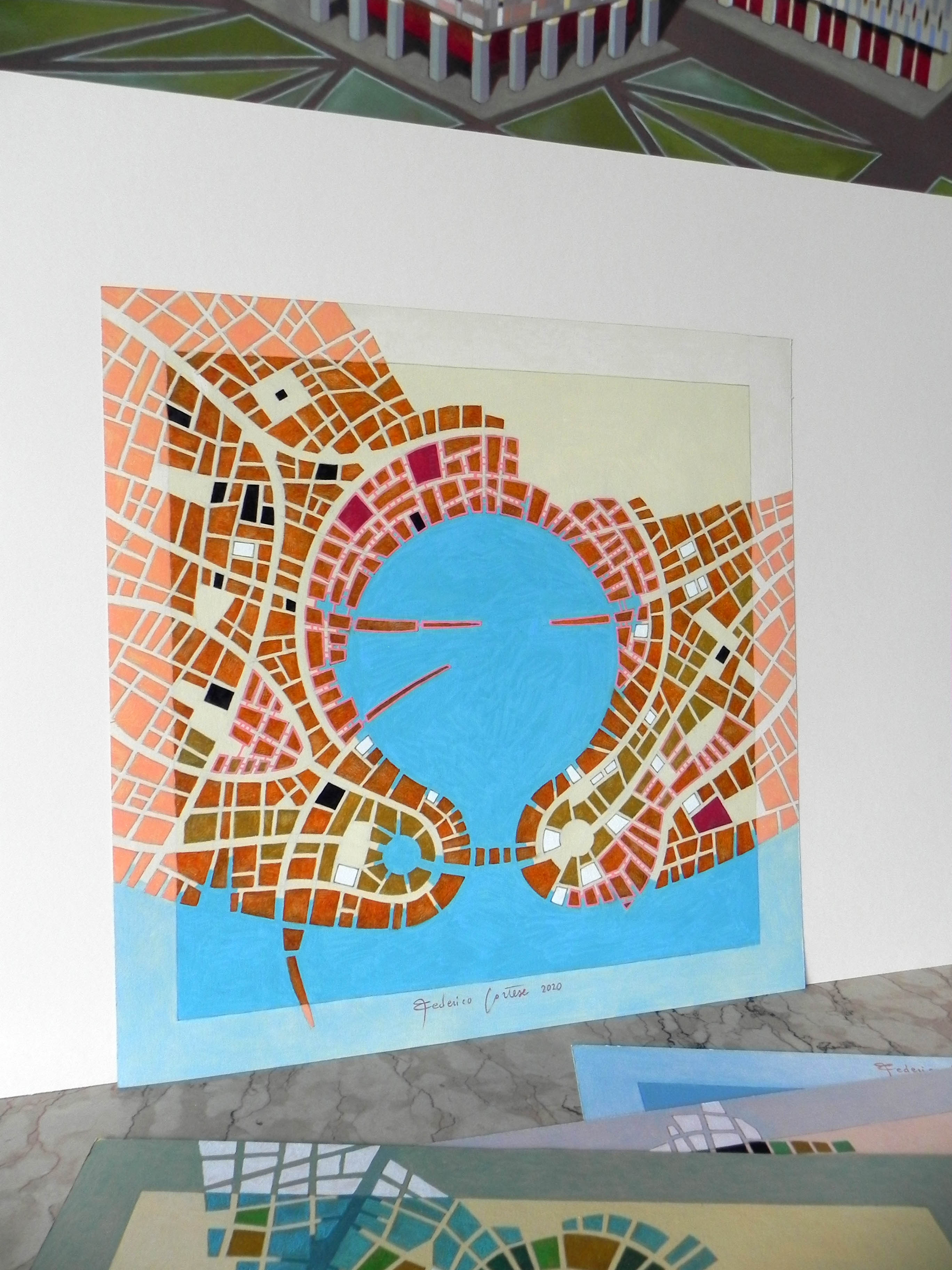 From the series “Code”, oil on thick paper, 40 x 40 cm (original sold). A map is an imprint, a sign of man in the landscape. An alien intelligence, observing our cities from the great distances of space, could interpret them as the characters of an alphabet, sort of messages, a code of signs, each one different from the other, each with its own meaning and its own syntax. This hypothetical alien presence may not even realize that these cities have a purpose and a function, which are the product of the way we have adapted to live on this planet, but it could engage in an attempt to interpret this unknown language, identifying the alphabet and associating to each character a precise meaning. Will we still be able to understand and share these new meanings, or will they have lost any sense for us?