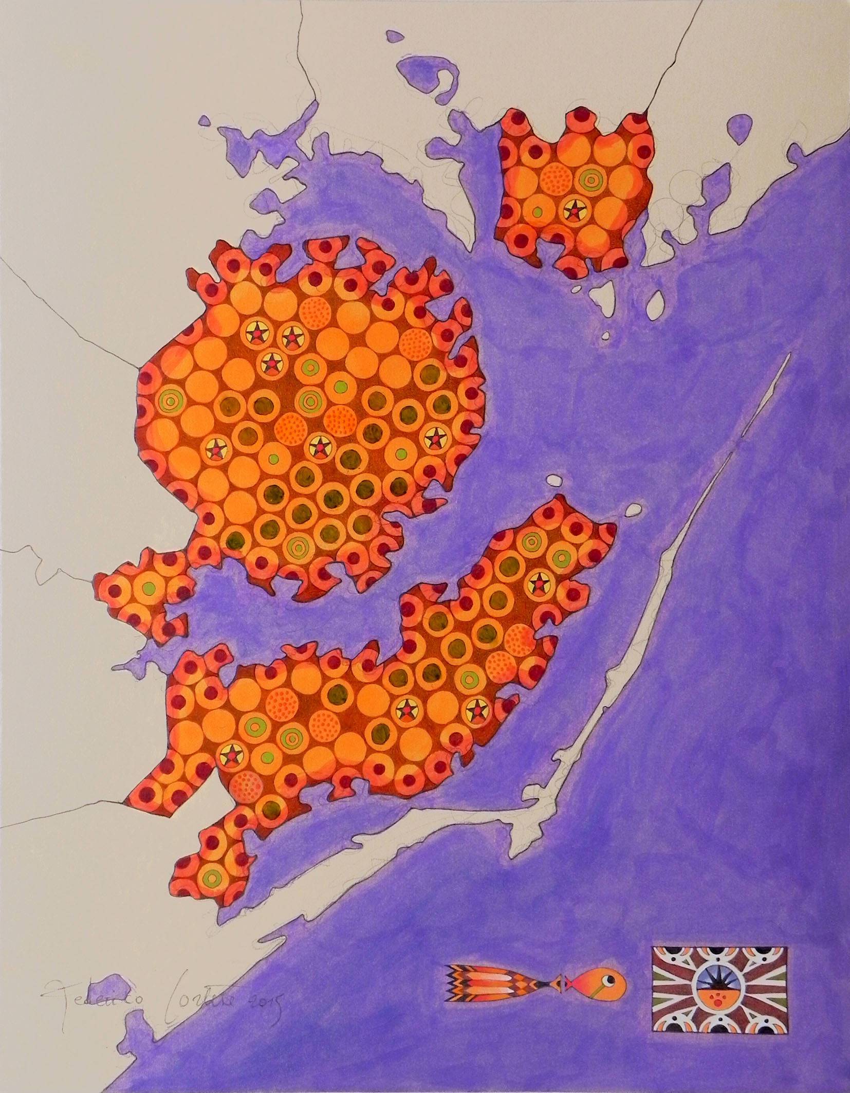 From the series “Nations”, oil and pencil on paper, 35 x 45 cm, 2015. In these drawings I create a map of an imaginary nation. The invention starts with the tracking on a perimeter that is the boundary. Within this boundary, with colored backgrounds, dashes and symbols, I can create new meanings and hierarchies between the various areas. But of course, everything is invented, and the more I can get away from real cartographic representations, the more the original significance weakens and gives way to new, unexpected interpretations. The point that originally represented the position of a city on the map can grow up to become a big bubble colored and decorated with new symbols, the tracks indicating roads and paths can be deformed and can be enriched with textures and hatches that change the meaning, the same boundary may vary in different parts of the map, becoming thick or thin, light or dark, hard and defined or changeable and permeable. The final result is no longer about the geography of a place, but rather the representation of something abstract, like a memory, a mood or an emotion. I usually paint on stretched canvas, or fine art paper prepared for oil painting. Once ended, the painting is finished with a coat of UV varnish to protect against sunlight and dust. The canvases are painted on the sides too, so they are ready to hang. My sold works are never rolled but always packed flat. I put them between two sheets of acid free paper with paper or cardboard protection for the corners, than close in a plastic envelope. The envelope is stiffen with a sheet of polystyrene on both sides, and the whole thing is completed with layers of cardboard. The package is also protected with bubble packaging. Usually the artwork is shipped in 2/3 days after receiving the payment. All my artworks are original unique paintings, signed. Certificate of Authenticity included. Thank you for your interest!