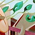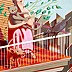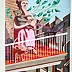 Oil painting on thick paper, 2023. A woman in a dressing gown, on the balcony of a city building (the city can be seen in the background). With her a dog and a cat, probably her family. An unexpected encounter takes place on the balcony. Will it bring good or bad news?