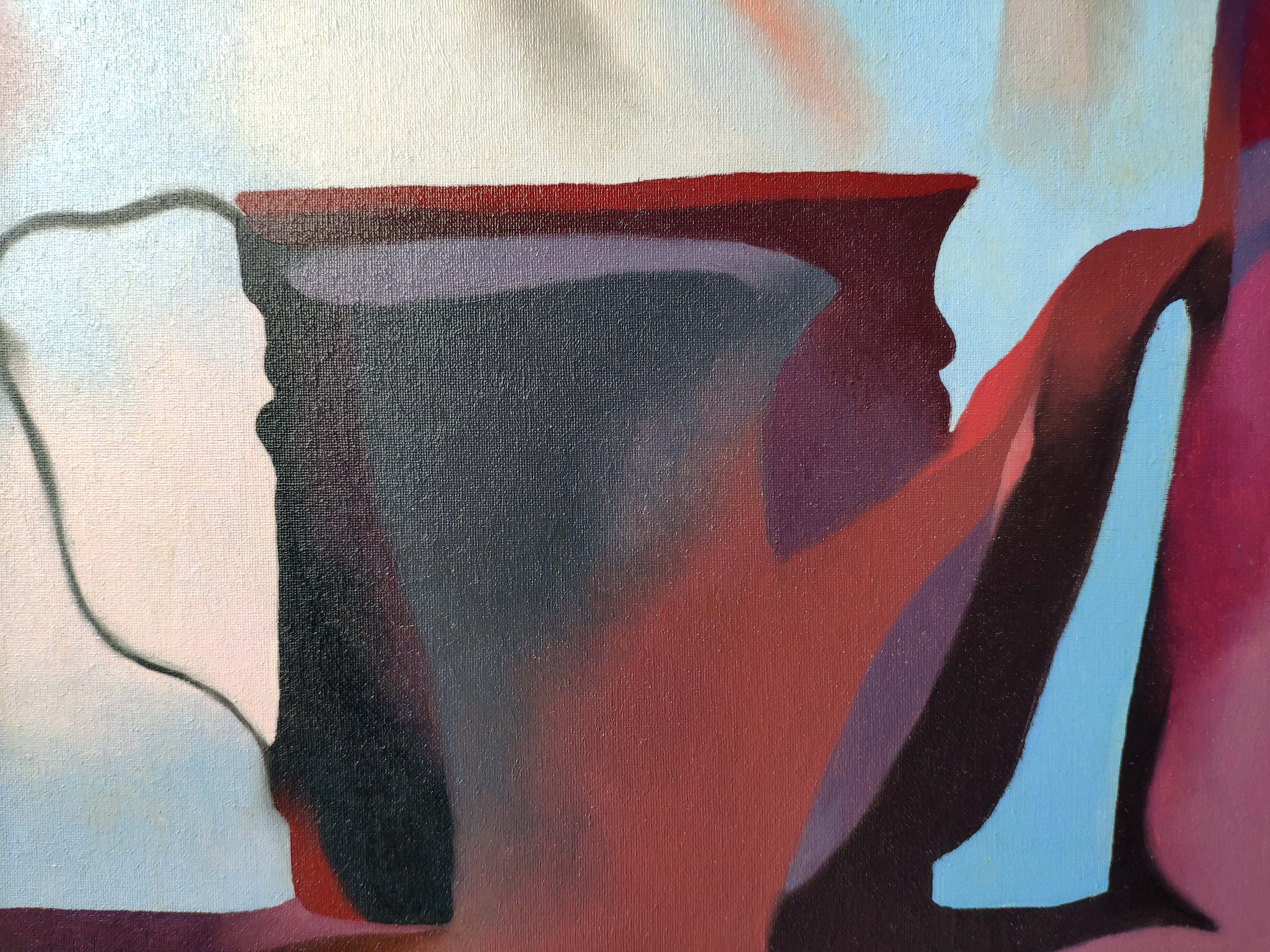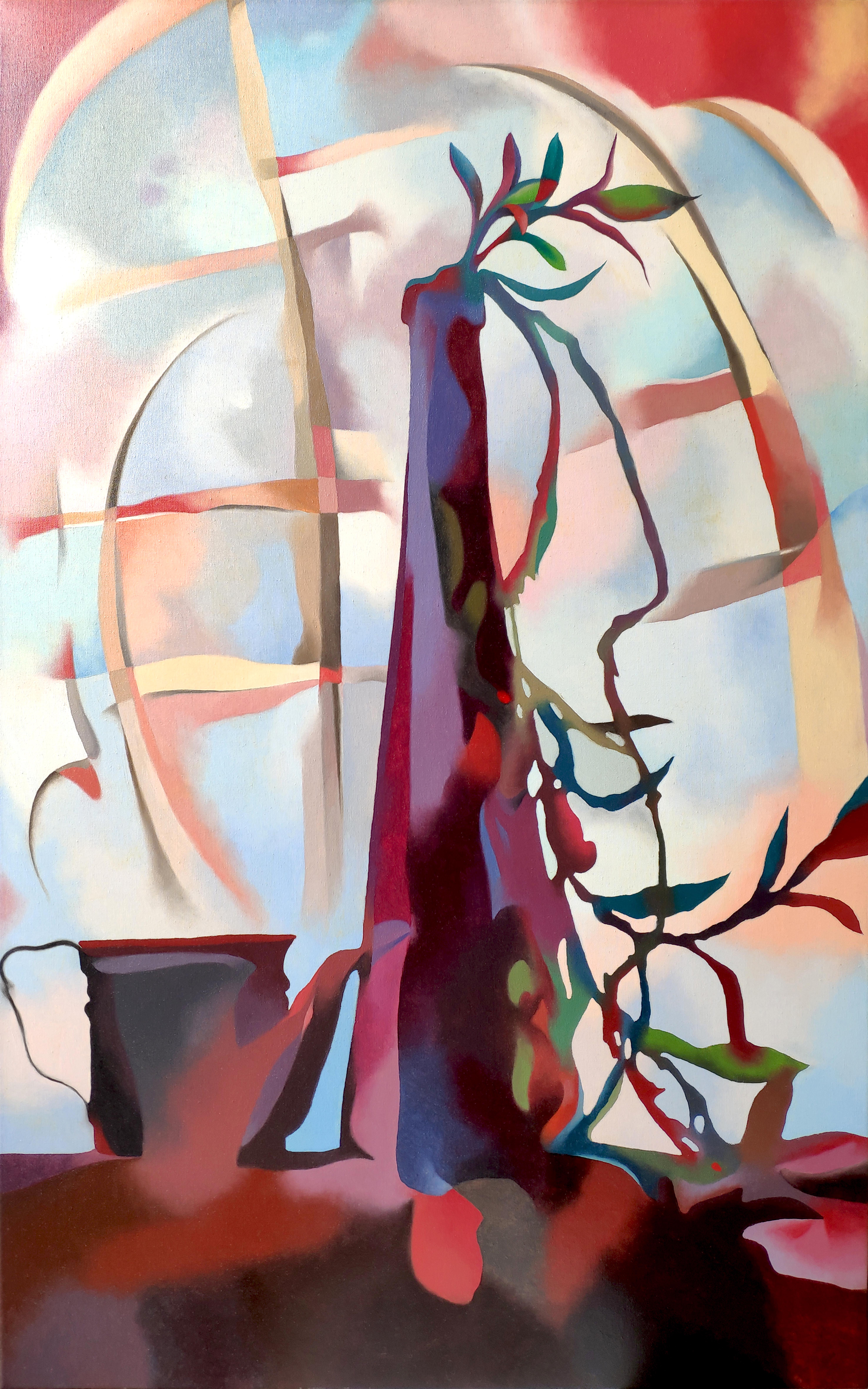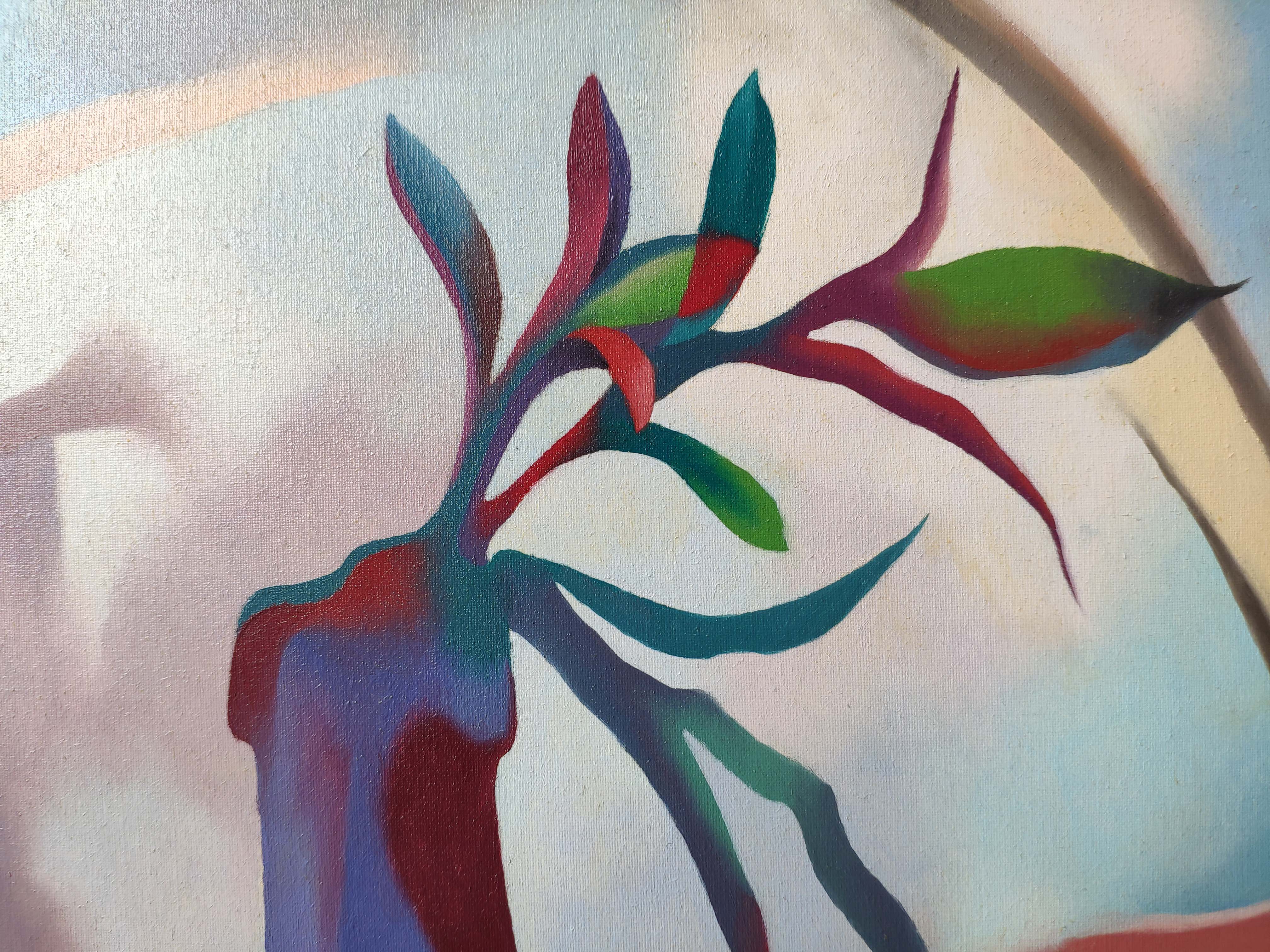 Interior view, still life. A stylized long vase or bottle with a plant inside. Oil on canvas, 50 x 80 cm, 1993.