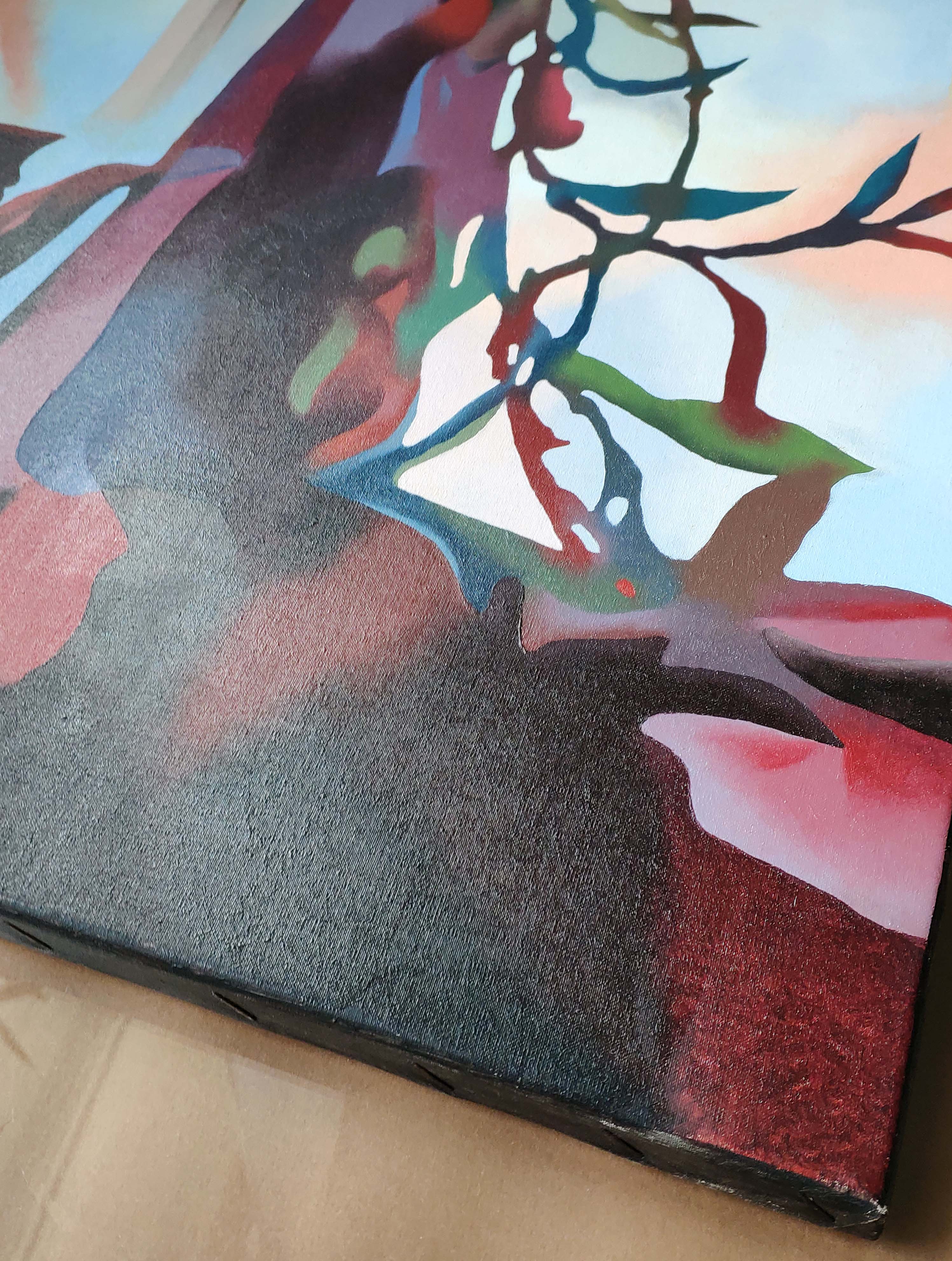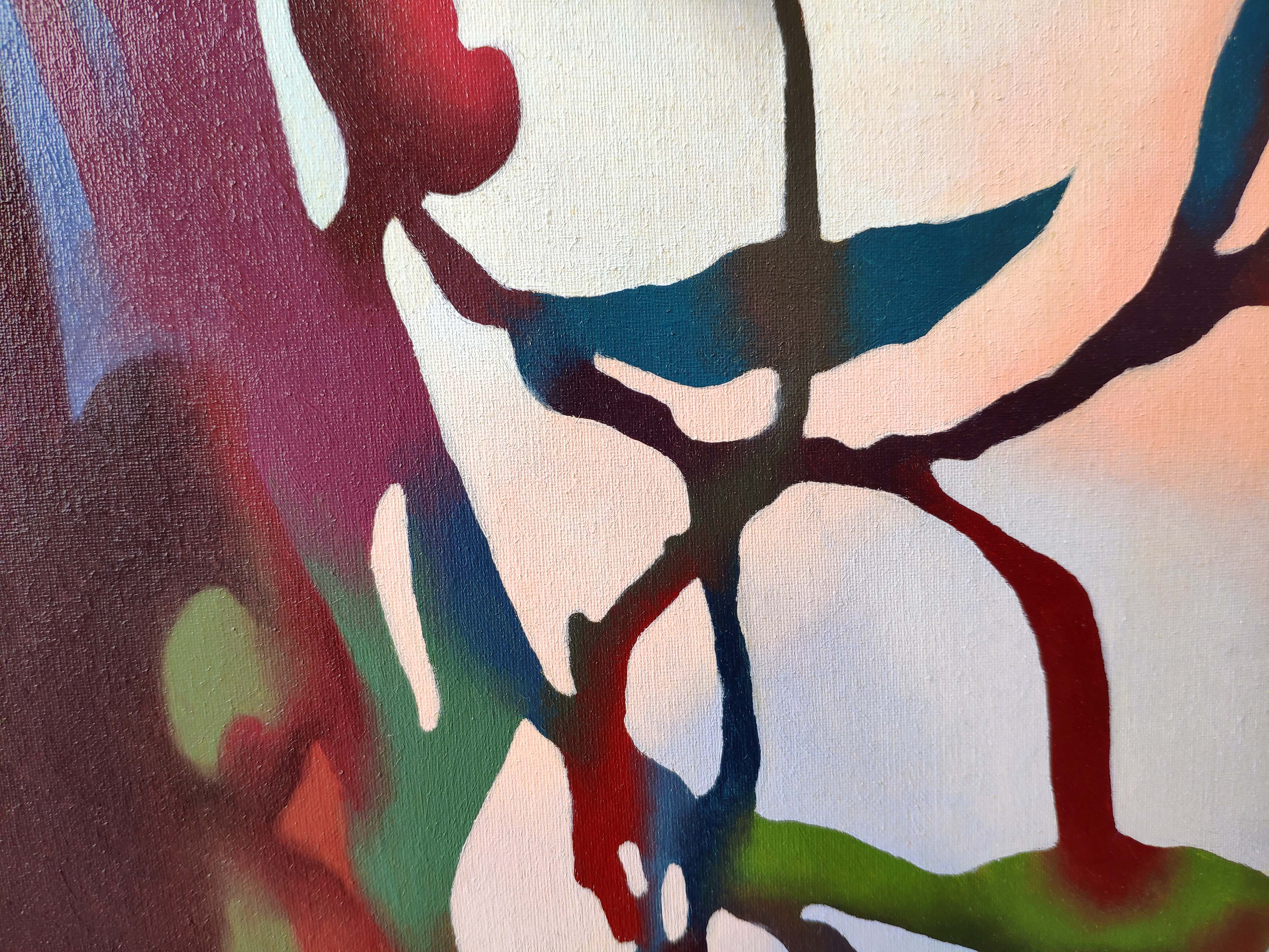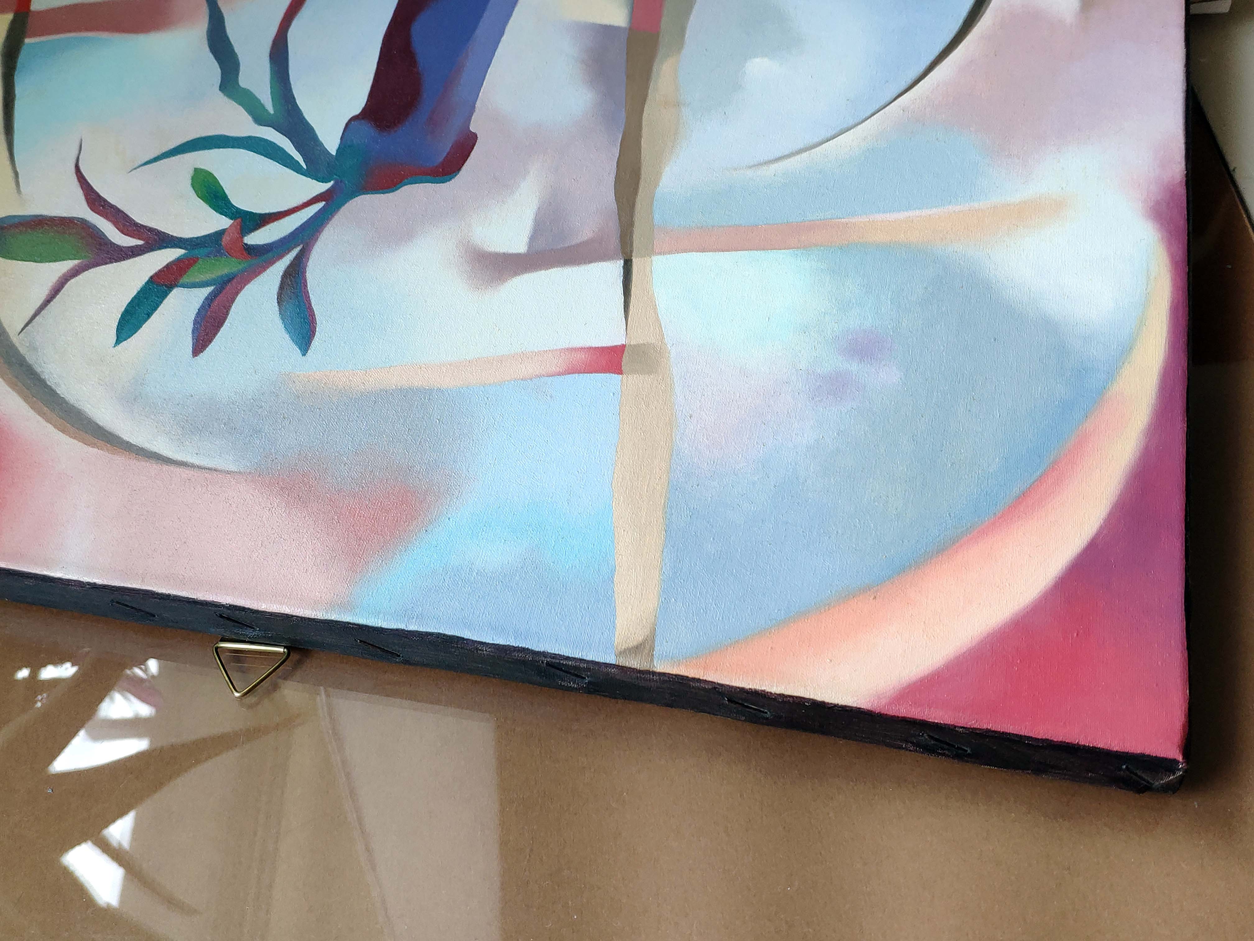 Interior view, still life. A stylized long vase or bottle with a plant inside. Oil on canvas, 50 x 80 cm, 1993.
