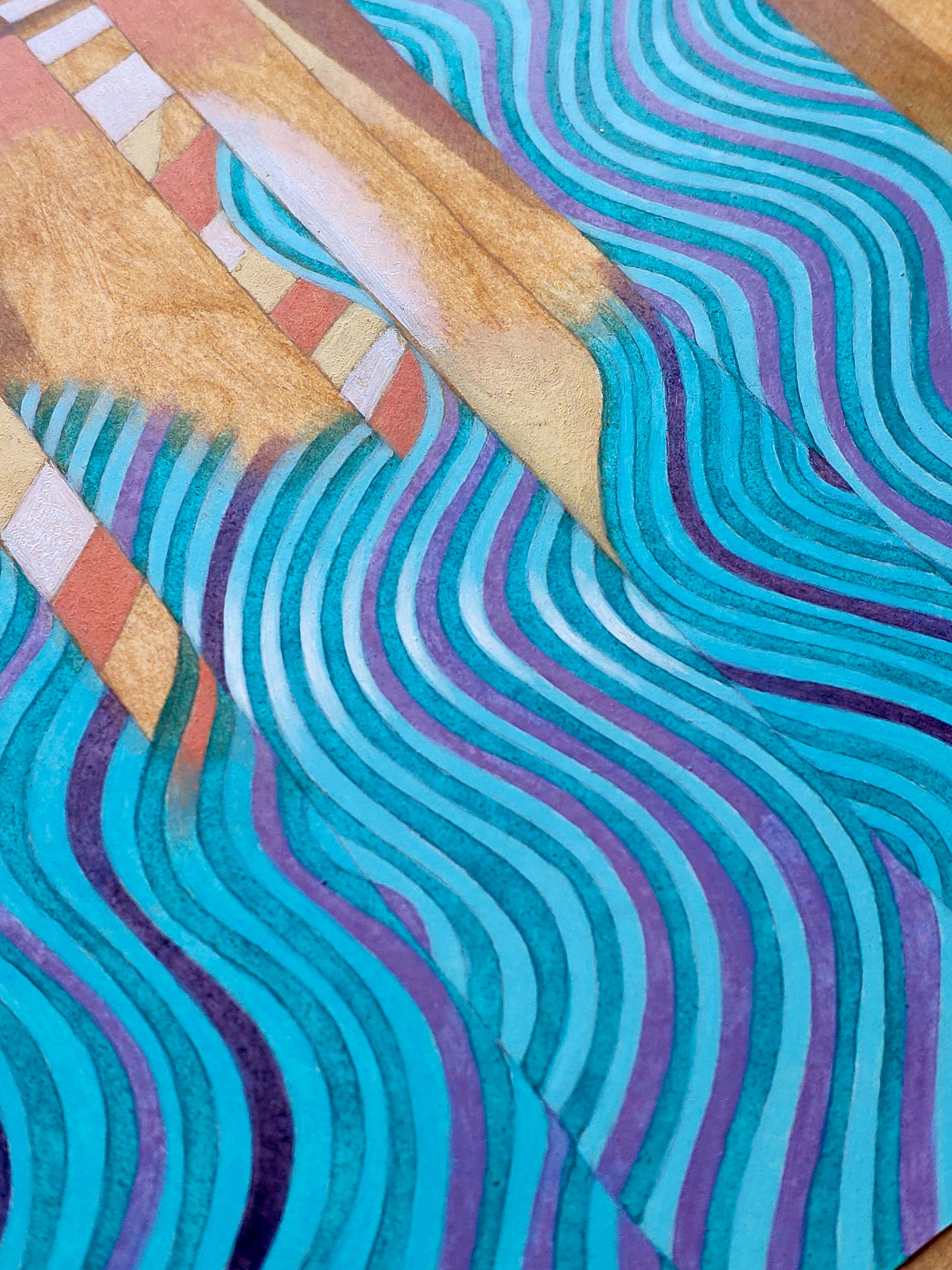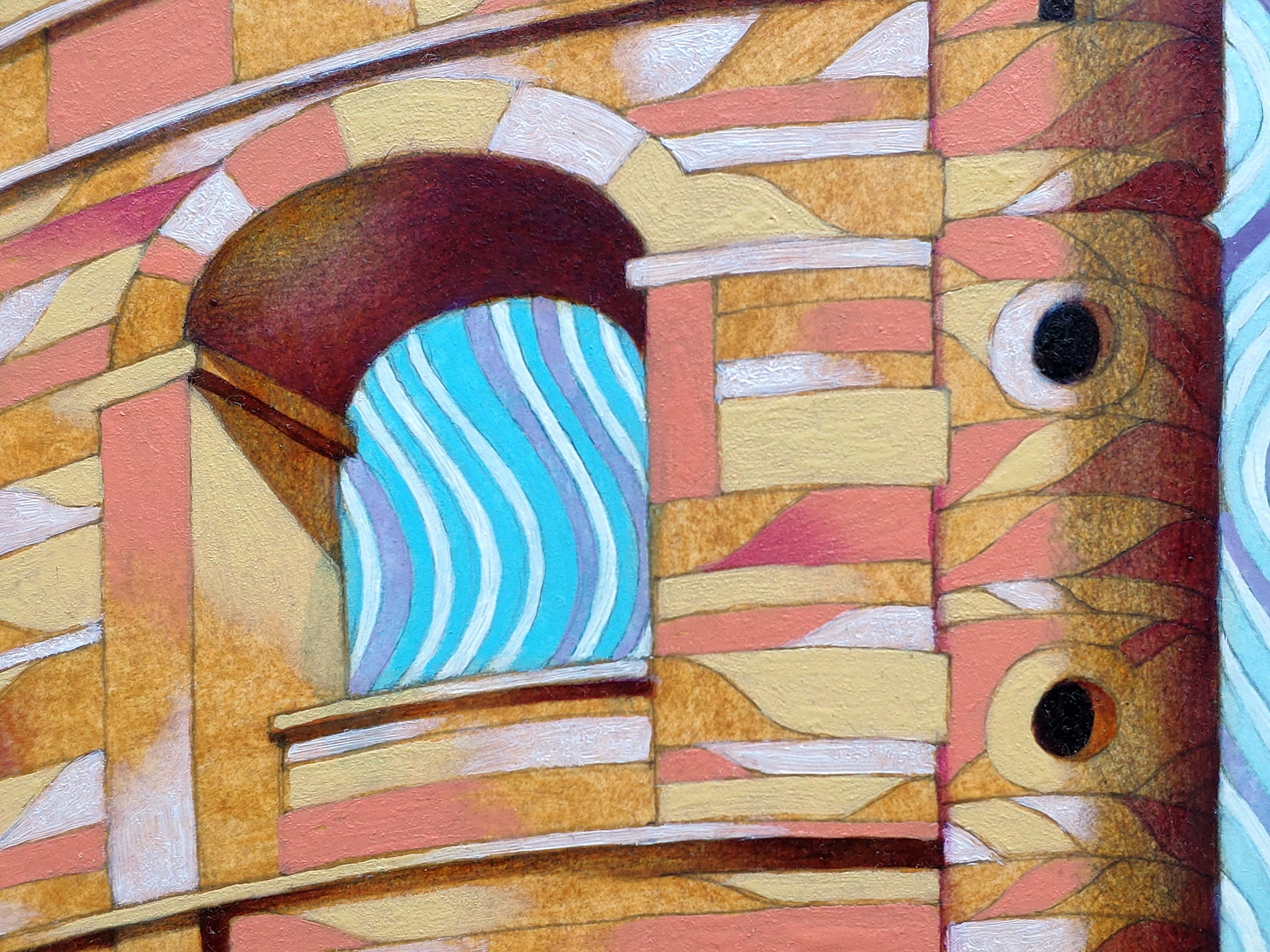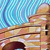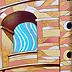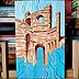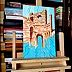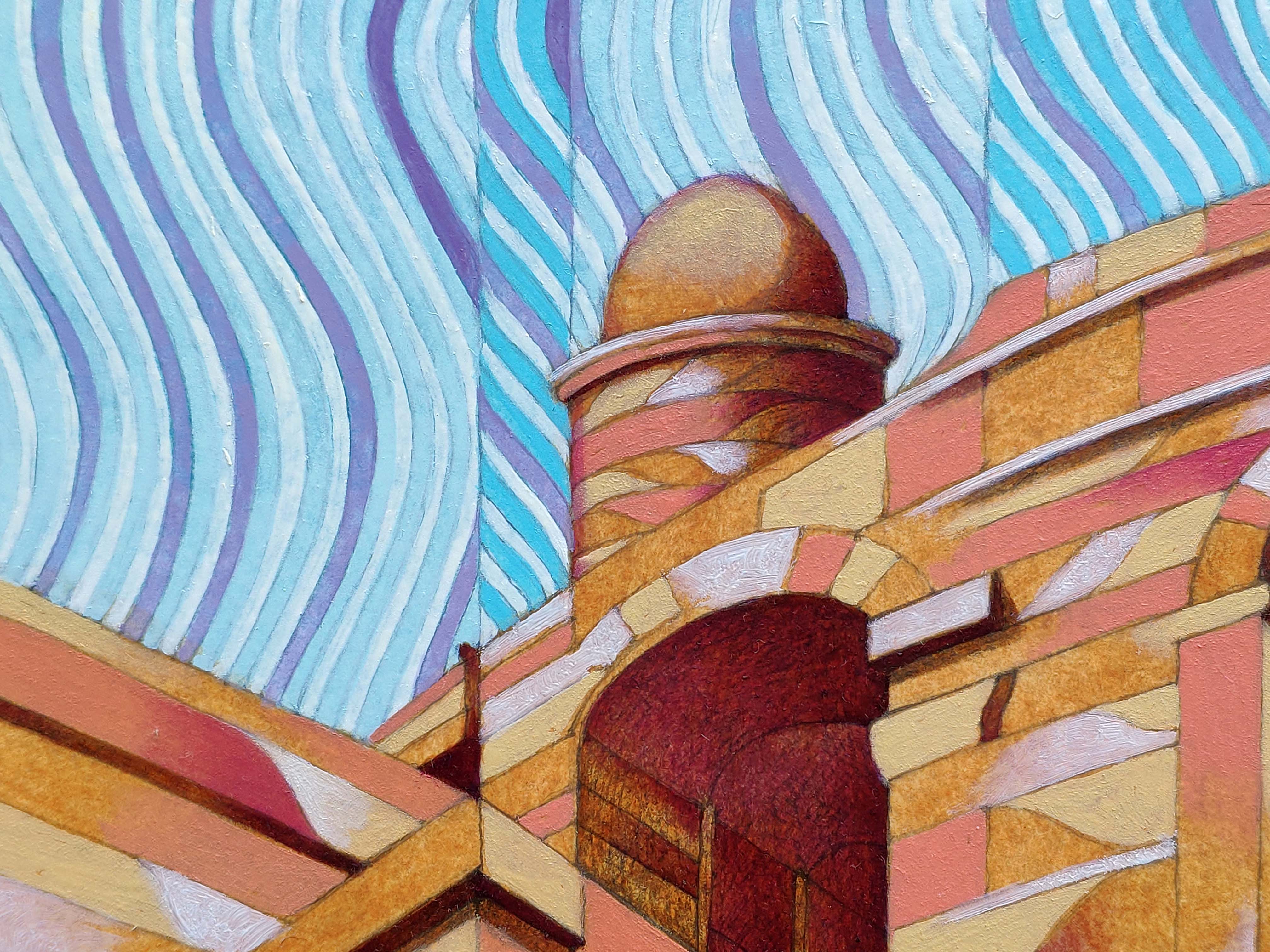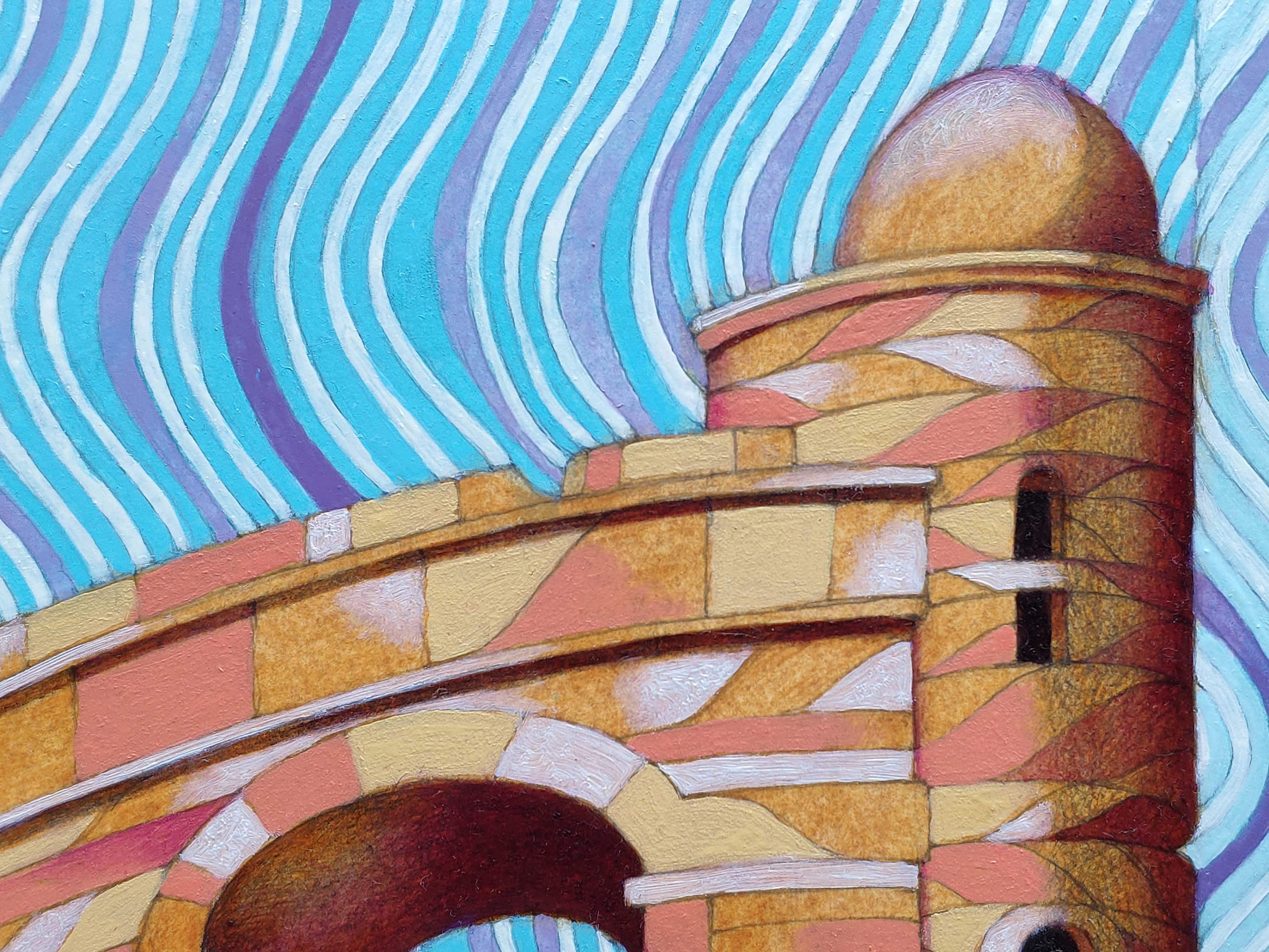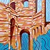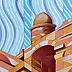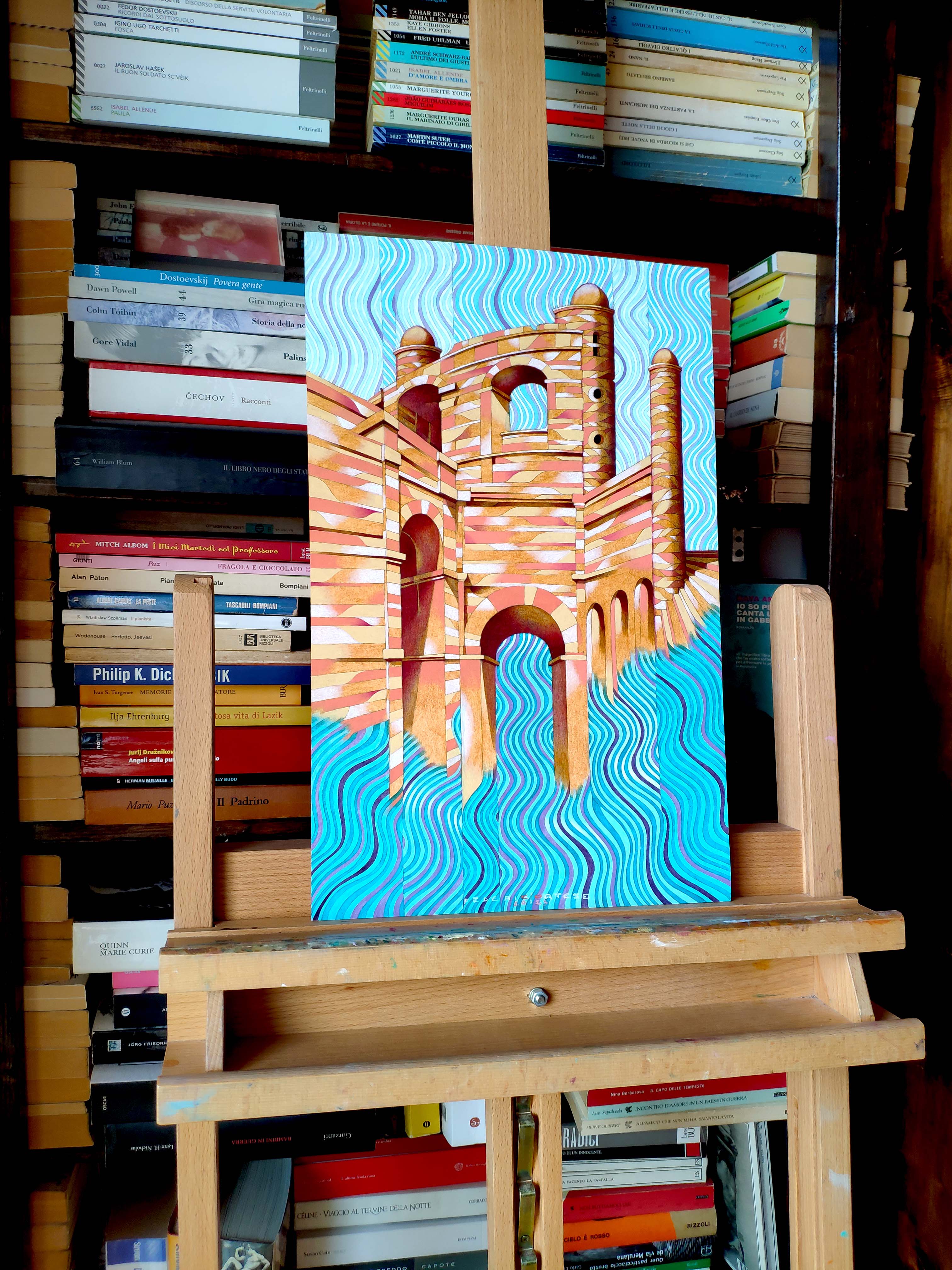 Oil on thick paper, 2023. An original piece from the series “Houses on the water”: In this series of paintings I try to blend together the architectural and monumental elements of a place or a city. It’s a bit like recalling to memory a journey made in the past: it will produce many confused and overlapping images. The title of the series wants to reclaim the idea of a fluid memory, moved like water, and confused like a mirage.