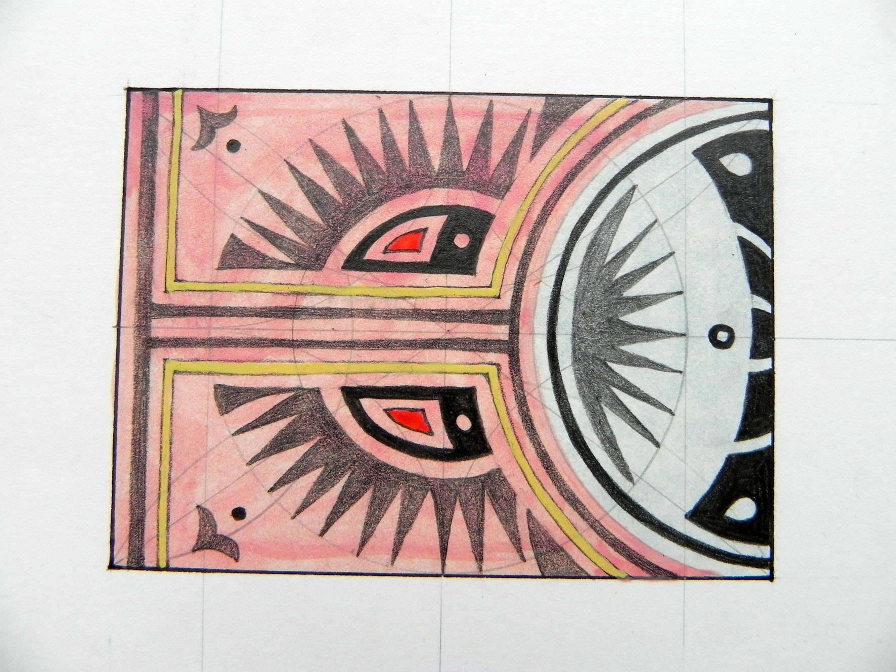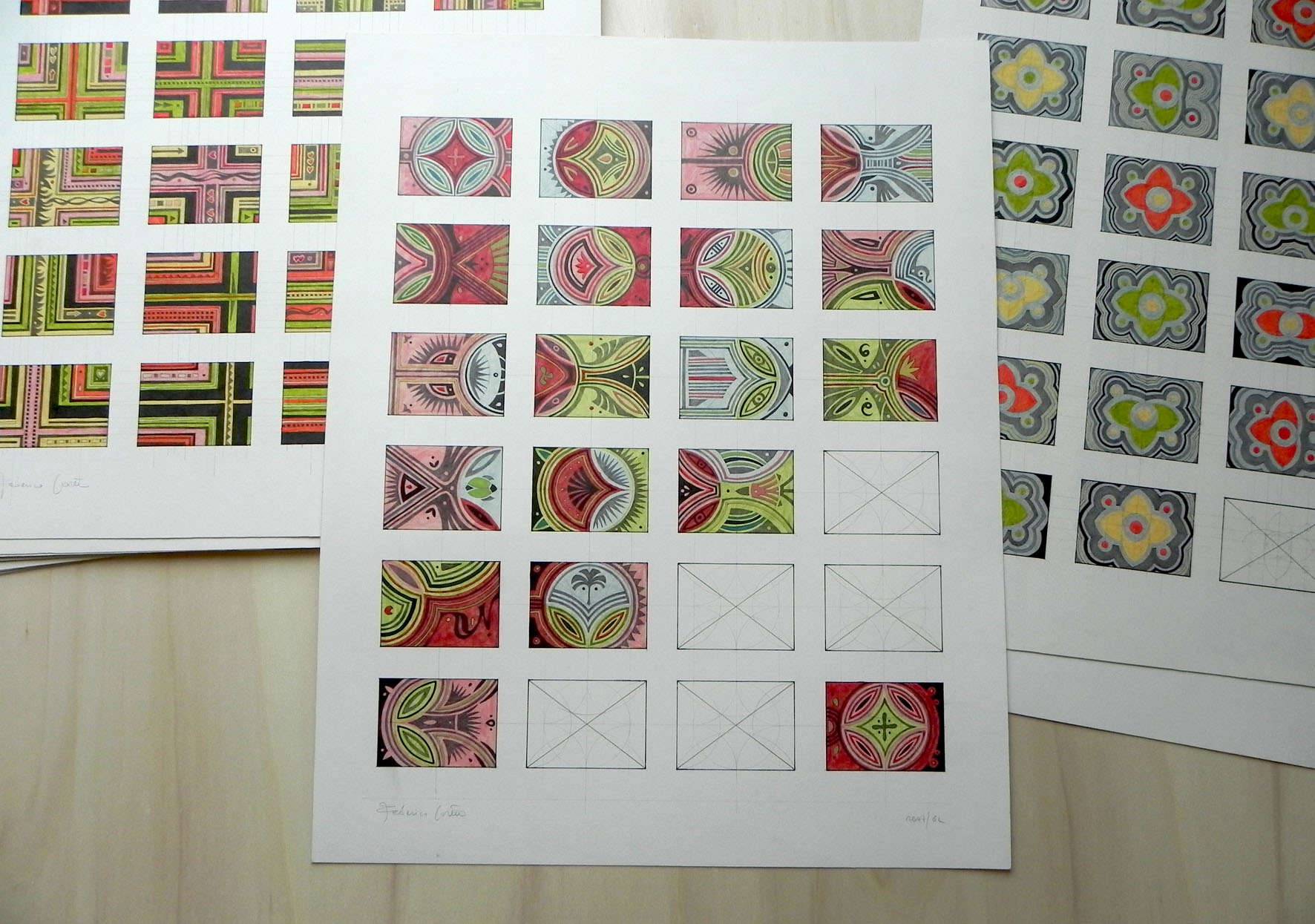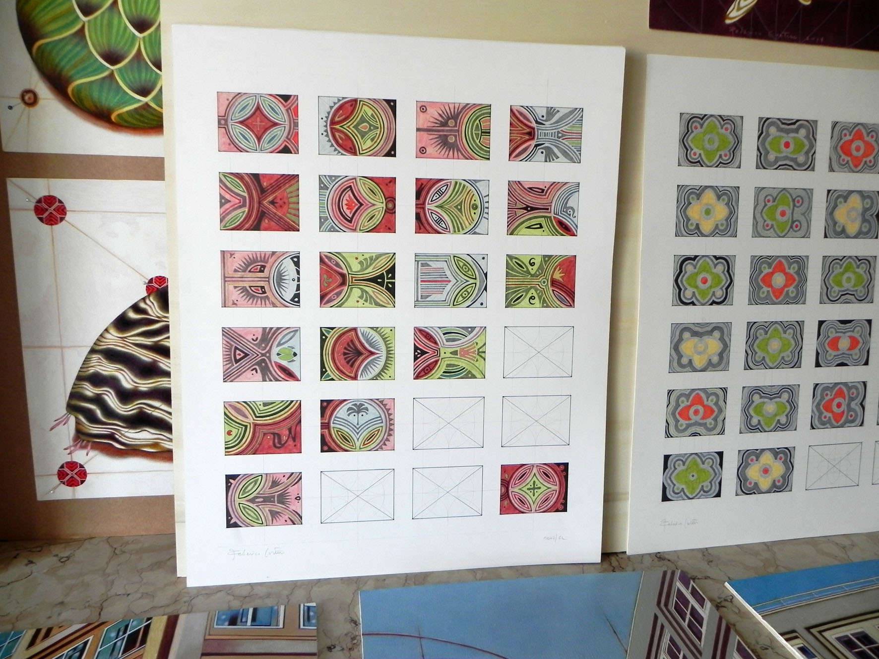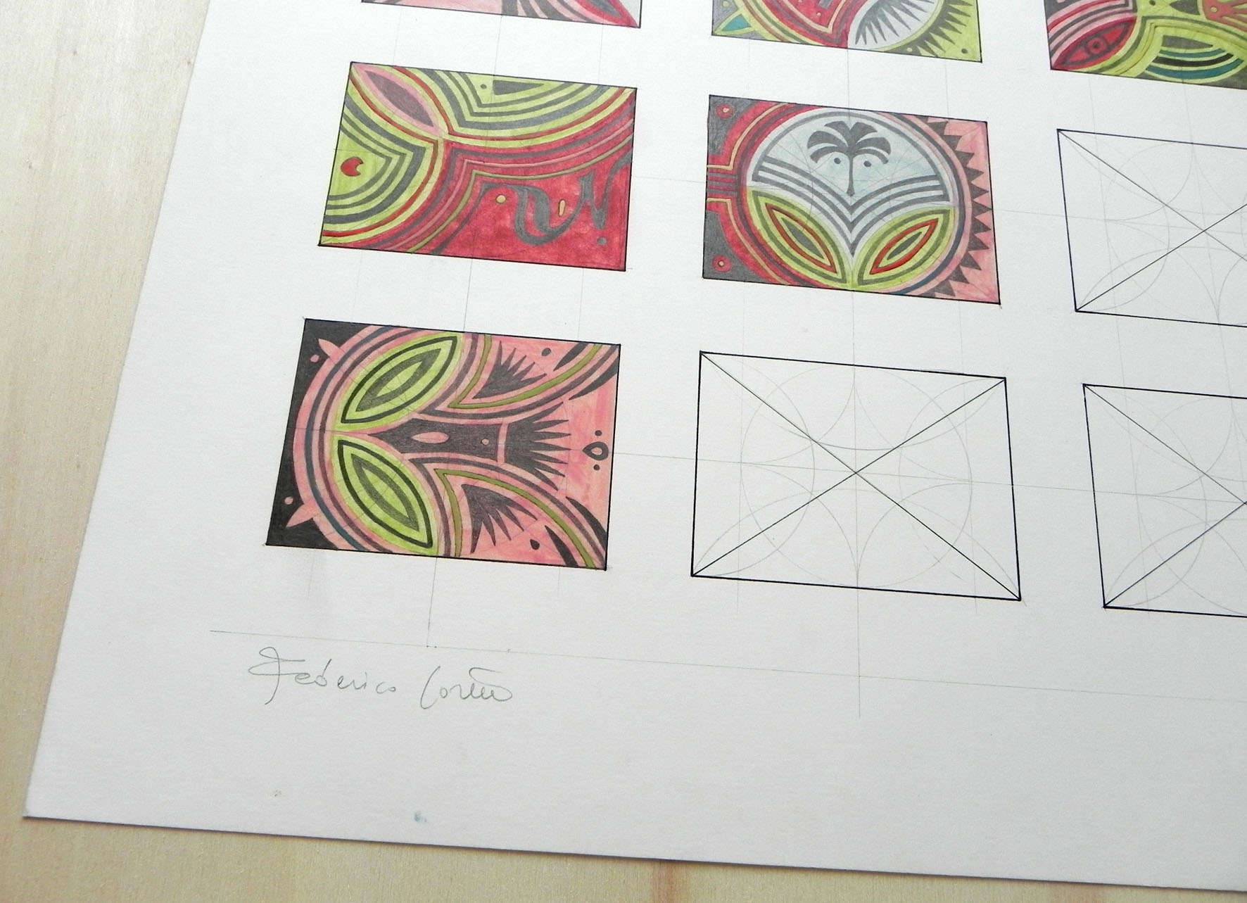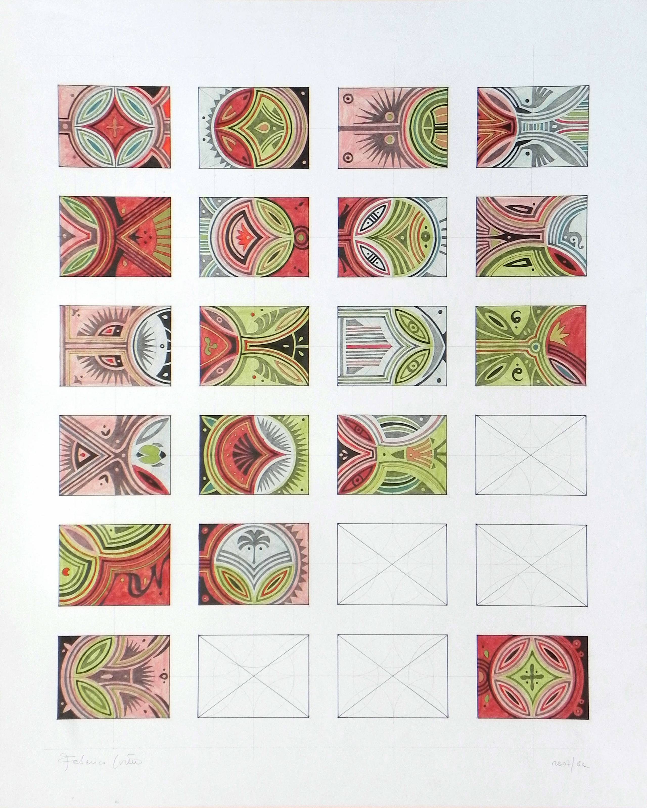 An original piece from the series “Flags”; oil pencil and ink on paper; 44 x 55 cm, 2007. During the Winter Olympics in Turin in 2006 a large celebratory structure gathered the flags of all participating countries. These flags were displayed one next to each other, in a large matrix, which revealed that the criteria of composition and the formal rules that generated them were more or less equal for all. Also in this series each drawing is a matrix, and each element of the matrix reproduces always the same basic geometric structure, within which, the color fields, the decorations, the shades and symbols may change, in an almost infinite variation. Each small rectangle is a flag, independent and completed in itself, but linked to the other by the formal rules that generated them. Each flag is a possibility in an infinite number of possible variations, where the final choice of a single element has been delayed or has not been accomplished at all. Each drawing is a series within the series.