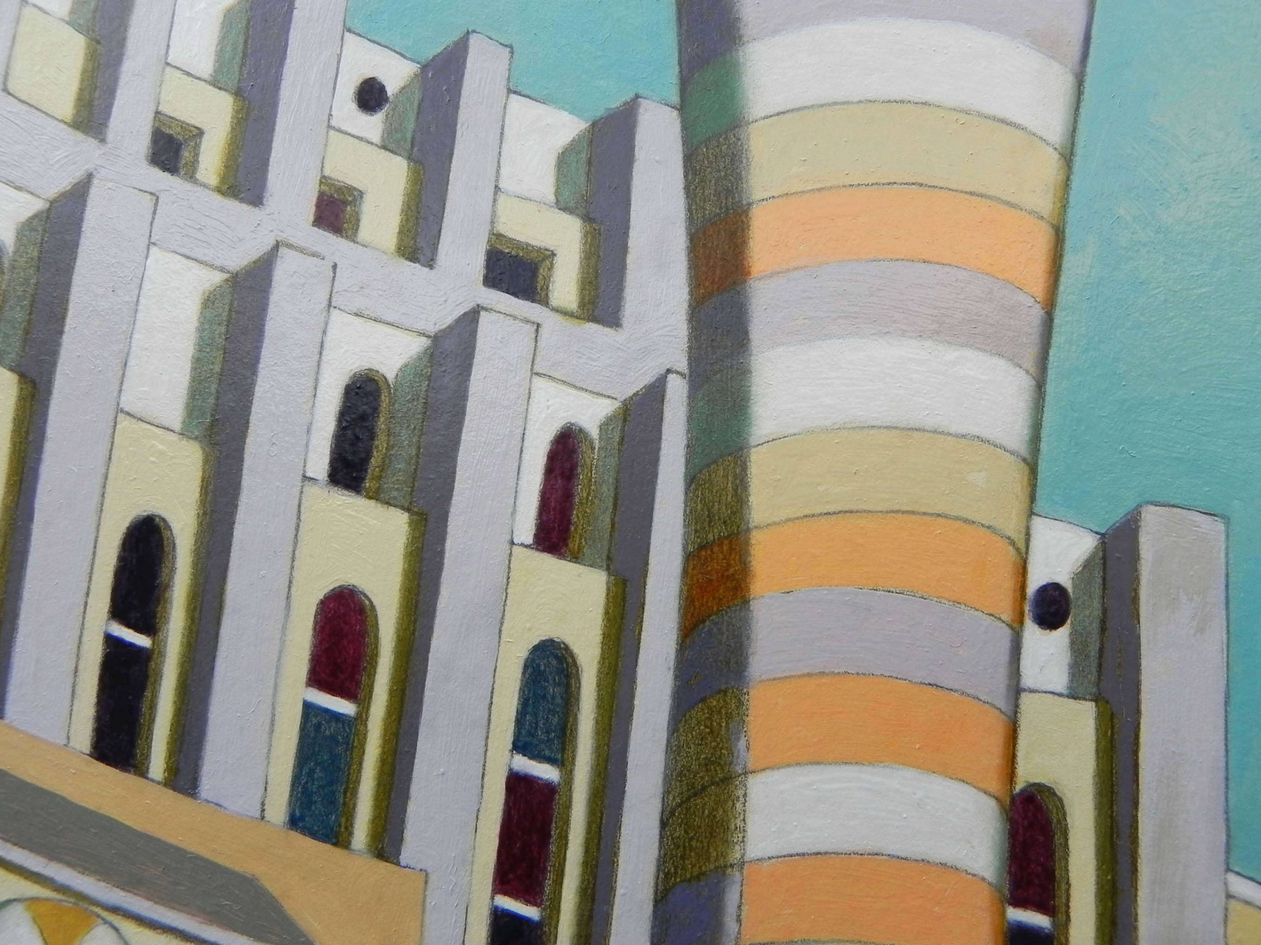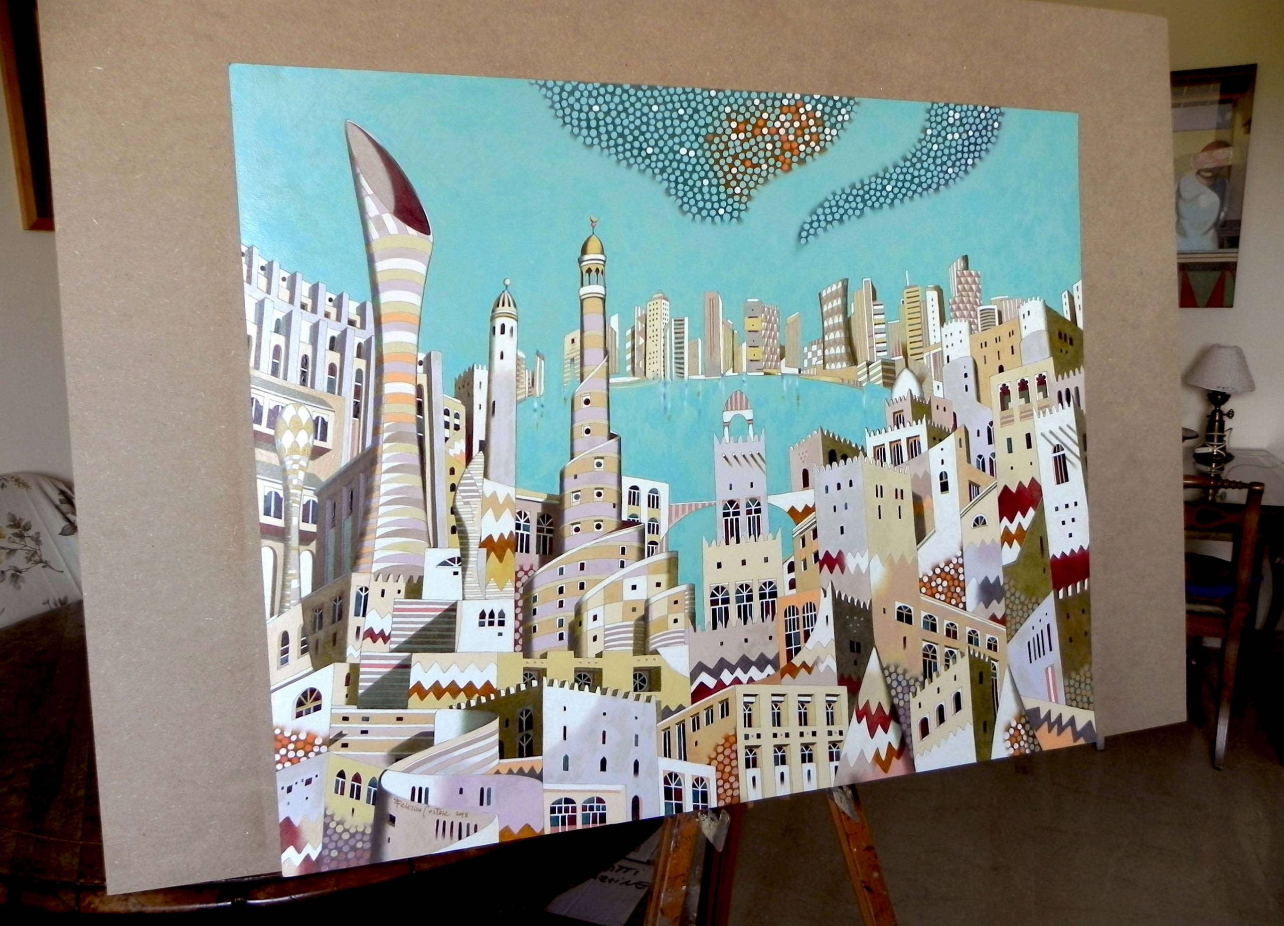 Original sold - This painting is part of a series of pieces that were commissioned from the FIRST QATAR REAL ESTATE DEVELOPMENT COMPANY. The copies of these paintings have been used for the wall decor of the rooms of the new Hilton "The Pearl" in Doha, Qatar. In this series of paintings I try to blend together the architectural and monumental elements of a place or a city. It 'a bit like recalling to the memory a journey made in the past: it will produce many confused and overlapping images. The title of the series wants to reclaim the idea of a fluid memory, moved like water, and confused like a mirage.