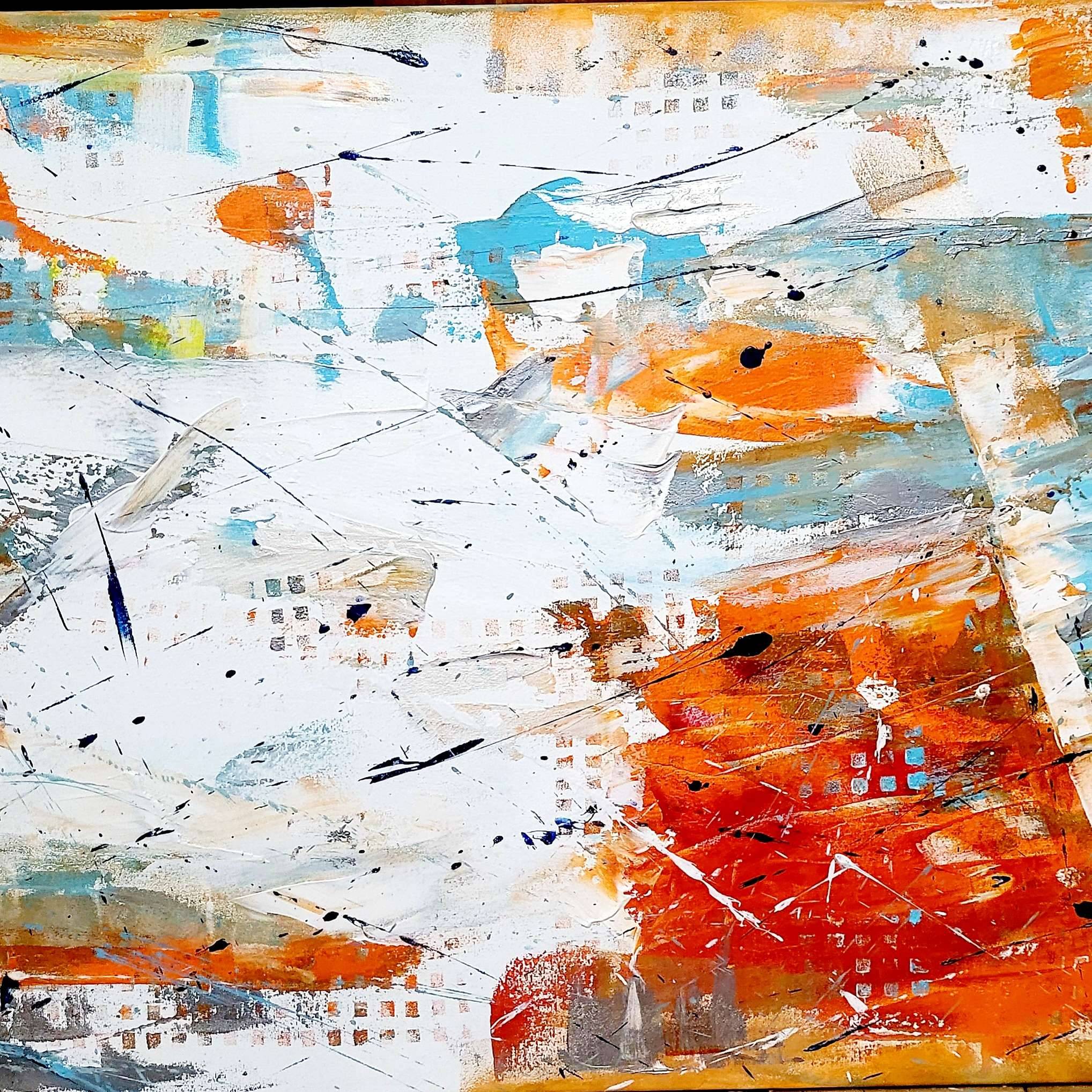 Obraz emanuje dynamiczną energią dzięki połączeniu intensywnych kolorów jak pomarańcz, błękit i biel, które wirują niczym żywiołowa burza. Kształty są abstrakcyjne, nieokreślone, przyciągają wzrok chaotycznymi liniami i plamami, które zdają się być rozrzucone z premedytacją. Atmosfera jest nieco burzliwa, lecz kipiąca twórczym chaosem, co sprawia, że czujemy, jakbyśmy stali w samym środku artystycznego "hurricane". Dzieło jest znakomitym przykładem abstrakcyjnego ekspresjonizmu, pełne gestów i spontaniczności, z widocznymi śladami impastu i smugą pędzla. Aż chce się krzyknąć, że te plamy to tańczące duchy koloru! Artysta dał się ponieść emocjom, co momentami daje odczucie zagubienia, ale to chyba dobrze. Wywołuje to mieszankę zachwytu i konsternacji, jakbym próbował znaleźć jakąś ukrytą historię, schowaną za tym chaosem. Dzieciak by powiedział: "To trochę jak poplątana mapa skarbów!" Błękitne tony jak ocean, a pomarańczowe niczym płomień, rywalizują między sobą, tworząc kontrast, który dodaje dziełu głębi. Feel the colors krzyczą do nas, a my, patrząc na to dzieło, czujemy coś na kształt nostalgicznej tęsknoty za nieznanym. Im dłużej patrzymy, tym bardziej zaskakują nas nowe szczegóły i niuanse ukryte w tej abstrakcyjnej układance.