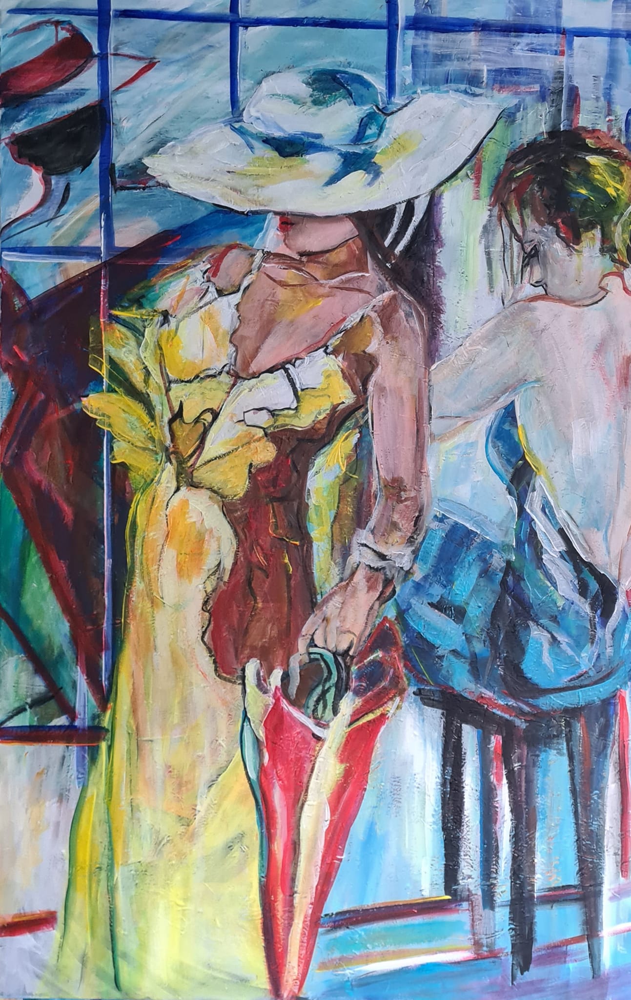 Obraz przedstawia dwie kobiety w letnich strojach. Dominuje feeria barw: ciepły żółć i spokojny niebieski z akcentami czerwieni. Te kolory kontrastują, tworząc dynamiczną kompozycję. Jedna z kobiet, w kapeluszu, wyróżnia się elegancją. Nieco na boku znajduje się parasol, co dodaje uroku całości. Atmosfera jest pełna wakacyjnego luzu. Tacy chill wprost bije z tej sceny. Styl to coś jakby impresjonizm z nutką ekspresji. Pociągnięcia pędzla są wyraźne, prawie można poczuć ich fakturę pod palcami. Wywołuje to pewną tęsknotę za latem, słońcem. Czujemy swobodę, lekkość bytu. Może nawet przypomina nam nasze własne wakacyjne wspomnienia. Dziecko mogłoby powiedzieć: "Te panie wyglądają, jakby czekały na super przygodę!" i coś w tym jest. Artysta ujął moment, w którym świat na chwilę się zatrzymał. A te emocje? Mieszanka zapatrzenia i zadumy. Taki obraz, który leciutko zmusza do refleksji nad codziennością. Z jednej strony czujemy spokój, ale z drugiej jakąś dziwną energię. "Wow," pomyślałem, patrząc pierwszy raz. Lekkość, swoboda i coś trudnego do uchwycenia, co sprawia, że nie możemy oderwać wzroku. Te wszystkie elementy tworzą atrakcyjną opowieść bez słów. Jakbyśmy byli świadkami sceny z czyjegoś życia, zmrożonej na płótnie.